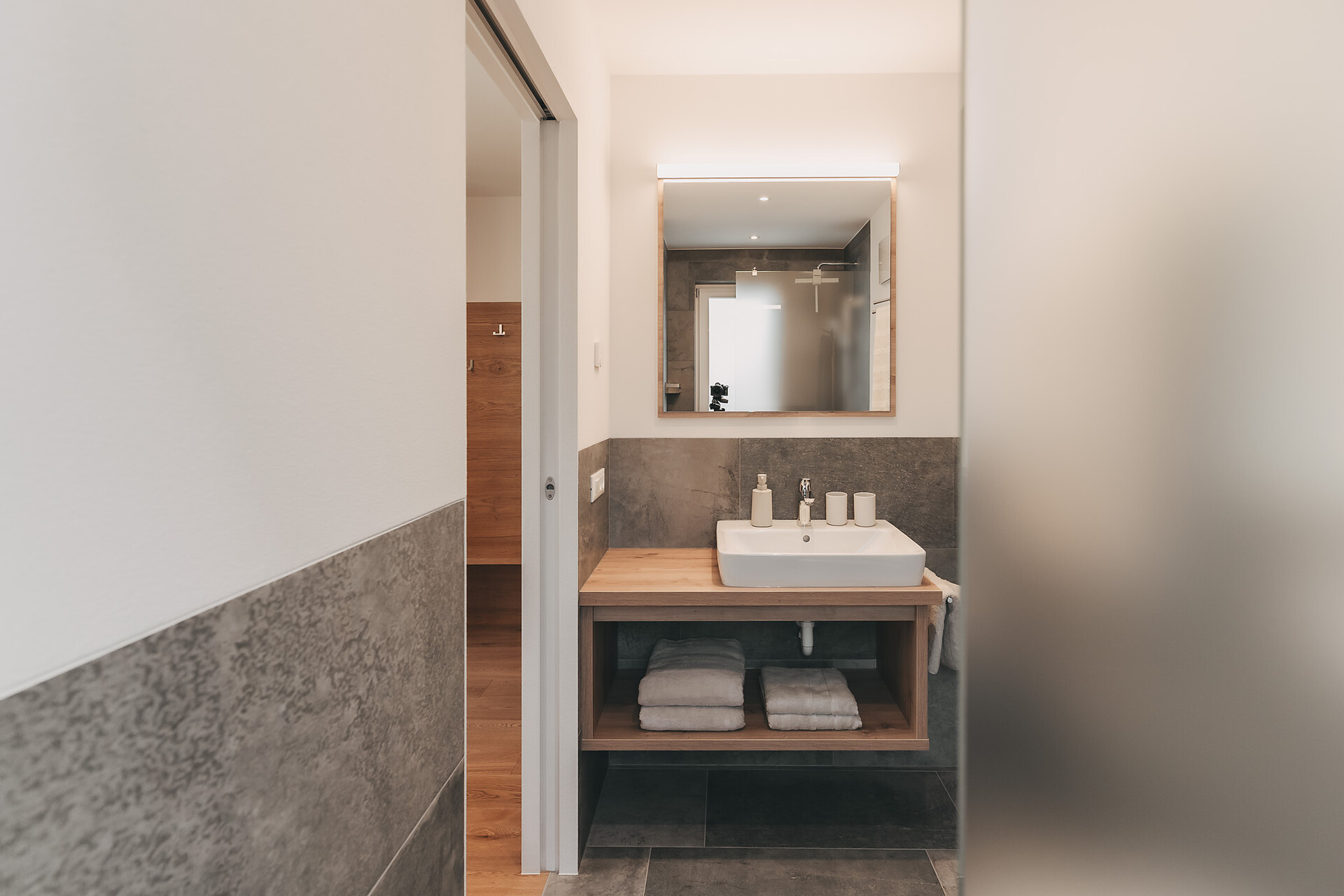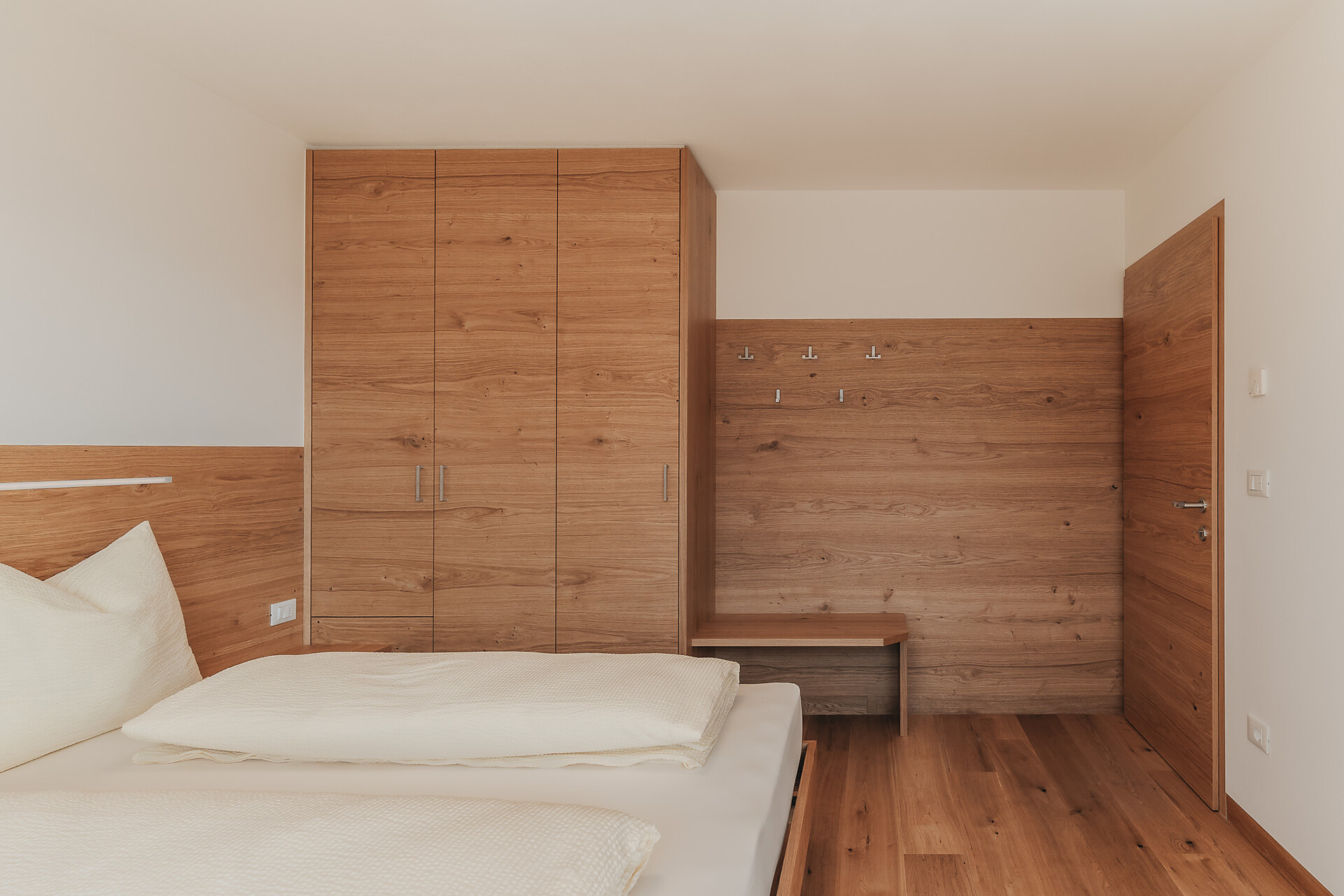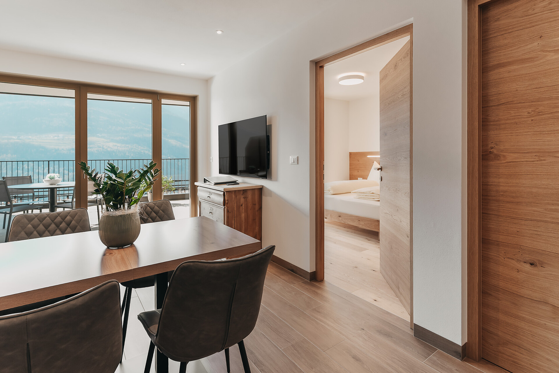 The high-quality, stylish and naturally furnished holiday flat offers a living area with a pull-out sofa bed, a fully equipped kitchen, two bedrooms, two bathrooms and a covered balcony (14 m²) with a fantastic view. All rooms, except the bathrooms and the second bedroom, face south.