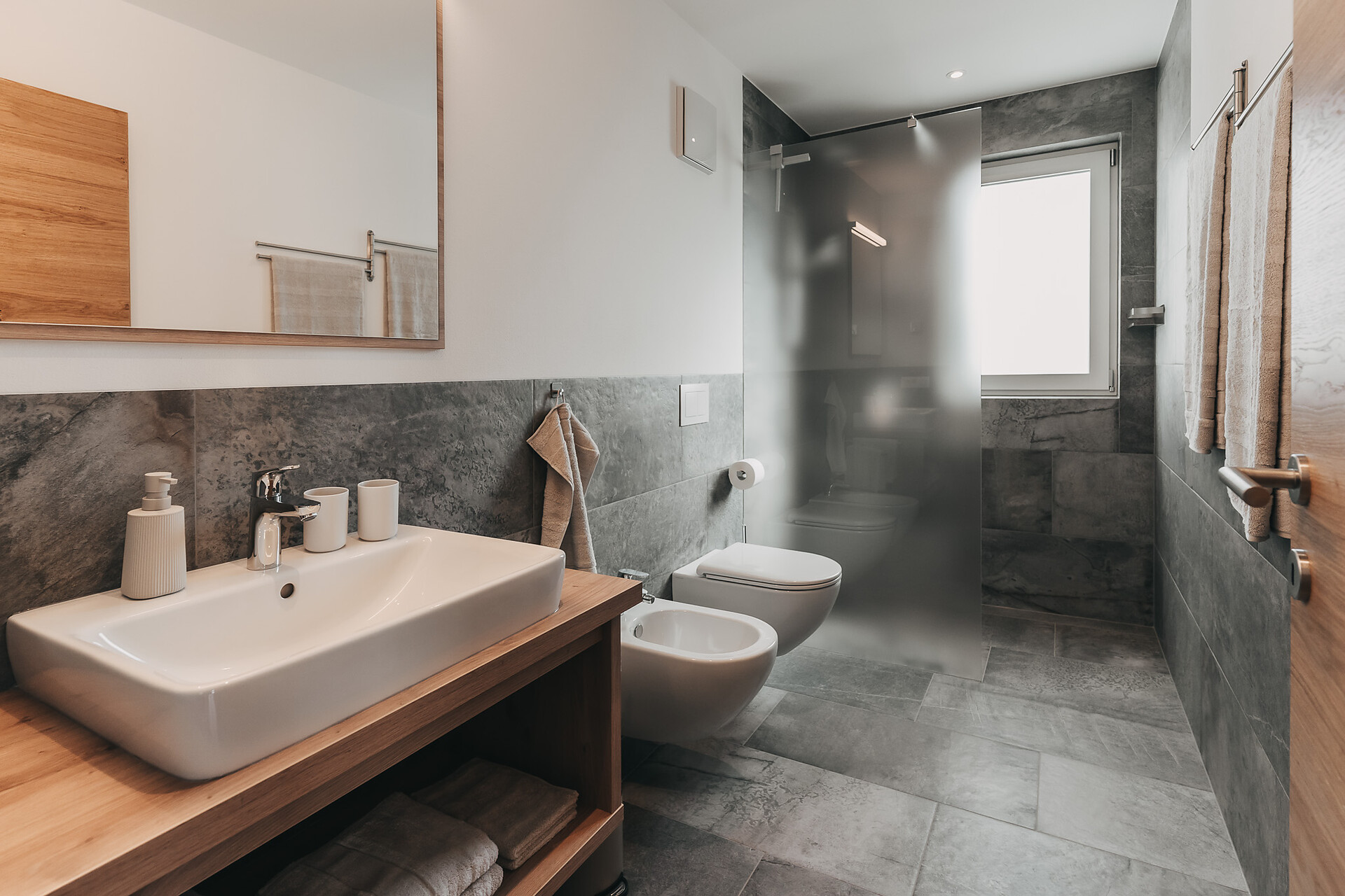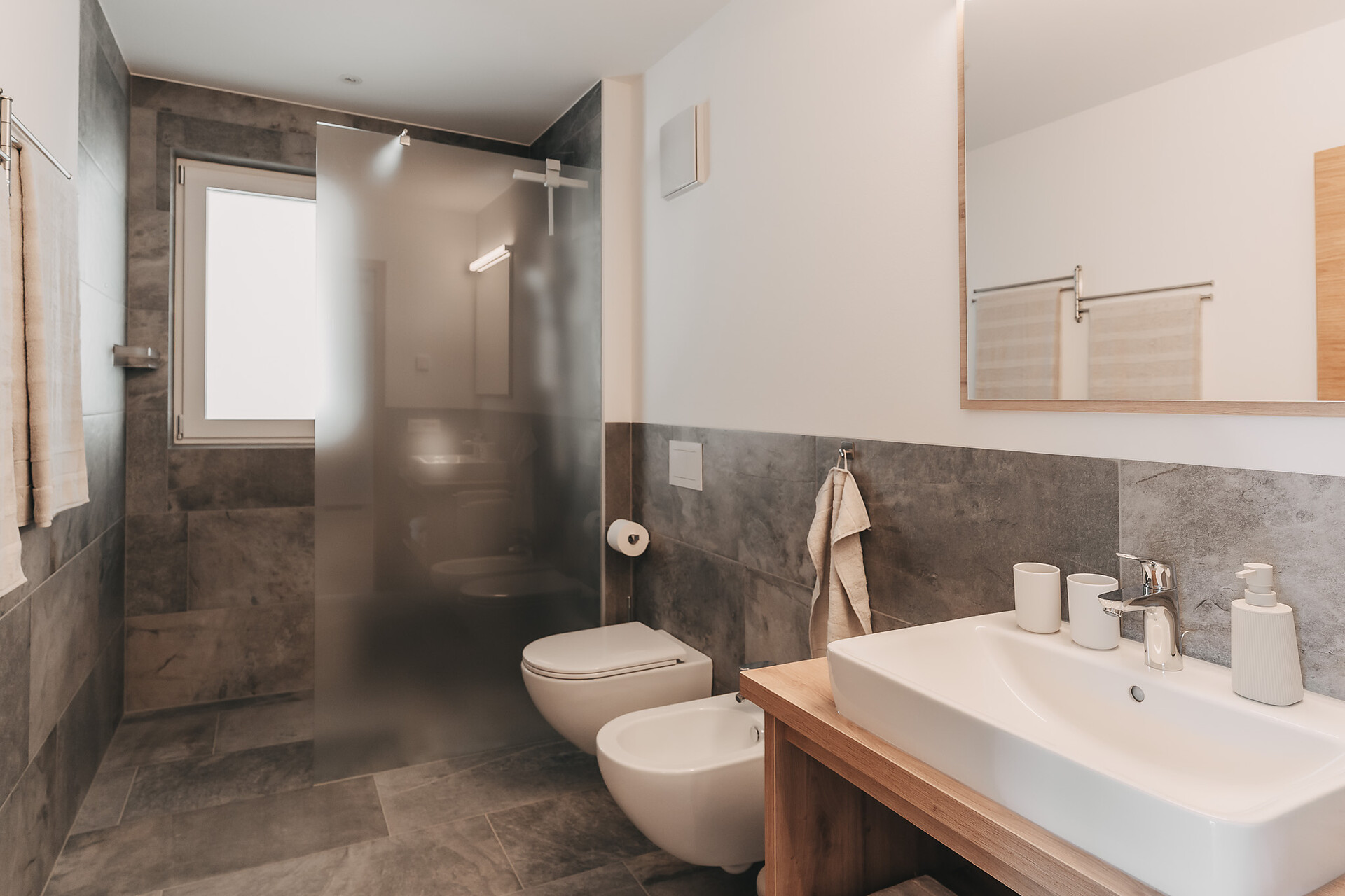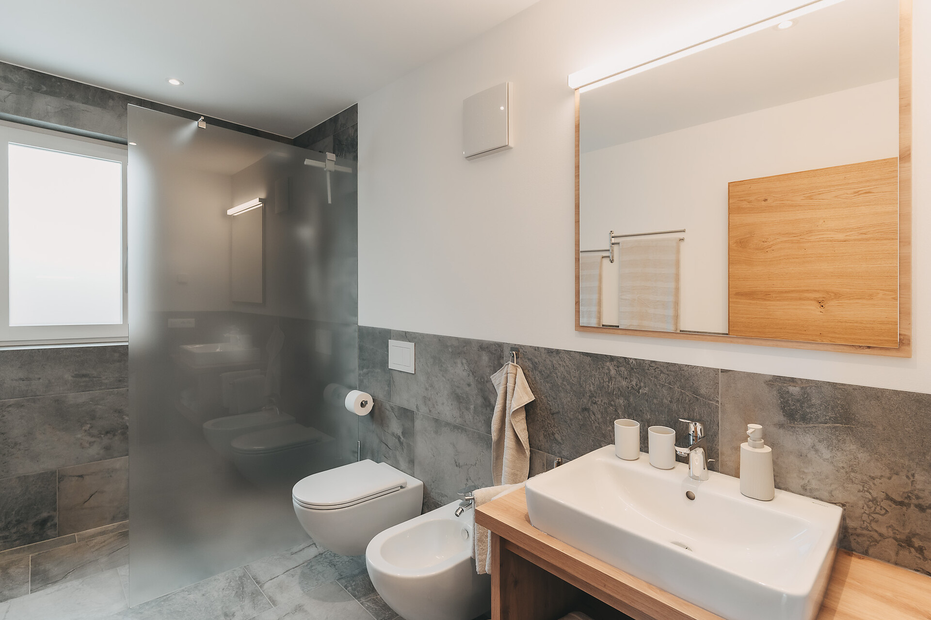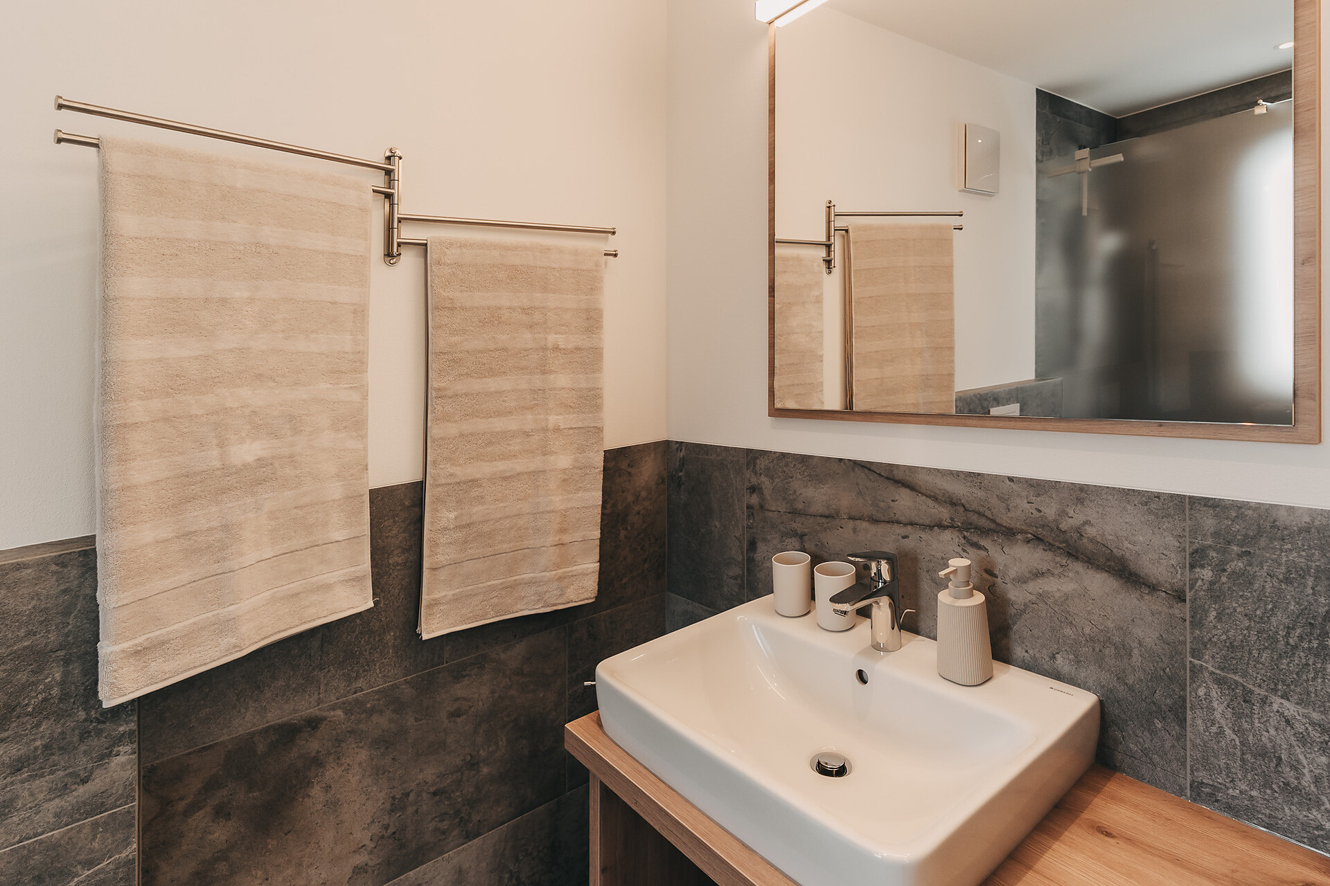 The high-quality, stylish and naturally furnished holiday flat offers a living area with a pull-out sofa bed, a fully equipped kitchen, two bedrooms, two bathrooms and a covered balcony (14 m²) with a fantastic view. All rooms, except the bathrooms and the second bedroom, face south.