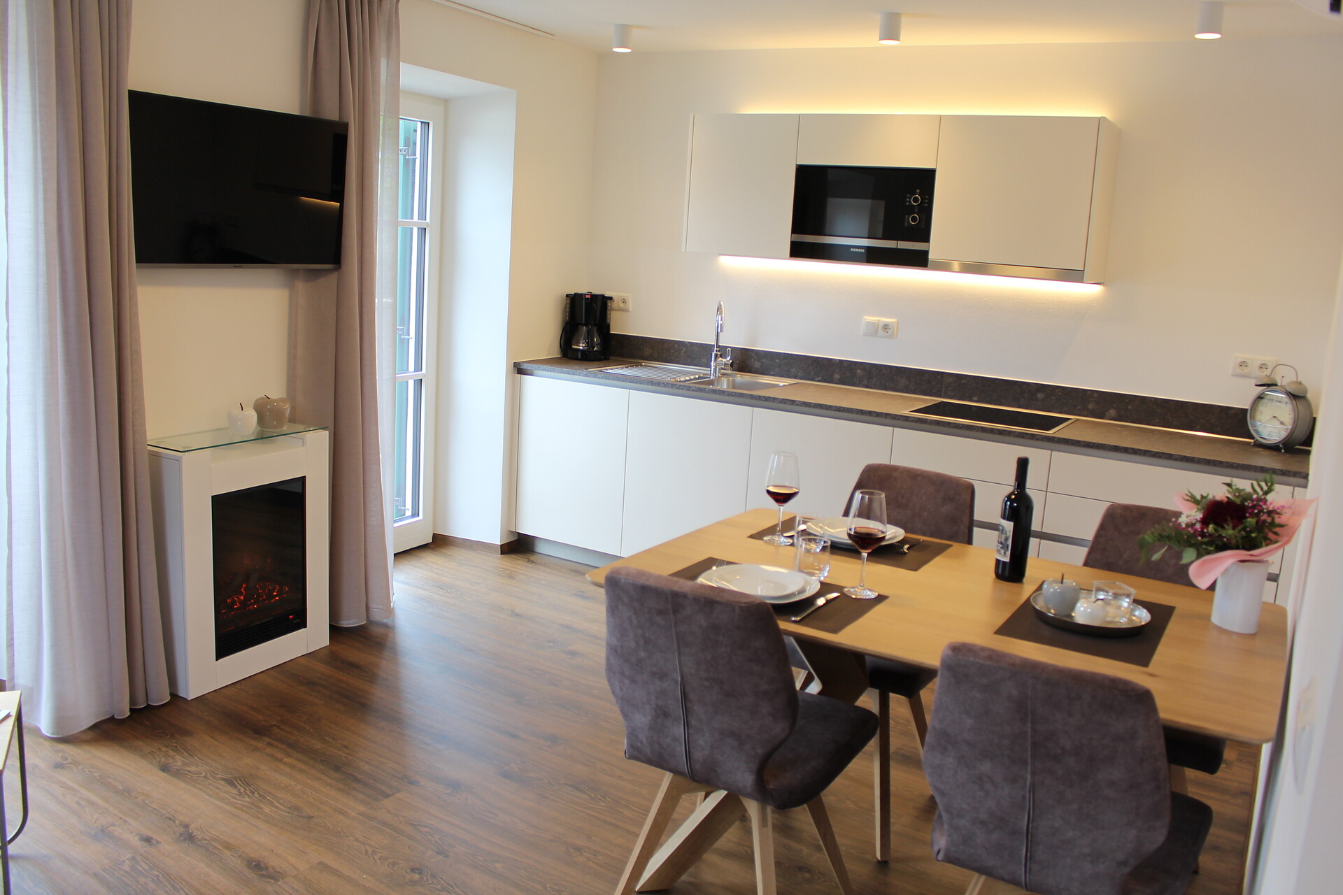 Double bed , Cot, Double sofa bed, Terrace, Air conditioning, Separate living area, Bed linen provided, Safe, Non-smoking apartment, Separate kitchen, Coffee machine, Dishwasher, Electric cooker, Microwave, Cutlery provided, Hob, Water boiler, Oven, Shower/Bath tub, Bidet, Hair dryer, Bathrobe, Towels, Apartment with sauna, Apartment with infrared cabin , TV, Satellite/Cable, WLAN, Internet access, Cleaning upon request, Final cleaning included, Season rental possible, Main building, Panoramic view, South view