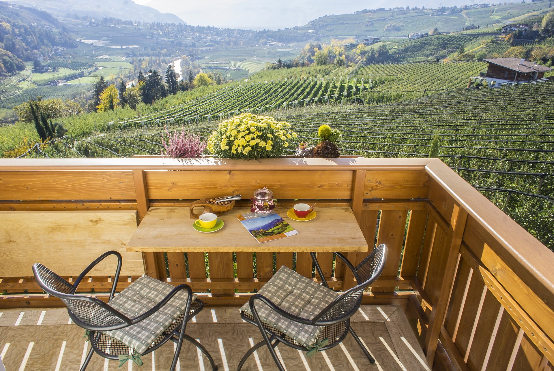 Another very spacious attic apartment with two balconies; 3 separate rooms with connecting doors (bedroom, bathroom, eat-in kitchen). The apartments are furnished with natural wood furniture and have a unique panoramic view. Bed linen and towels as well as all kitchen and household equipment are provided. An additional double room with its own bathroom/WC/panoramic balcony/safe/SAT-TV/WLAN can be rented in addition to all apartments.