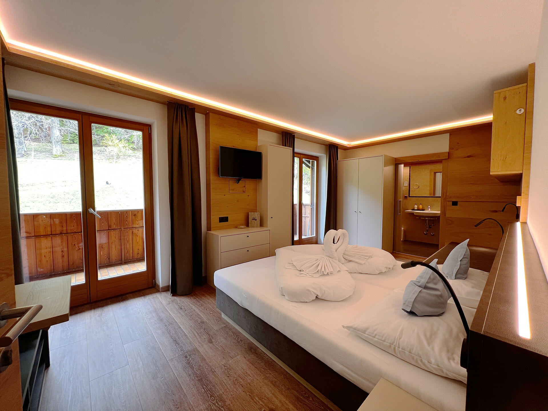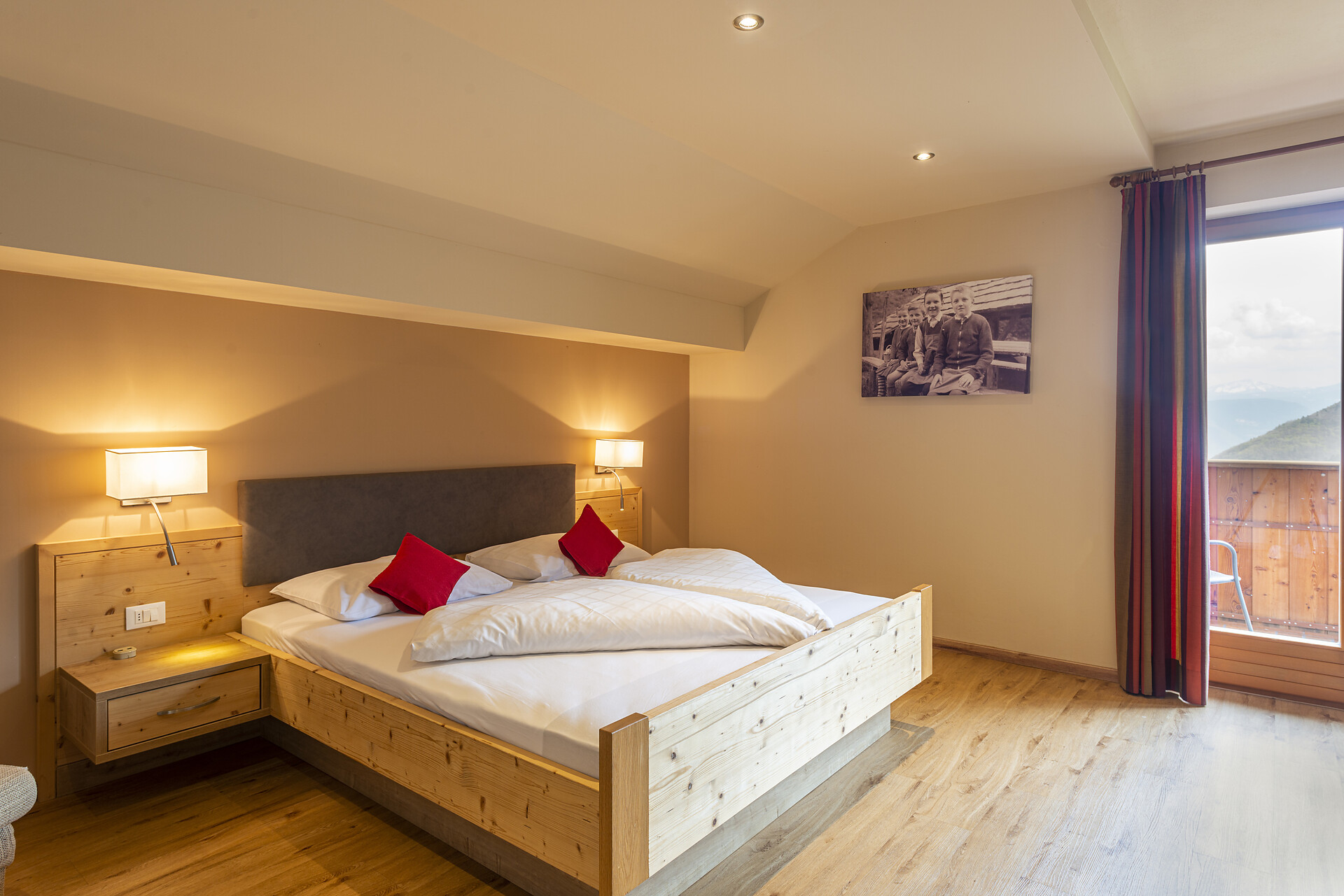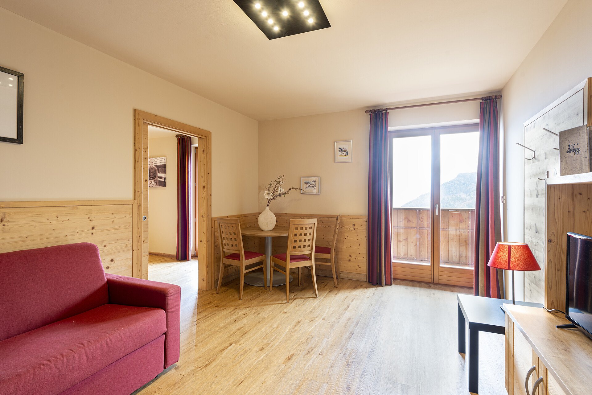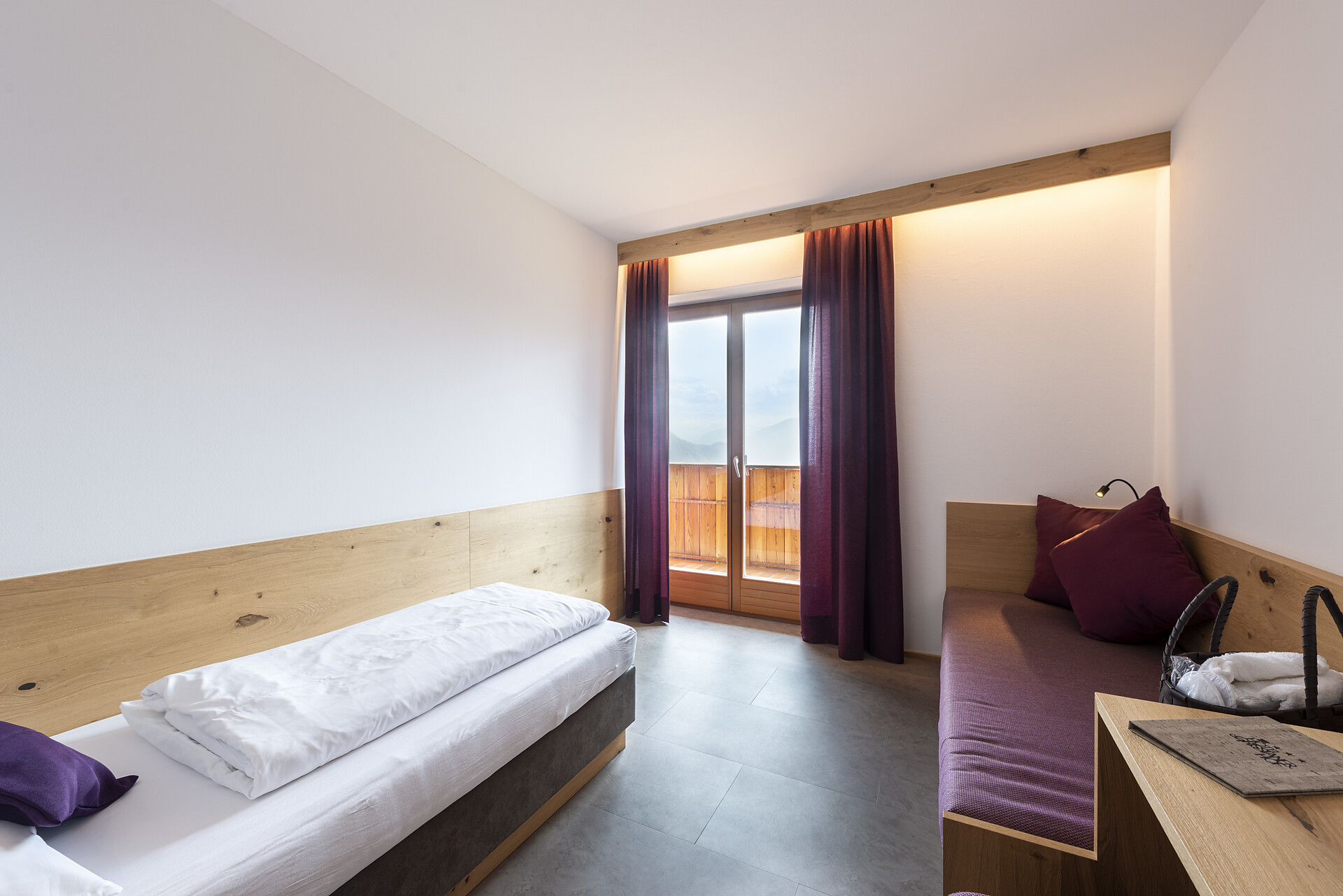 Doccia, bidet, WC, telefono, cassetta di sicurezza, schermo piatto con TV-Sat, balcone esposto a sud con vista sulle Dolomiti, la valle dell'Adige e Bolzano, diviso zona notte-giorno, ideale come camera per famiglie (max. 5 pers.)