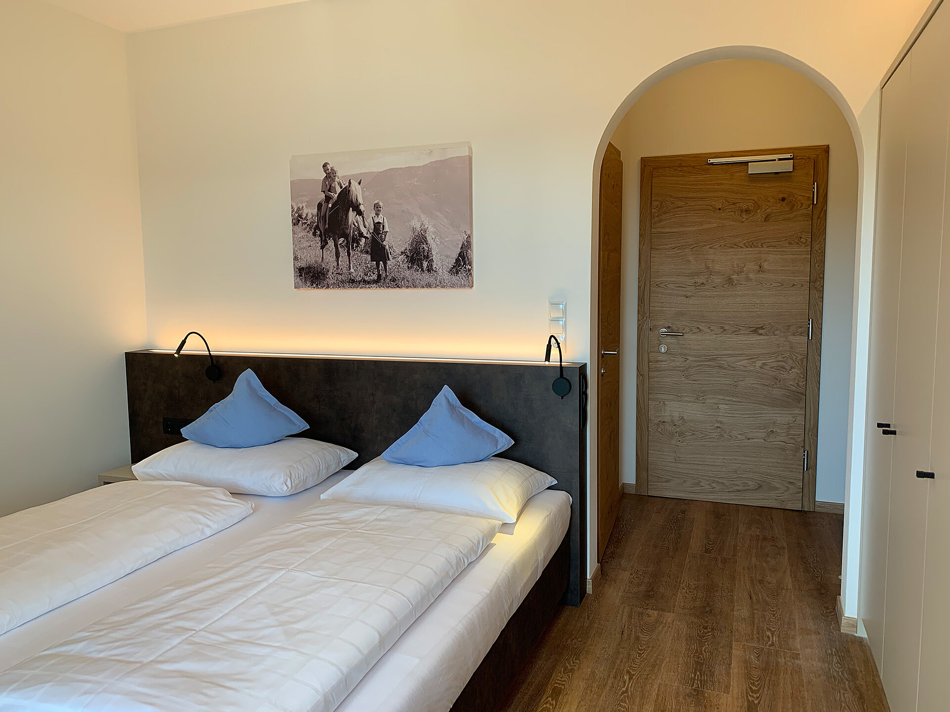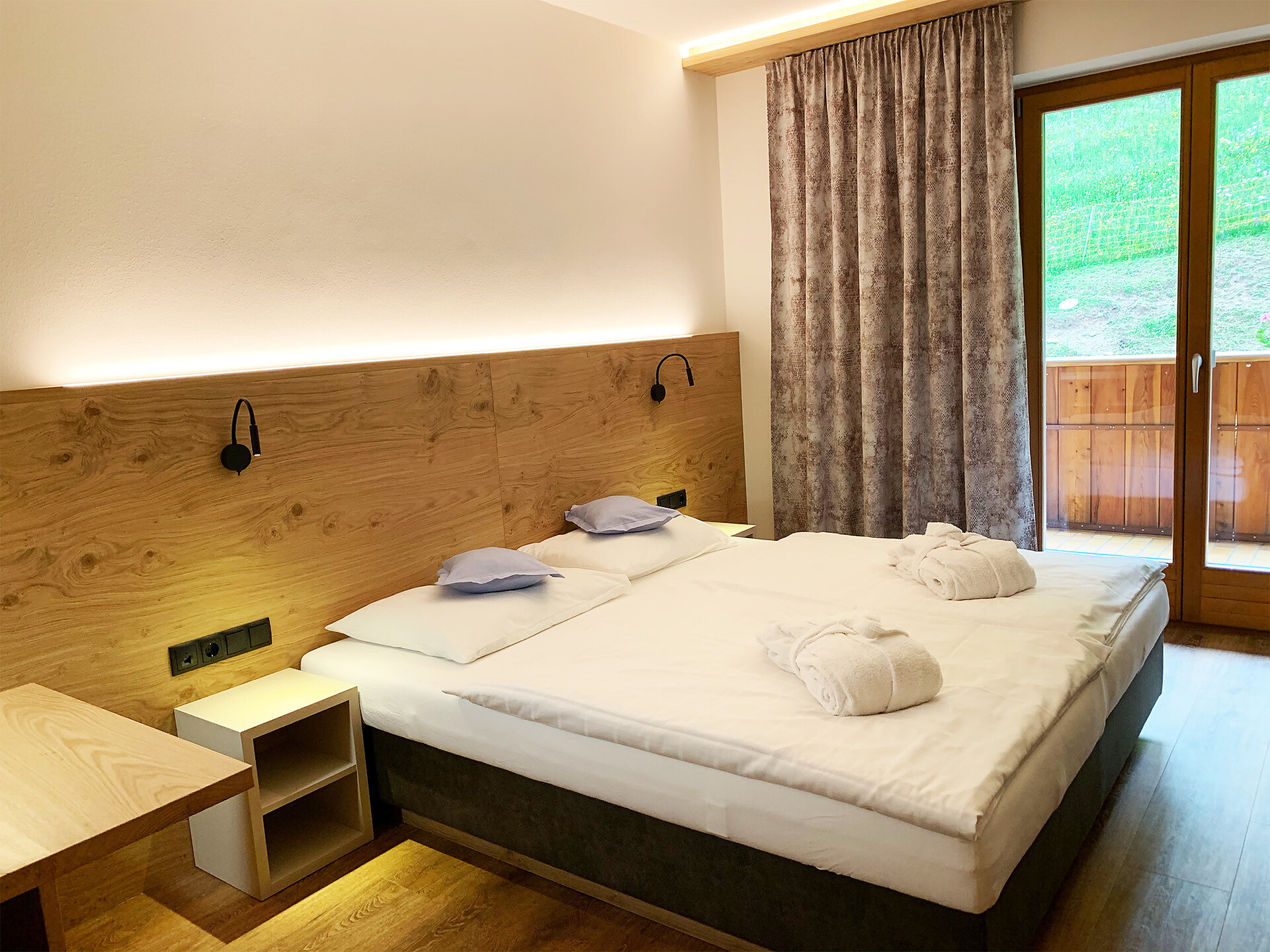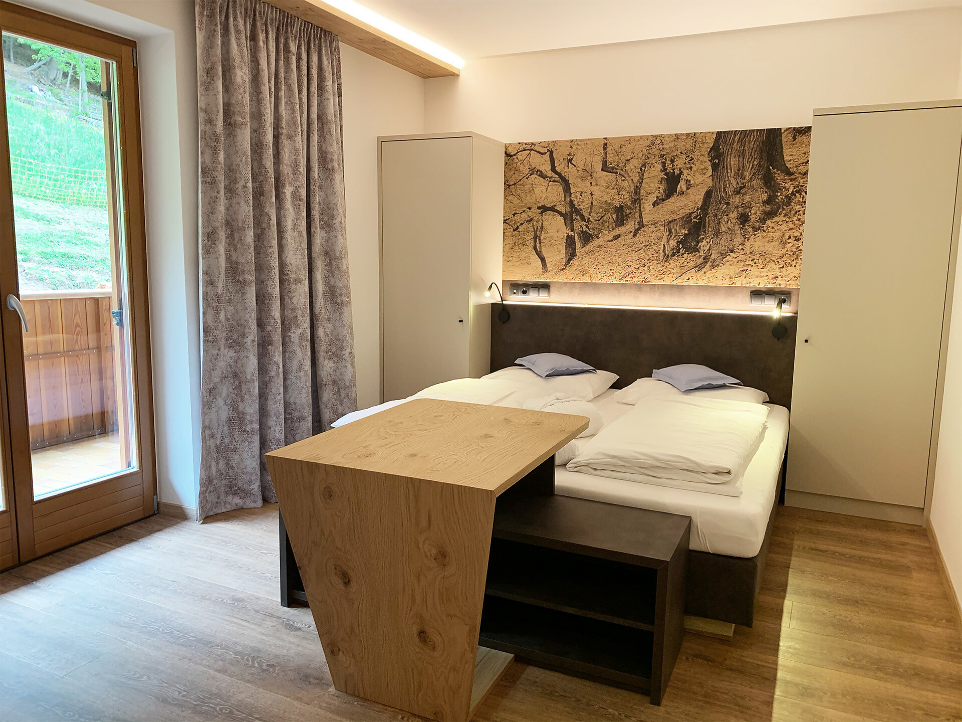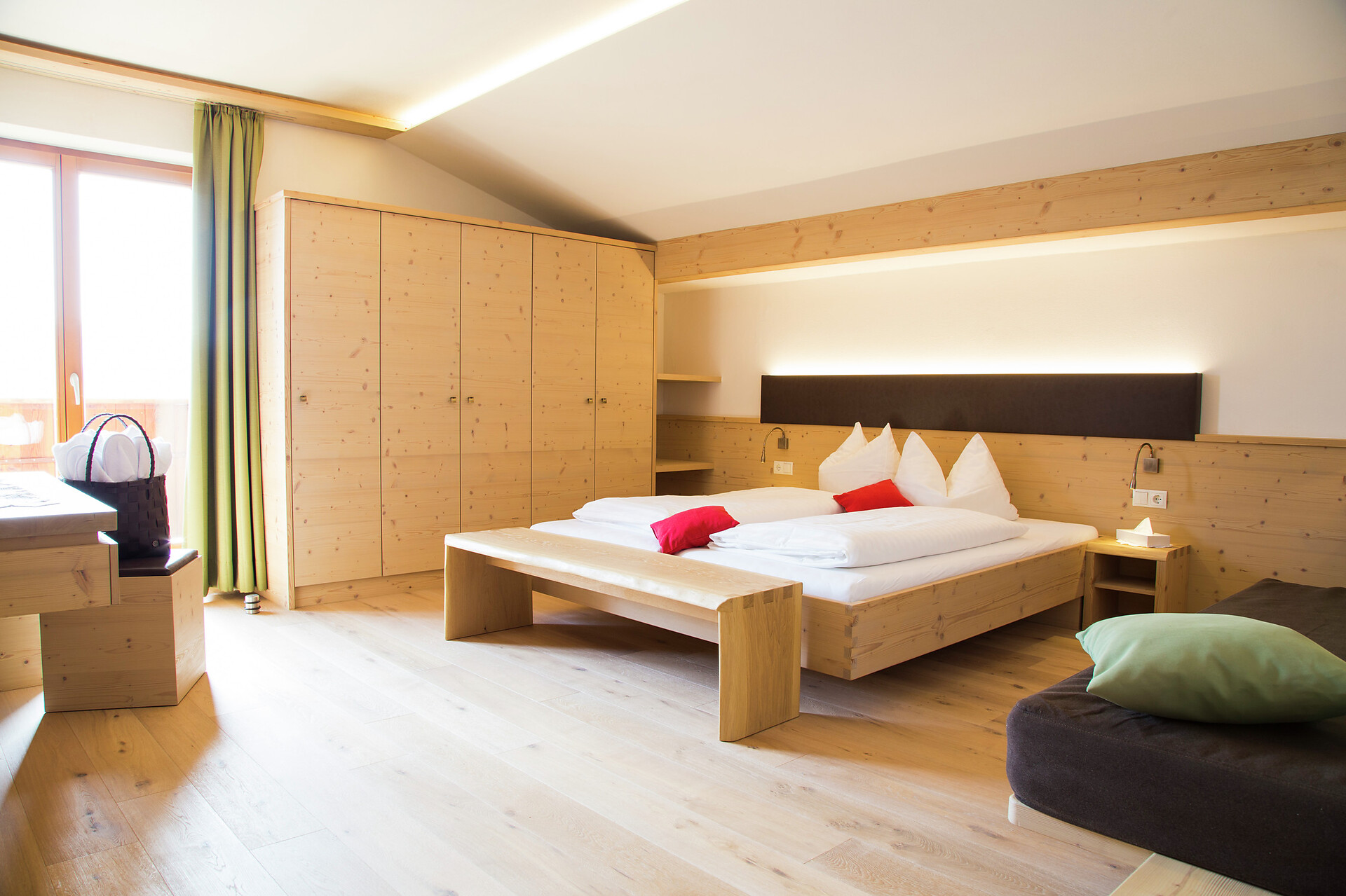 Doccia, bidet, WC, telefono, cassetta di sicurezza, schermo piatto con TV-Sat, balcone esposto a sud con vista sulle Dolomiti, la valle dell'Adige e Bolzano, diviso zona notte-giorno, ideale come camera per famiglie (max. 5 pers.)