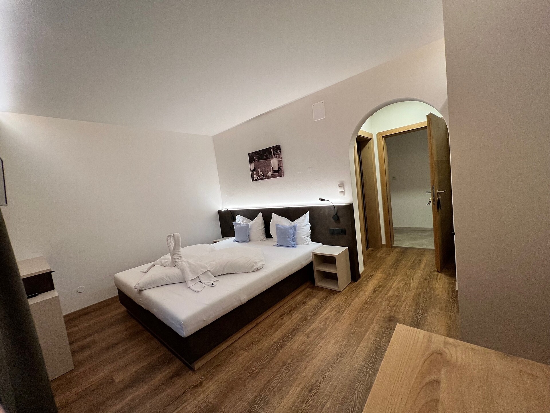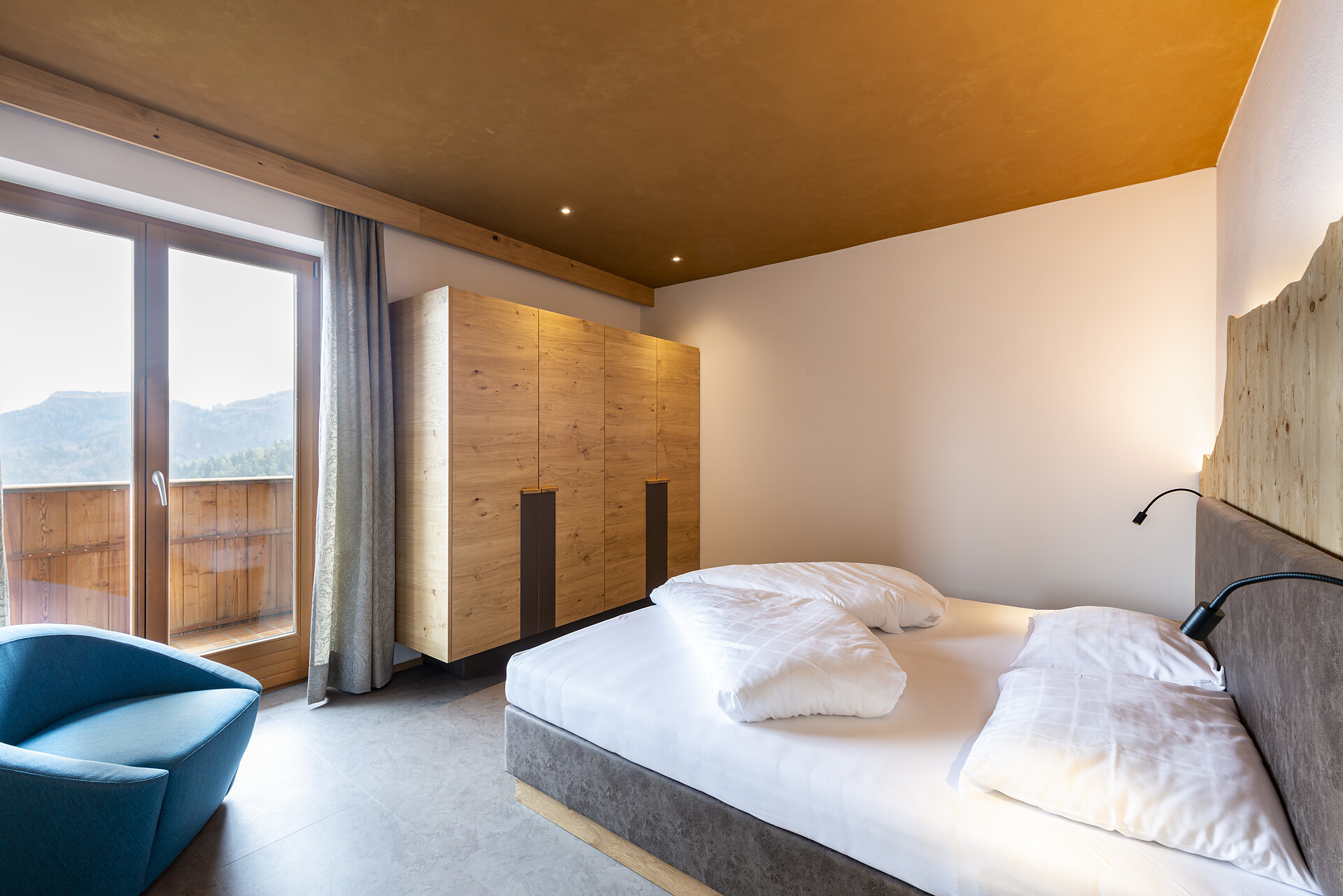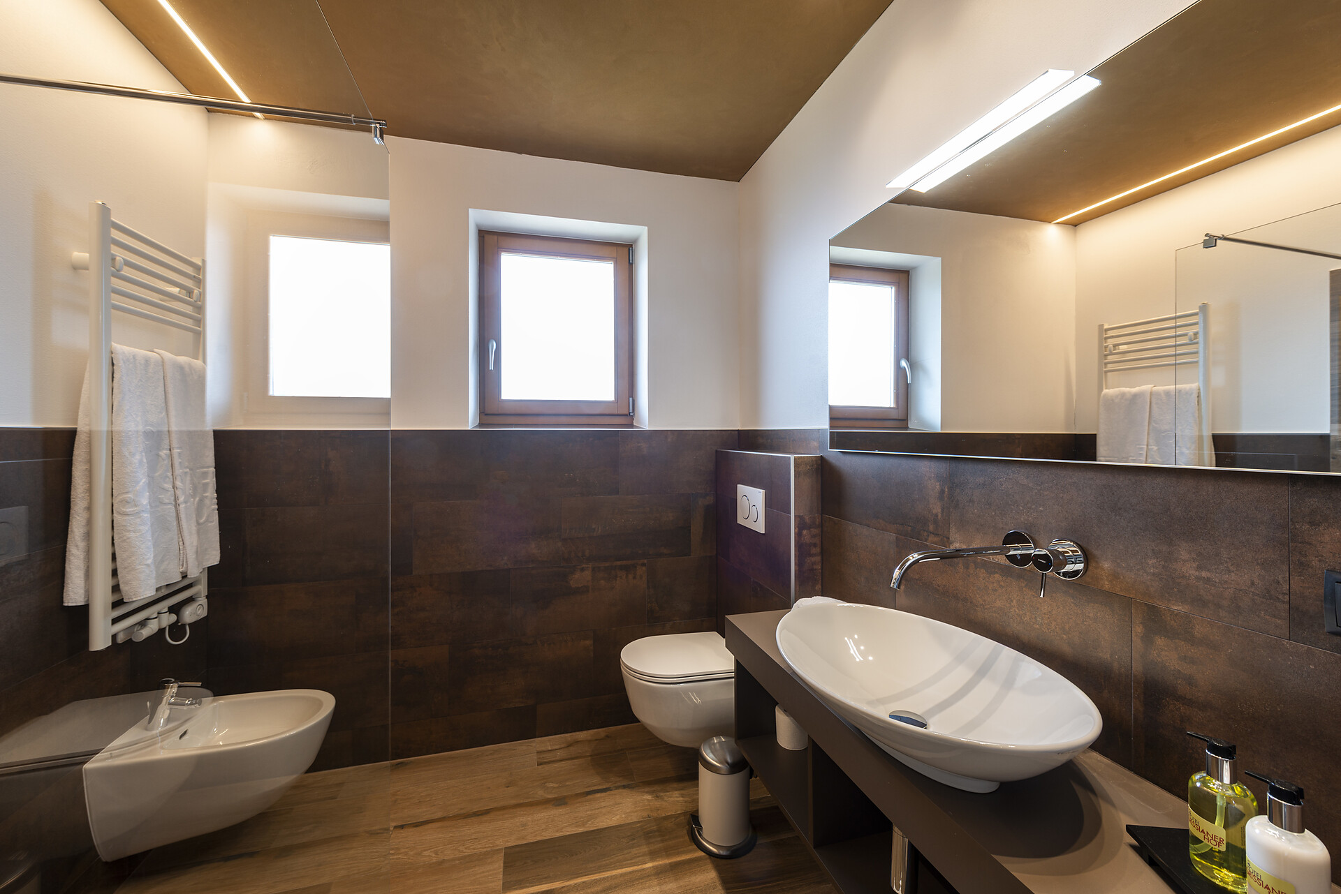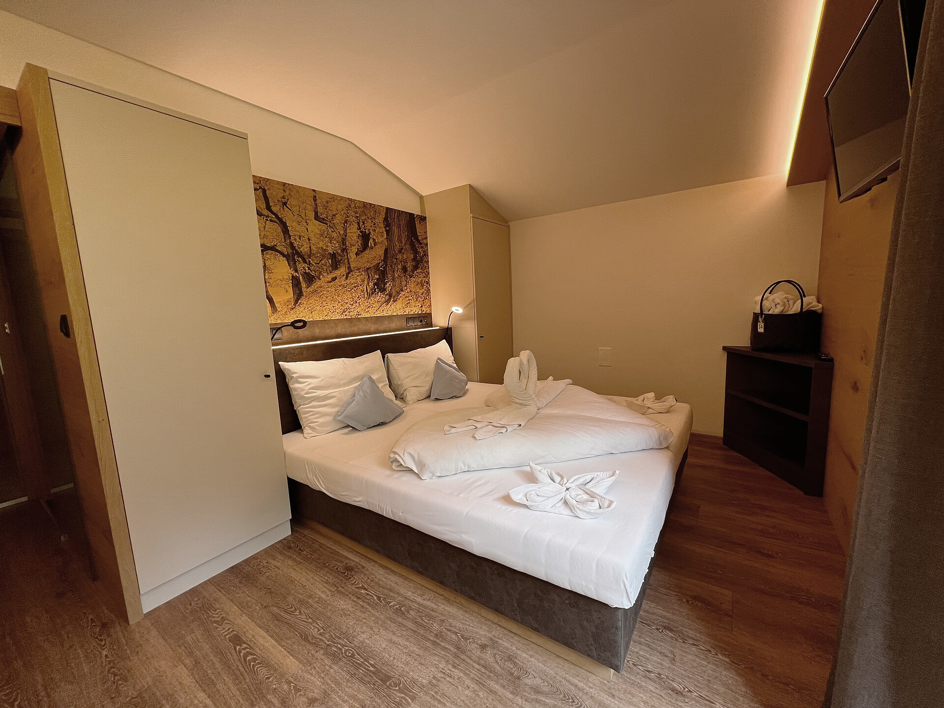 Doccia, bidet, WC, telefono, cassetta di sicurezza, schermo piatto con TV-Sat, balcone esposto a sud con vista sulle Dolomiti, la valle dell'Adige e Bolzano, diviso zona notte-giorno, ideale come camera per famiglie (max. 5 pers.)