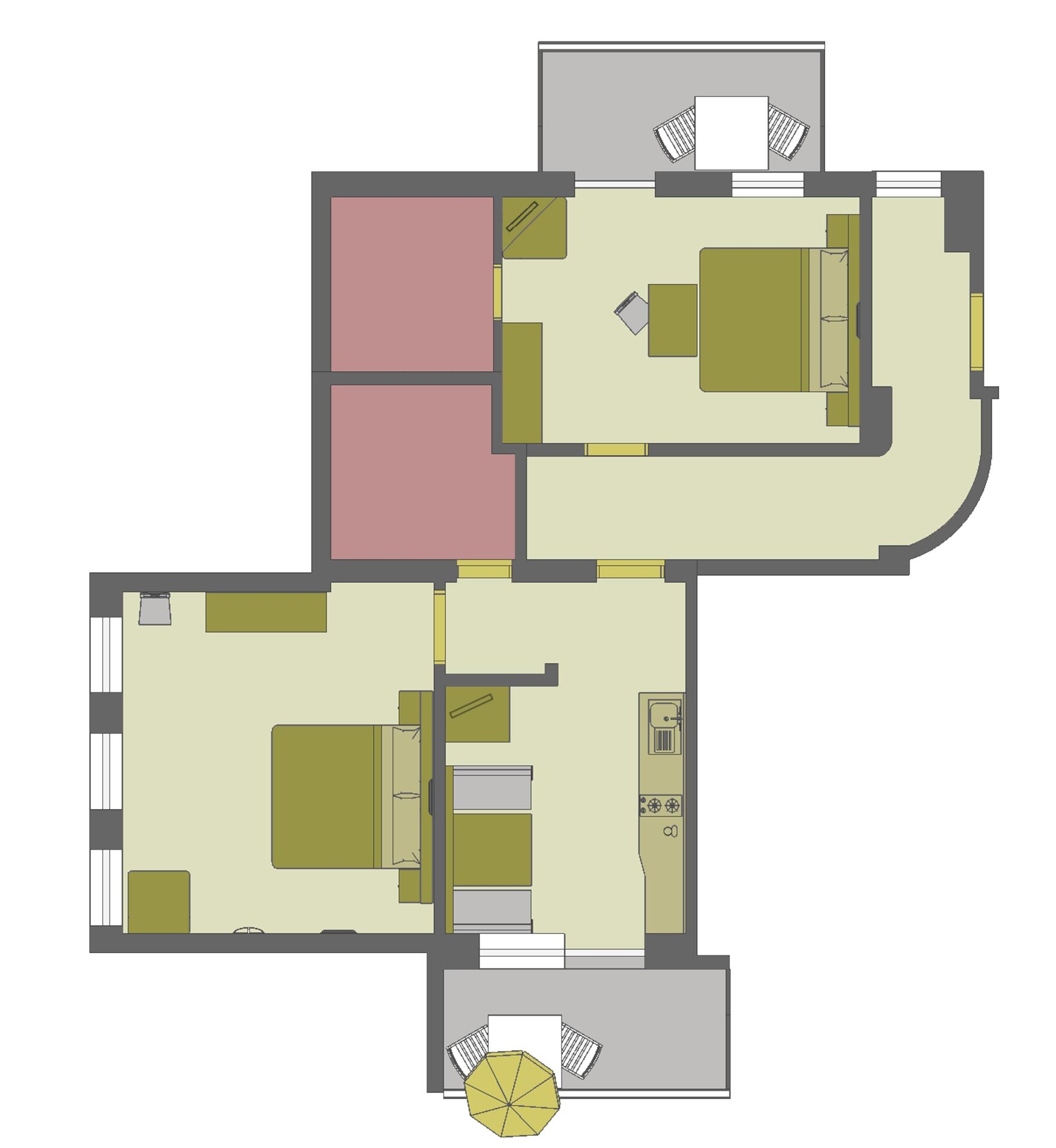 Double bed , Sofa bed, Balcony, Separate living area, Bed linen provided, Safe, Non-smoking apartment, Separate kitchen, Coffee machine, Electric cooker, Microwave, Cutlery provided, Hob, Water boiler, Shower/Bath tub, 2 or more bathrooms, Bidet, Hair dryer, Towels, Washing machine in the apartment, TV, Satellite/Cable, WLAN, Cleaning upon request, Final cleaning included, Main building, Panoramic view, South view