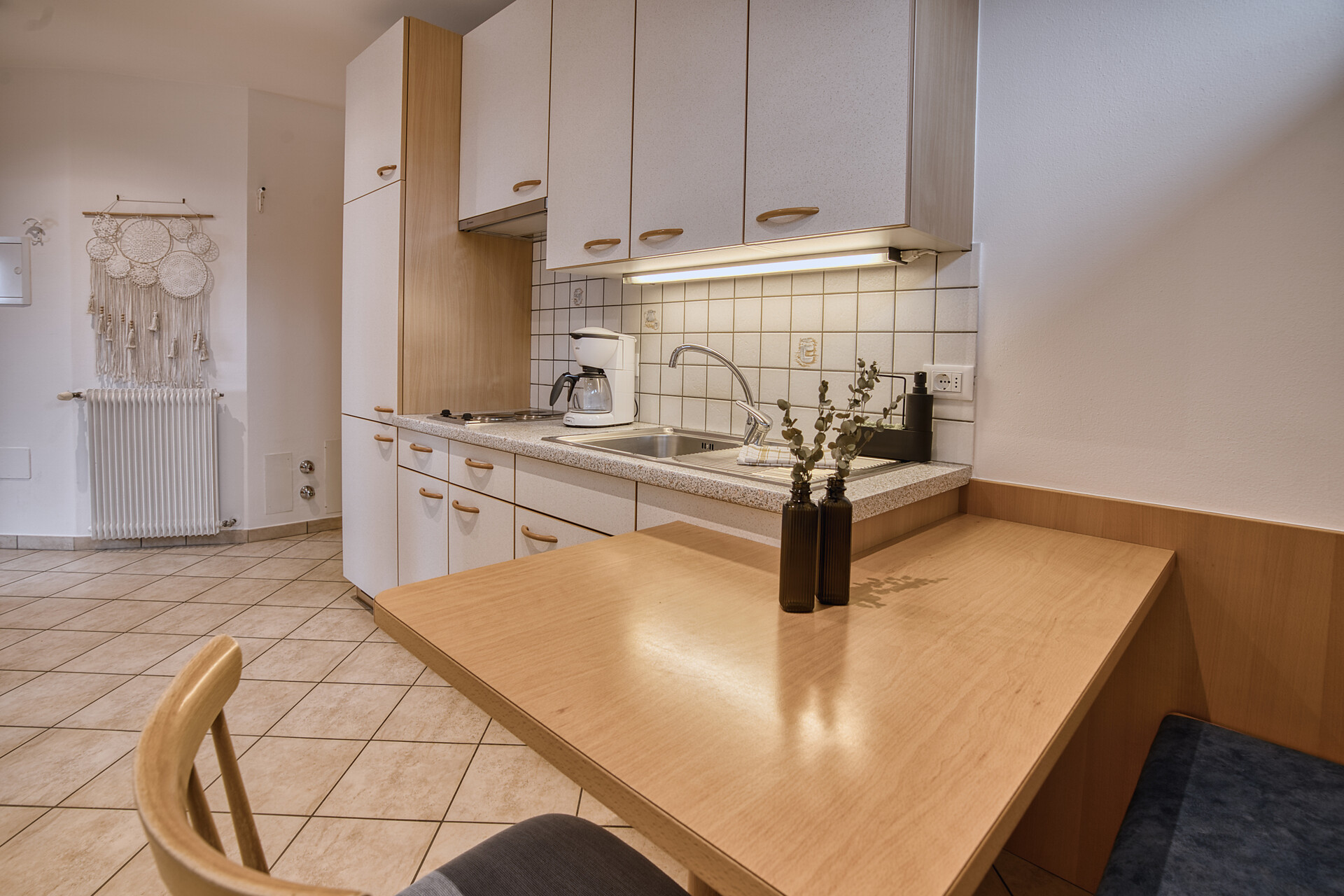• A fully equipped kitchen (refrigerator, microwave, two-plate cooktop, kettle, egg cooker, toaster, citrus juicer, German coffee machine, moka pot, dishes, tea towels) with dining table