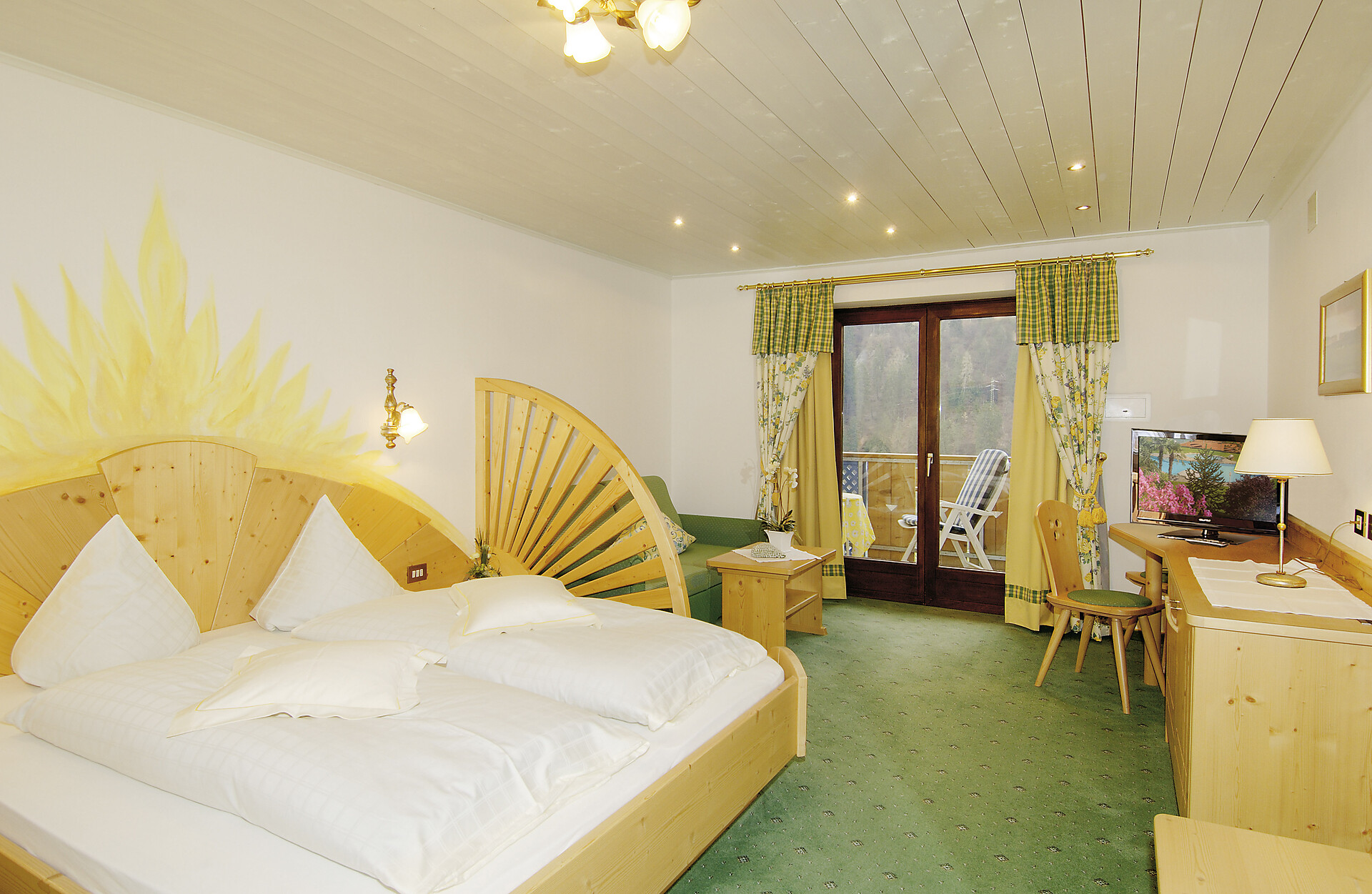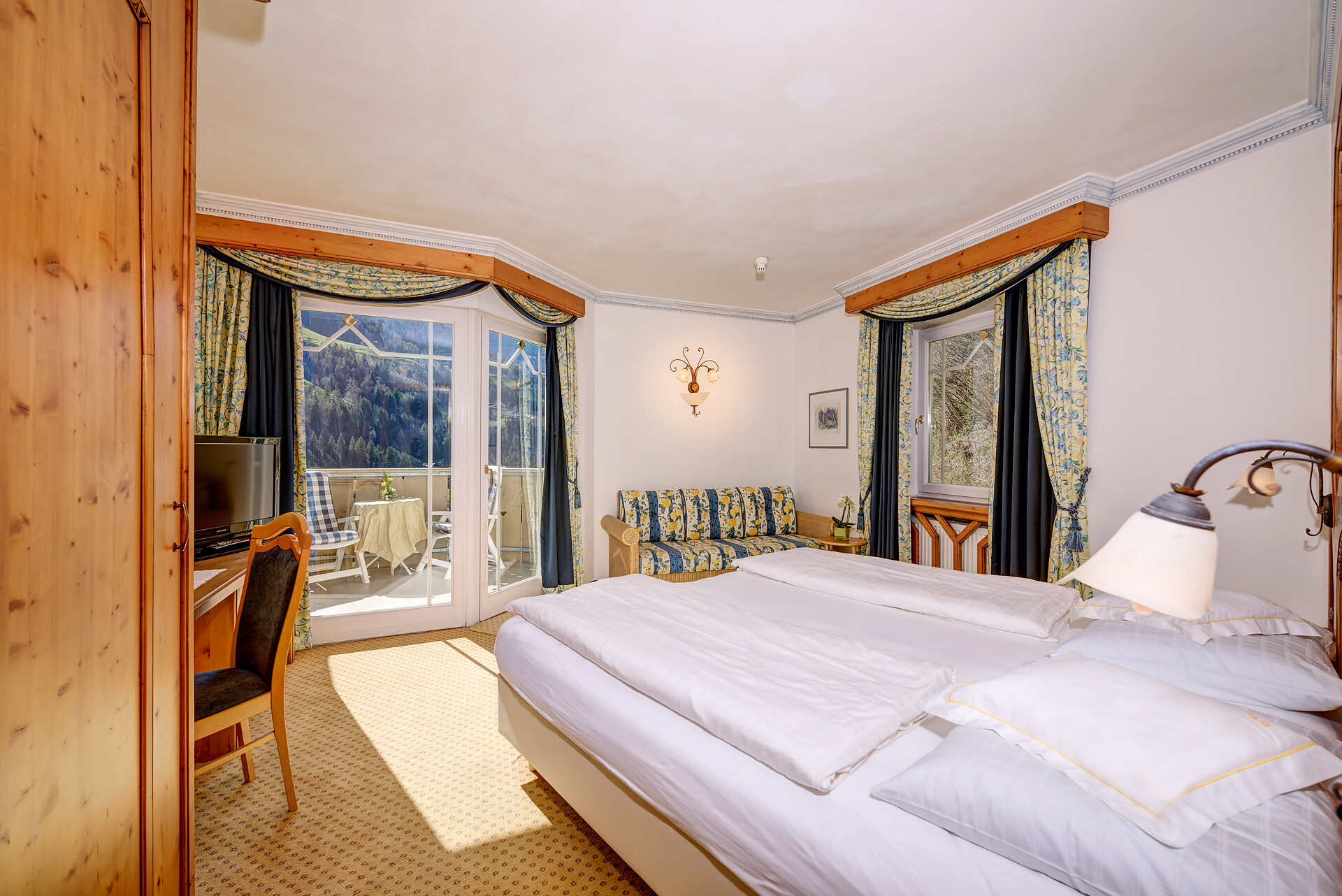 Double room, Multi-bed room, Double bed , Extra bed, Cot, Balcony, Living area, Handicapped accessible, Safe, Shower / Bath tub, Bathrobe, TV, Satellite/Cable, Main building, South view