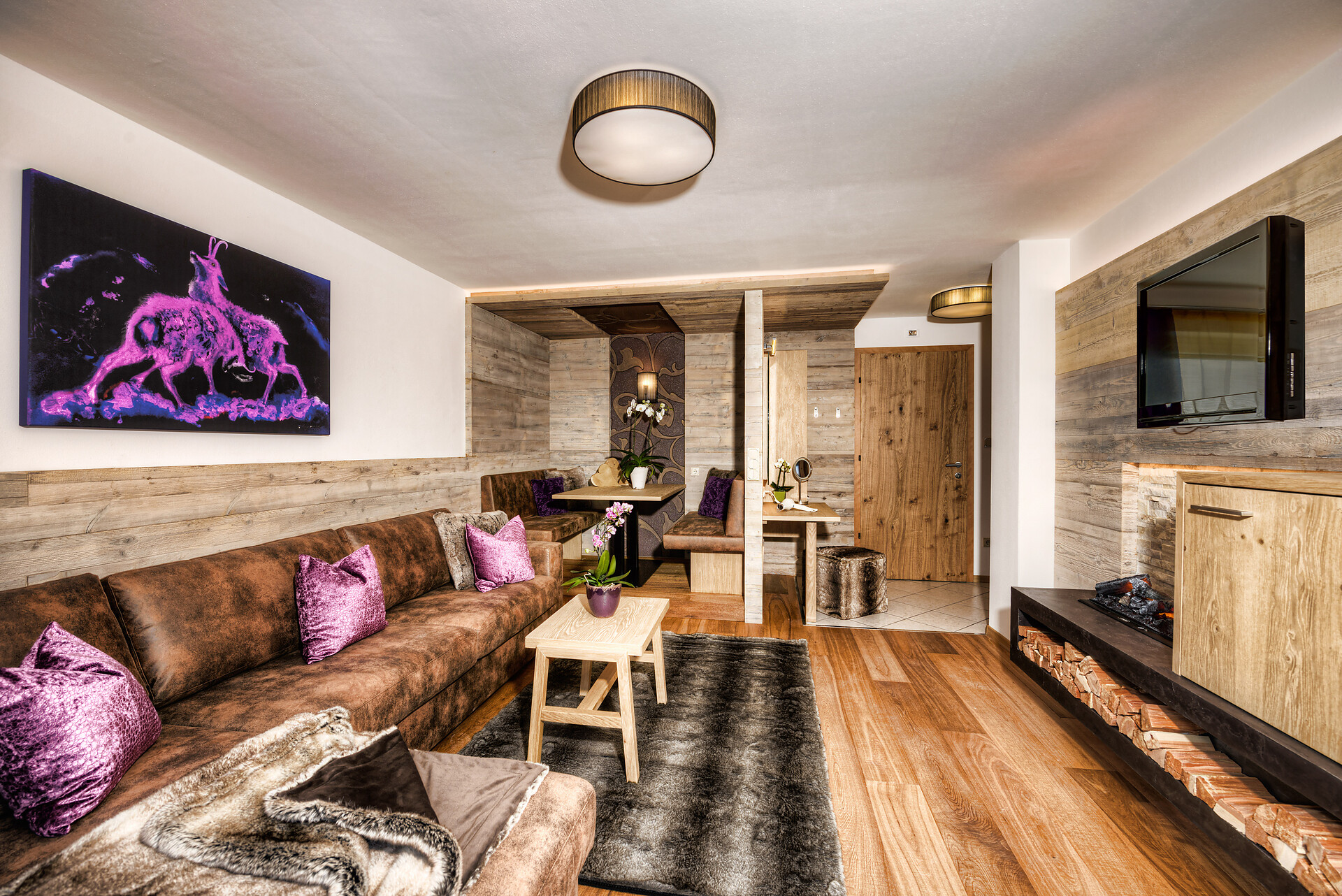Vital Suite (2-4 guests) - ca. 87m², including 27m² balcony or terrace as the case may be, honeymoon suite in maple with separate bedroom, open fireplace wiht relaxation lounger, Espresso machine, open bathroom wiht infra-red cabin, whirl tub and make-up corner, starry sky
