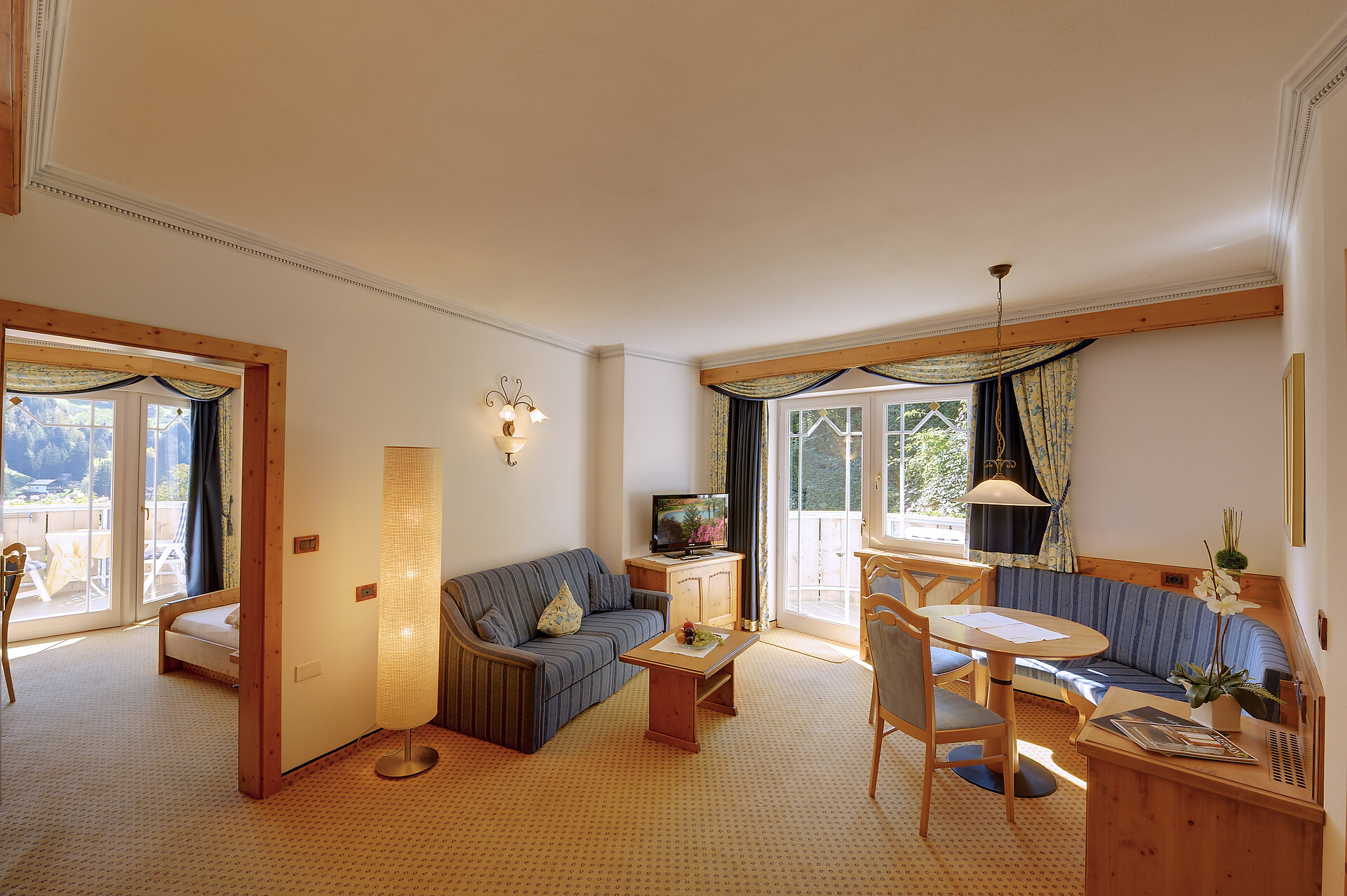 Multi-bed room, Suite, Double bed , Cot, Balcony, Living area, Kitchenette, Mini-bar, Safe, Tea/Coffee machine, Shower / Bath tub, Separate WC, Hair dryer, Bathrobe, TV, Satellite/Cable, WLAN, Hotel annex, Panoramic view