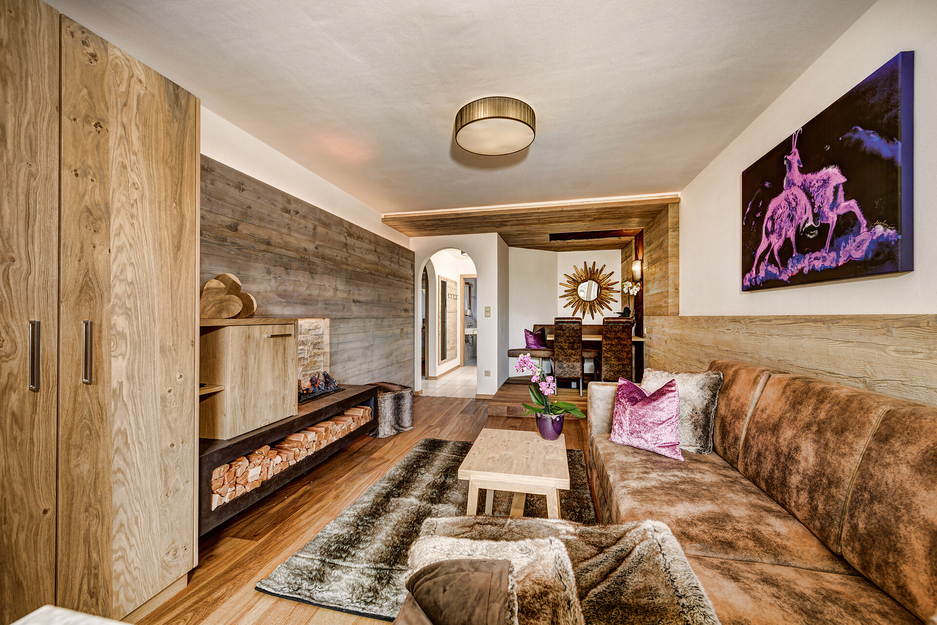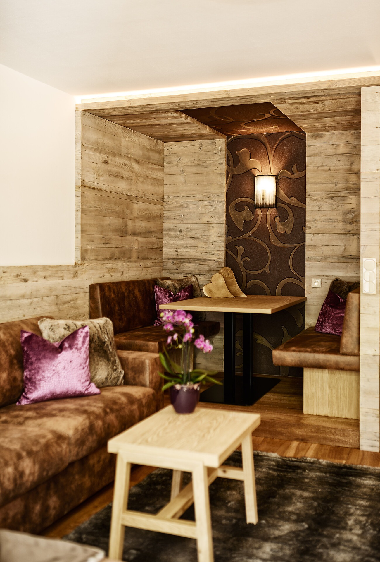 2–6 persons – ca. 240 m2 including 140 m2 private roof terrace, nostalgic suite in antique spruce wood with 3 separate bedrooms (2 upstairs), entrance hall with corner table and espresso machine, large living room with tiled stove and cozy corner, 2 bathrooms (one of them with additional freestanding bathtub), 1 additional separate toilet, loft above the living area with infrared cabin and relaxation loungers. Ca. 140 m2 rooftop terrace with outdoor Finnish sauna, whirlpool with panoramic views (for at least 3 paying guests)