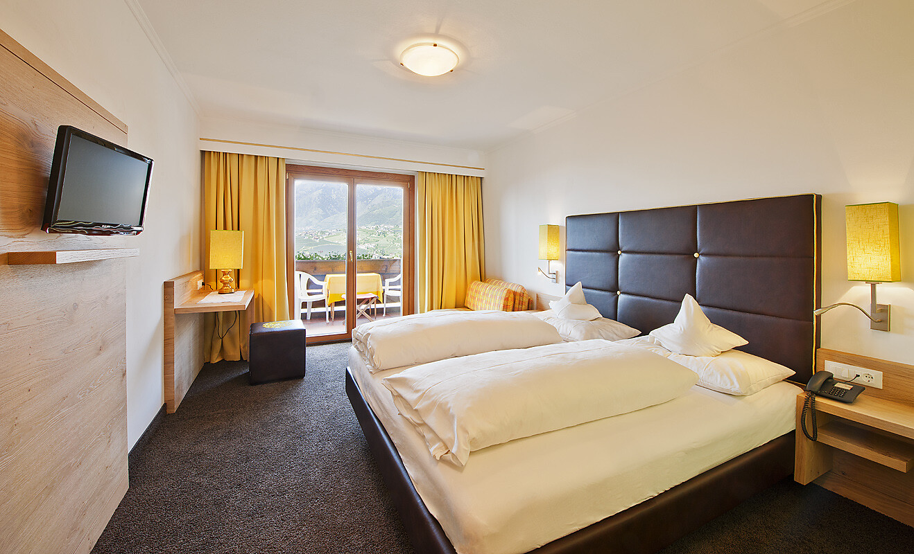 Double room with balcony to the south side and magnificent view to the valley towards the village of Dorf Tirol and Meran. Approx. 22m², bath with WC,shower,cosmetic mirror, hairdryer,satellite TV,phone and safe