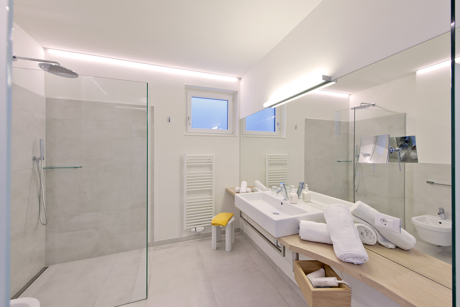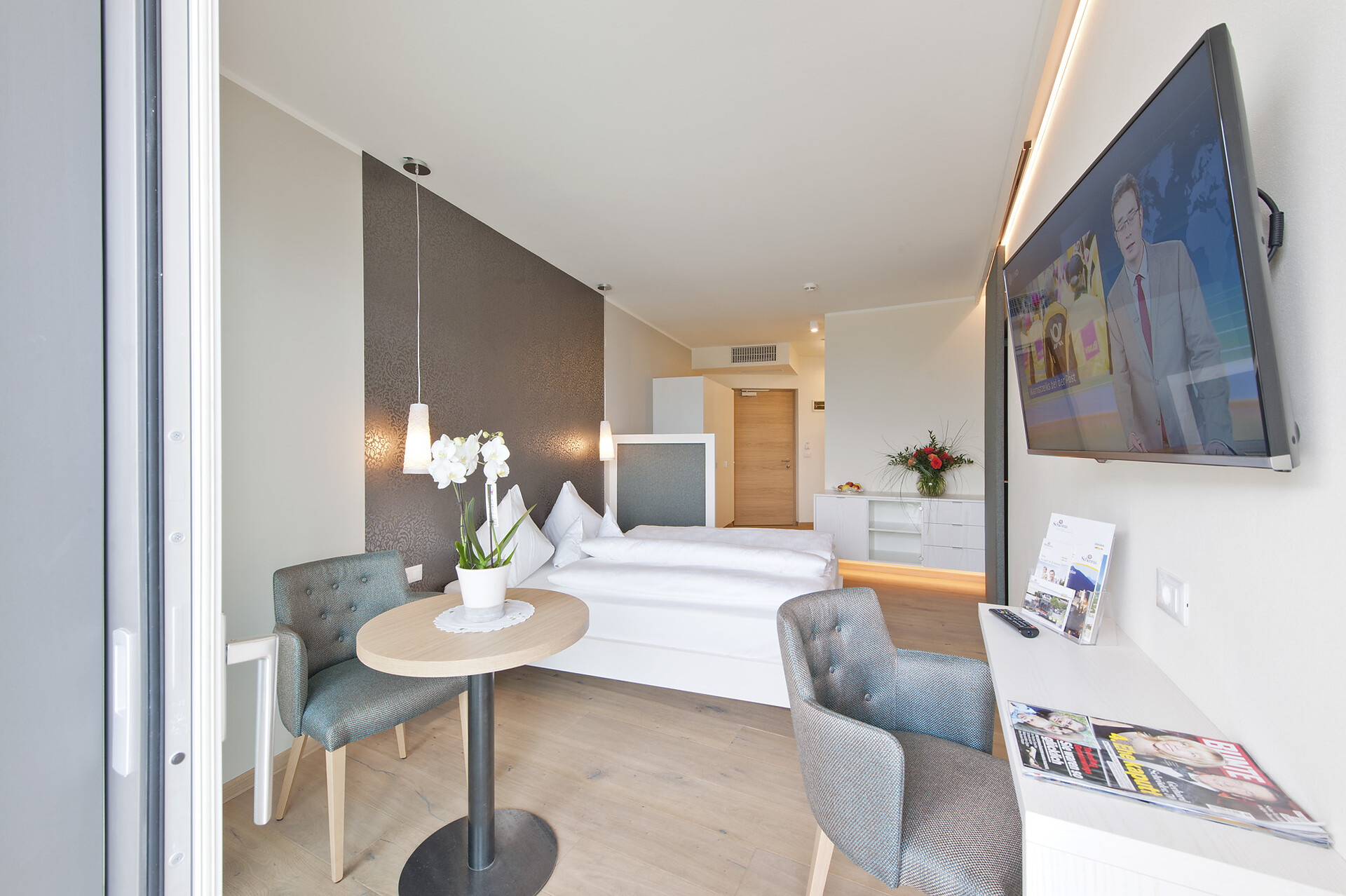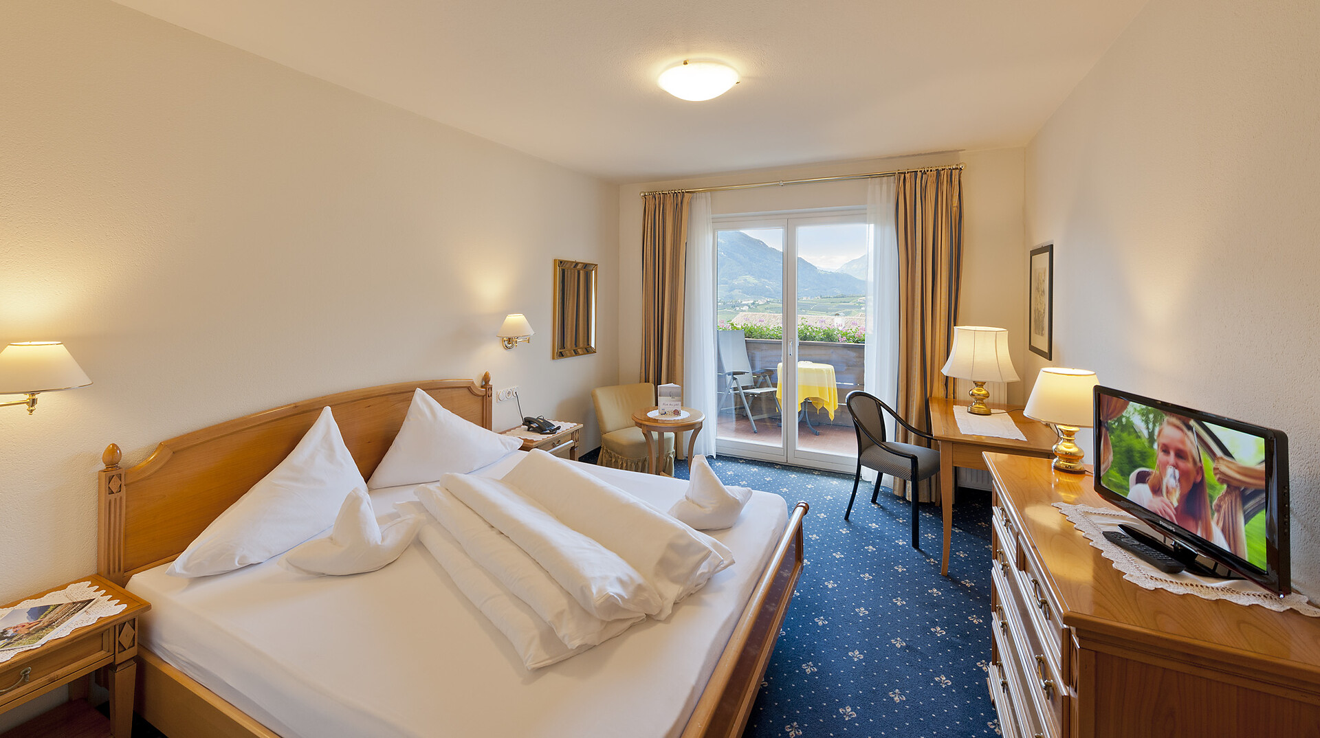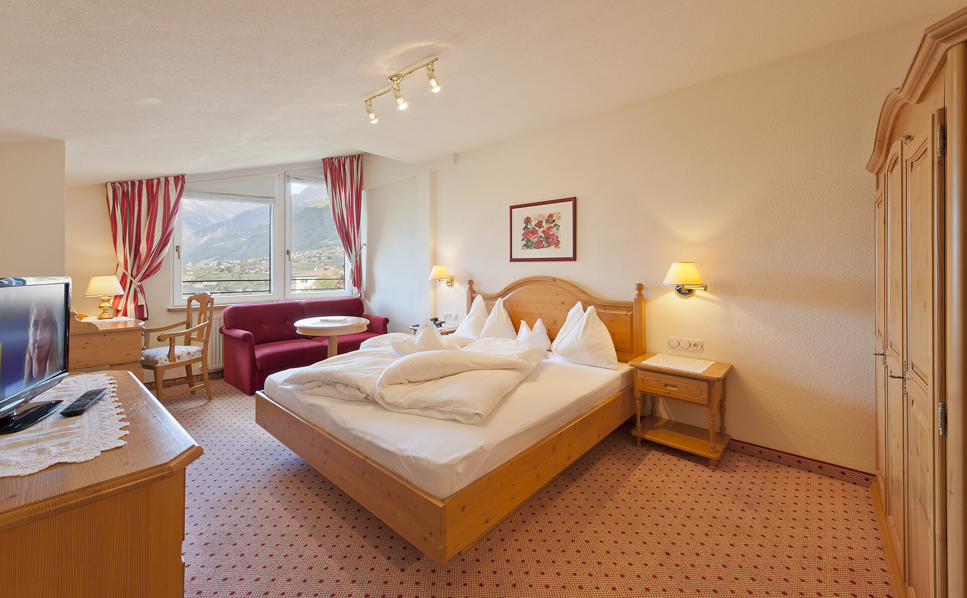New panoramic double rooms with wonderful view over the Meraner Land valley. Baths with WC and bidet, hair-dryer, soft rain shower, LED TV, Telephone and safe. Tyrolean reading corner, minibar and lounge couch. Air Conditioned