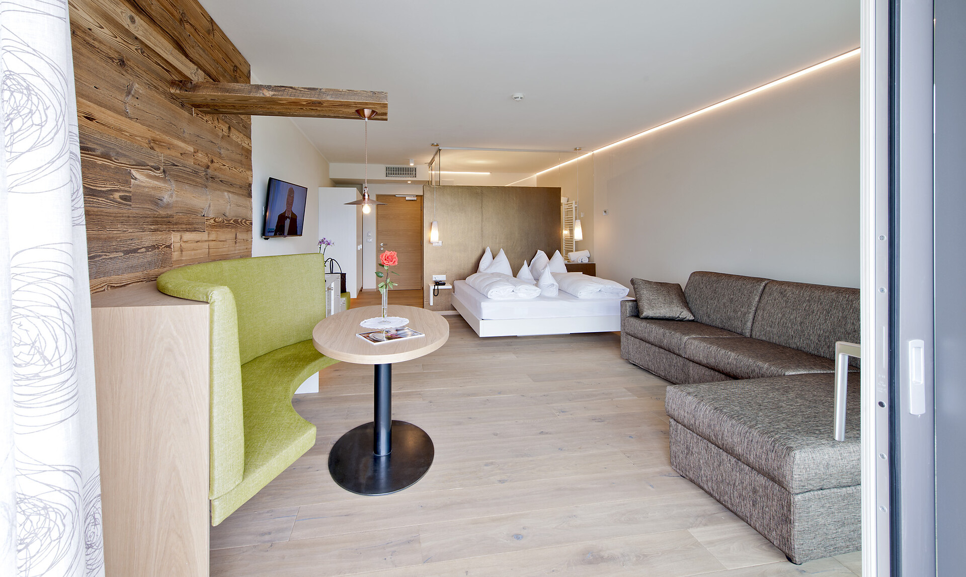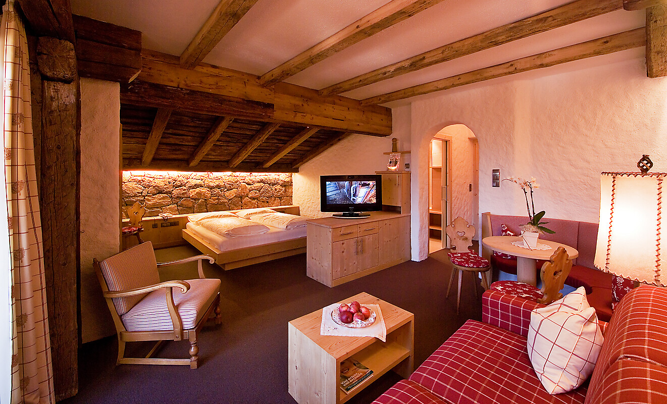 This very convenient suite is located on the 3rd floor of the hotel with stunning panoramic views of the Merano valley. Its snug interior is designed with light wood furnishings and soft carpeting. The sleeping area is separated by a mobile partition from the living area. The suite has one king-size bed, two pull-out sofa beds, cosy seating area and writing desk. The bathroom is spacious, equipped with a bathtub and disabled-accessible shower.