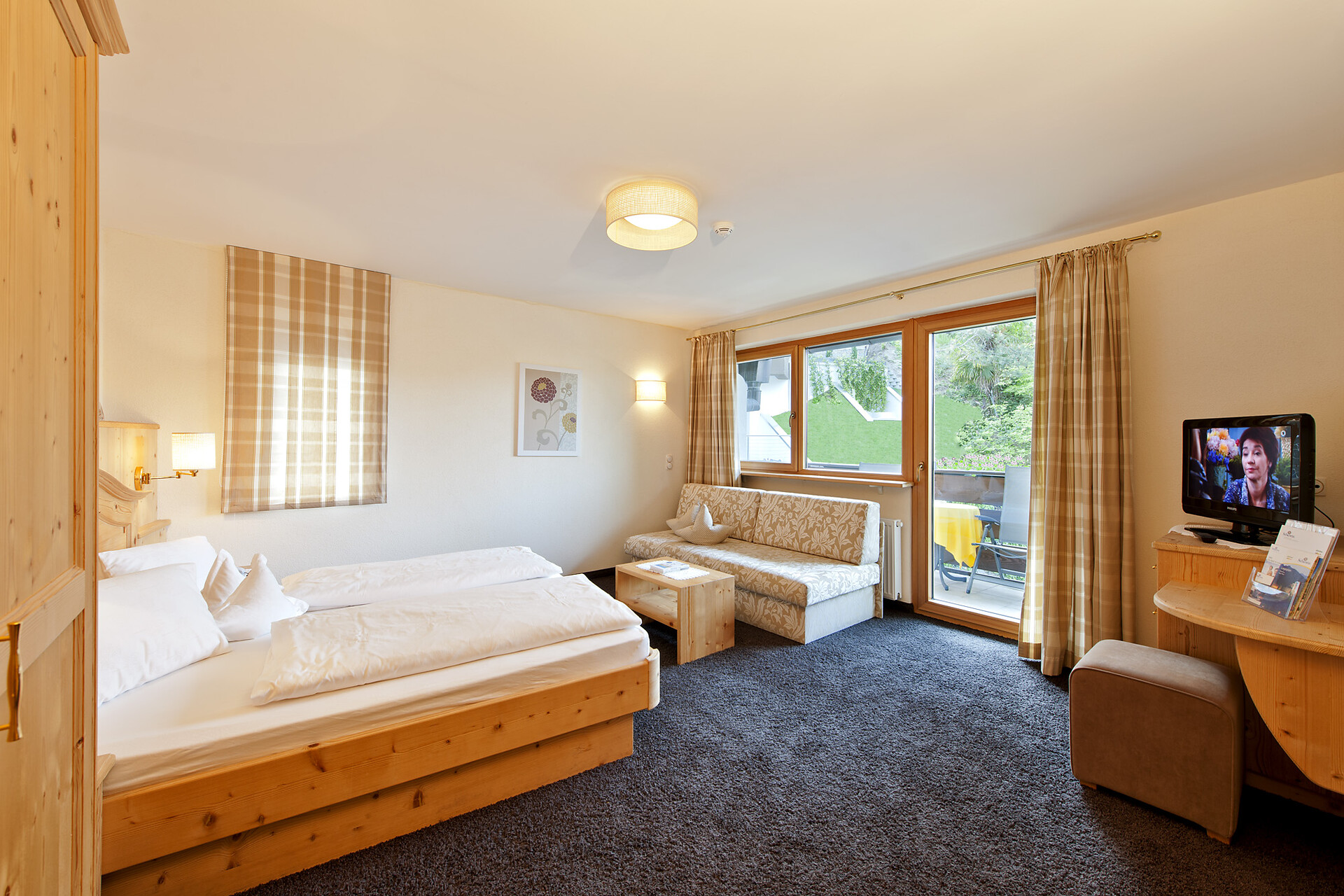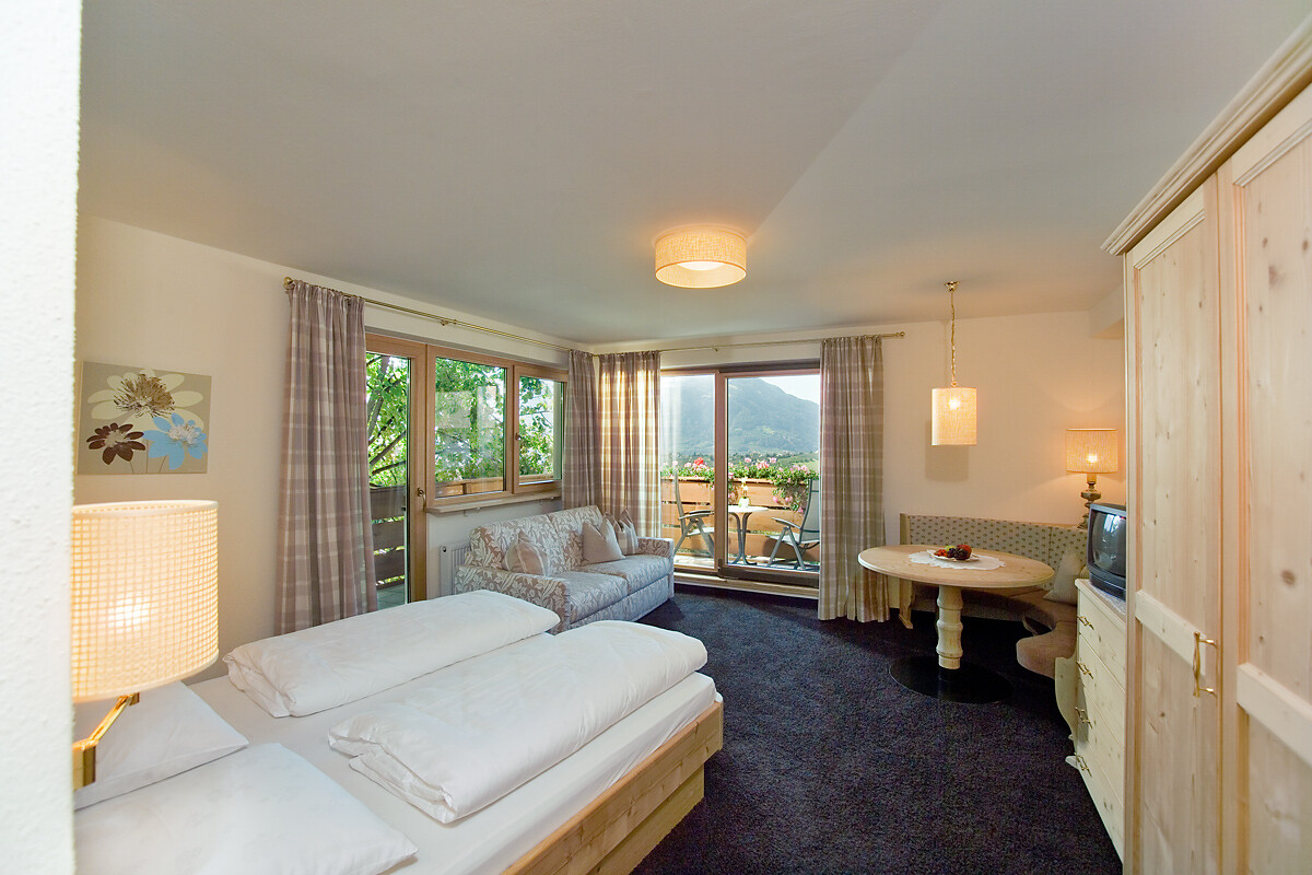 Double rooms with balcony to the mountain side, with morning sun. approx. 28 m², very spacious and comfortable. Large sofa, satellite TV, phone, safe, WC, partial with bidet, hairdryer and bathtub or shower. Suitable also for 3-4 persons.