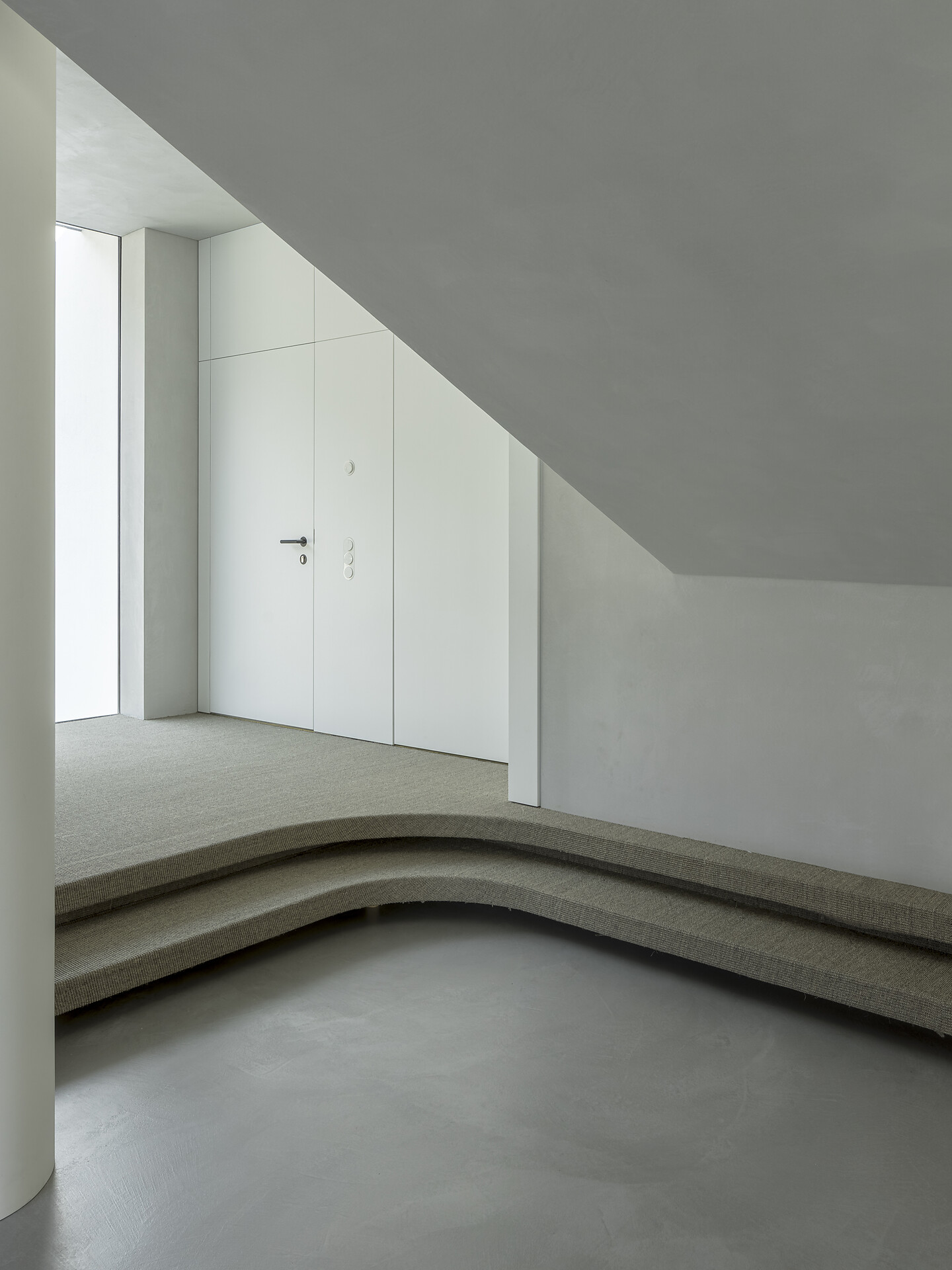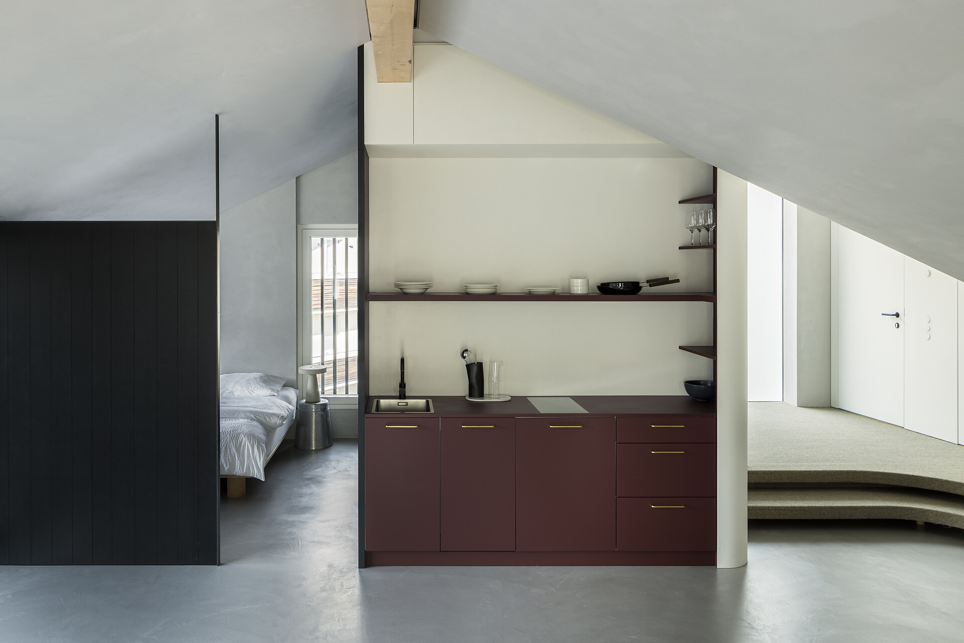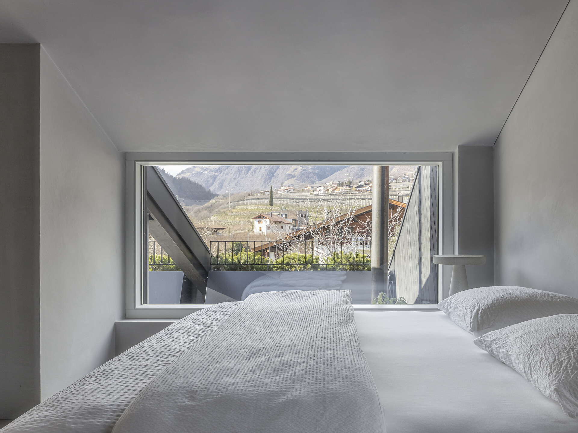 Light gives the loft a window front with a spacious west-facing terrace, which with its 20m2 is the extended outdoor living room. Here you can enjoy the sun until late in the summer and be fascinated by the sublime peaks of the Texelgroup Naturepark. The interior looks like a cocoon, as the floor and walls are smoothed tone on tone, which gives the rooms a sense of security. The living room also houses a few unique pieces by the designer: the round dining table and the floor lamp are 3D printed concrete objects and were specially designed for the apartment. Likewise the sink, which stands like a sculpture in the middle of the bathroom. The kitchen, which is equipped with high-quality, deliberately minimal and eco-friendly materials and utensils, is adapted to the red autumn colours of nature. A real eye-catcher is the wool-covered daybed, which invites you to read comfortably. There is also a selection of multilingual books on a sisal-covered step, which also serves as a shelf.