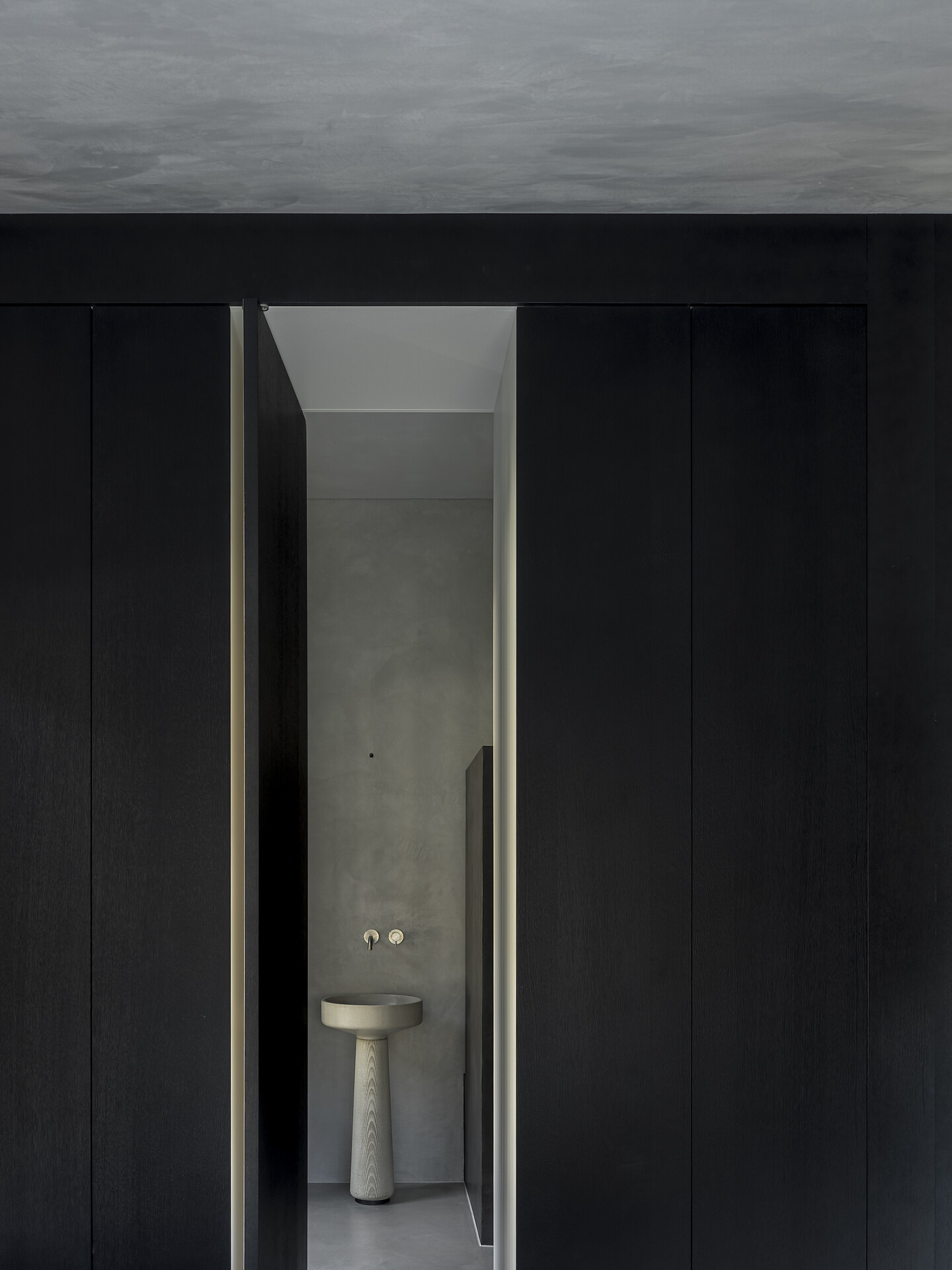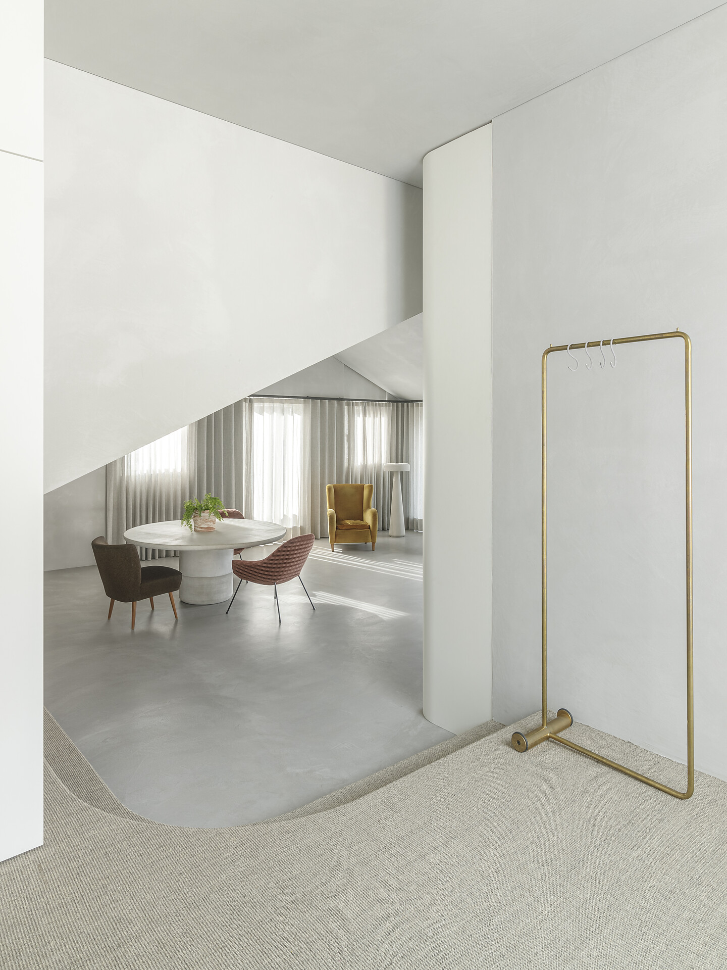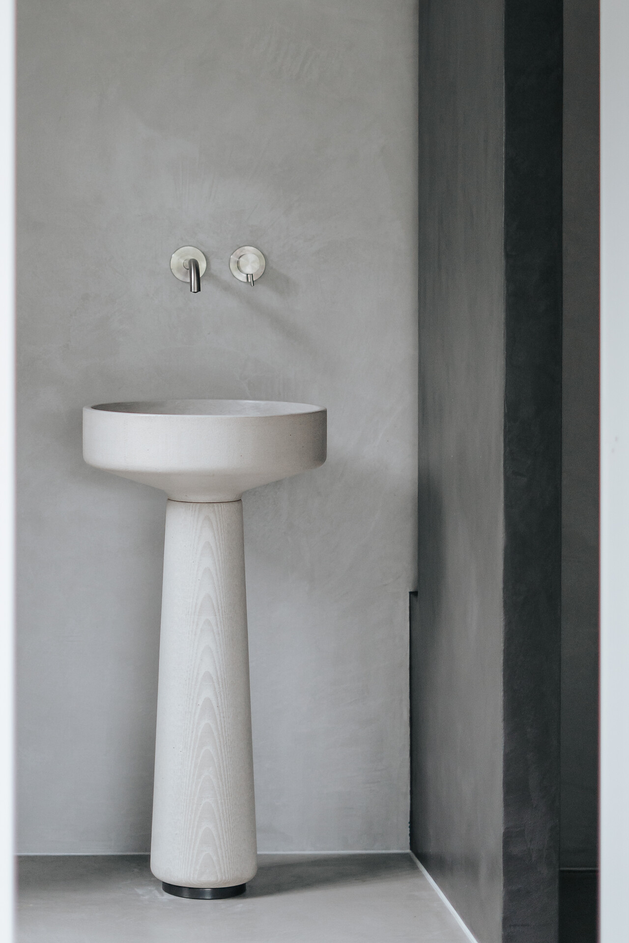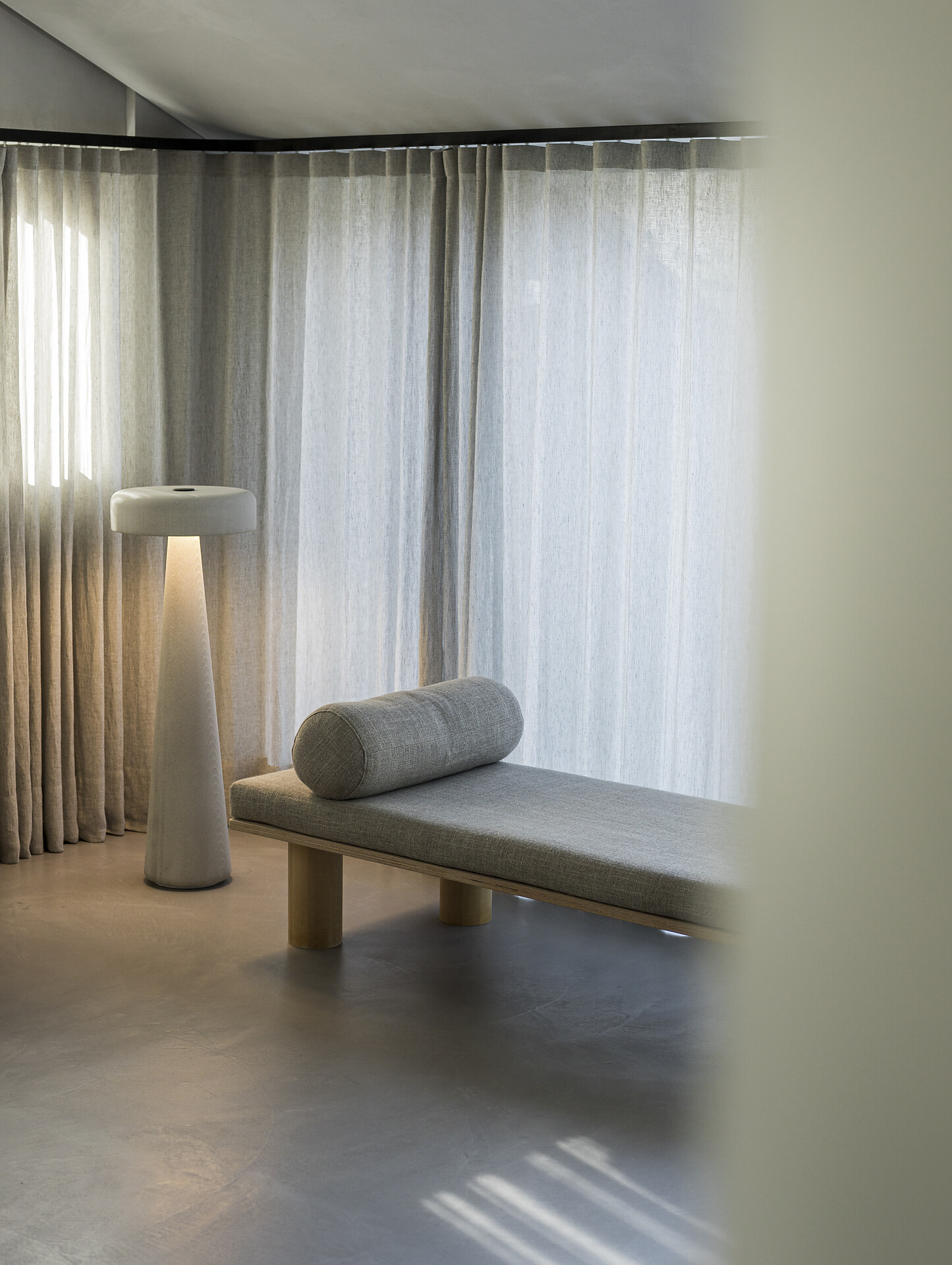 Light gives the loft a window front with a spacious west-facing terrace, which with its 20m2 is the extended outdoor living room. Here you can enjoy the sun until late in the summer and be fascinated by the sublime peaks of the Texelgroup Naturepark. The interior looks like a cocoon, as the floor and walls are smoothed tone on tone, which gives the rooms a sense of security. The living room also houses a few unique pieces by the designer: the round dining table and the floor lamp are 3D printed concrete objects and were specially designed for the apartment. Likewise the sink, which stands like a sculpture in the middle of the bathroom. The kitchen, which is equipped with high-quality, deliberately minimal and eco-friendly materials and utensils, is adapted to the red autumn colours of nature. A real eye-catcher is the wool-covered daybed, which invites you to read comfortably. There is also a selection of multilingual books on a sisal-covered step, which also serves as a shelf.