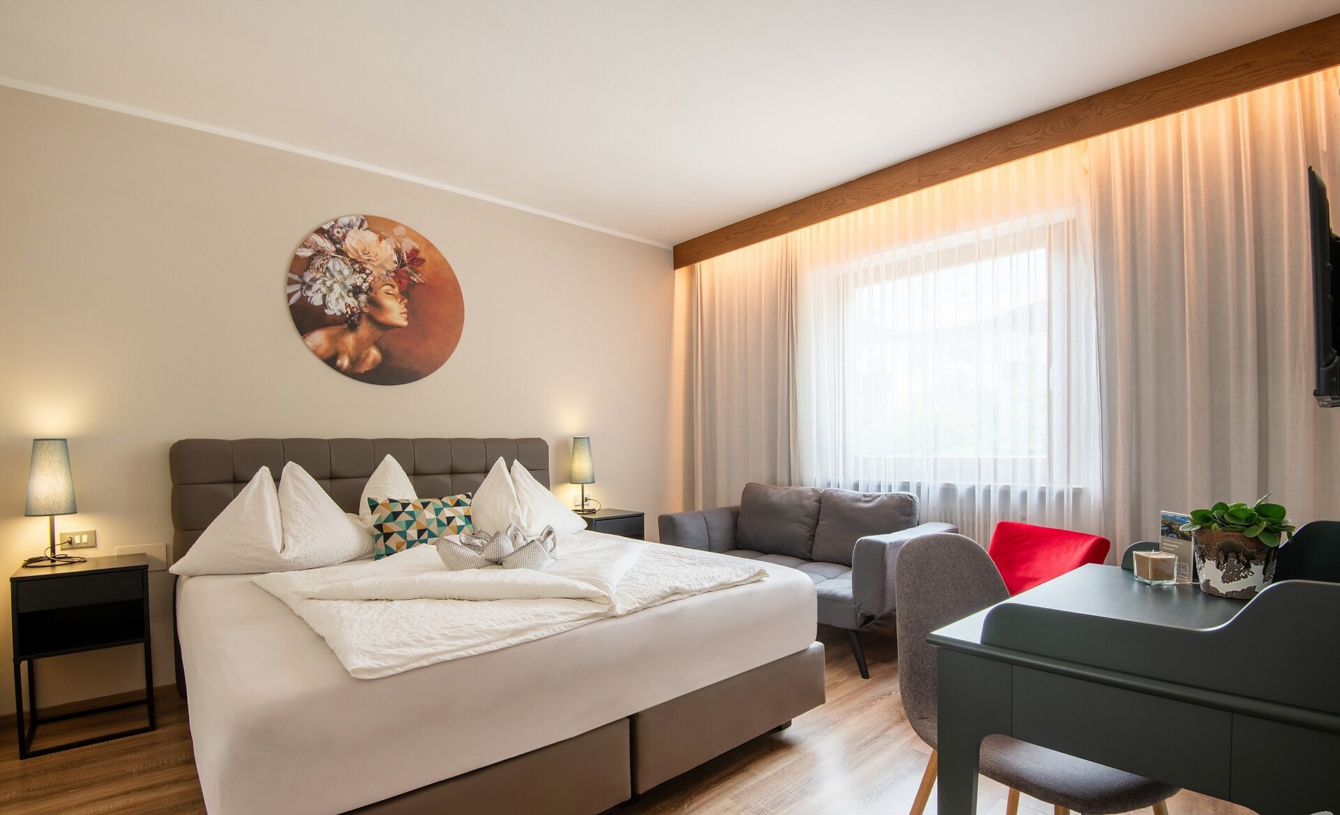 Ca. 35 m² | 3+1 people Our Suite Elenor has 35 square meters with a separate dining/living room, one double bed room, one bathroom. A south balcony with a beautiful to Merano. All our kitchens of the Hotel Residence MaVie are equipped with fridge,freezer, electric cooker. water boiler and nespresso coffe machine. Bathroom: with bath/shower, hairdryer, WC. All our double rooms & appartements are equipped: with cozy bathrobes an well-being set.