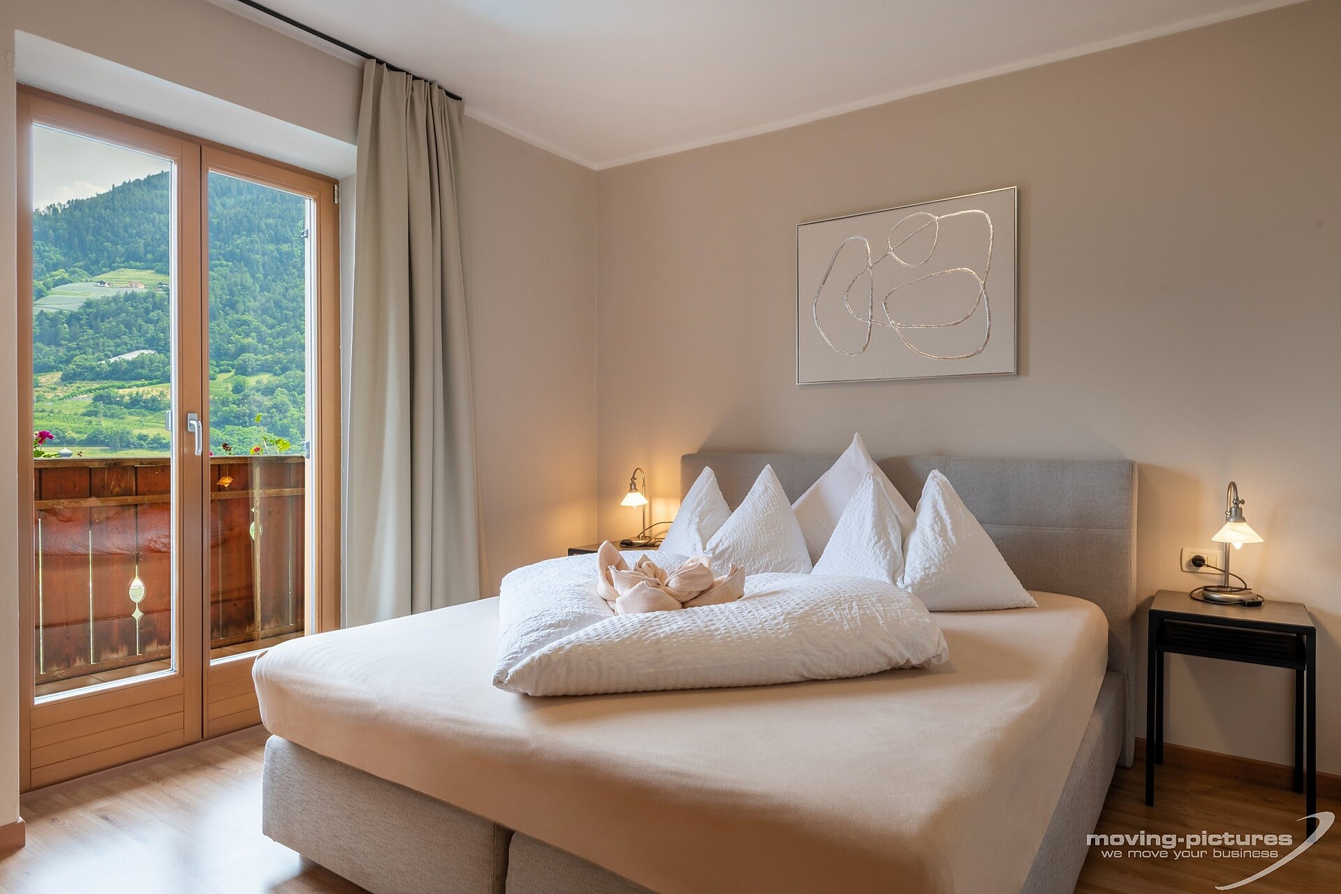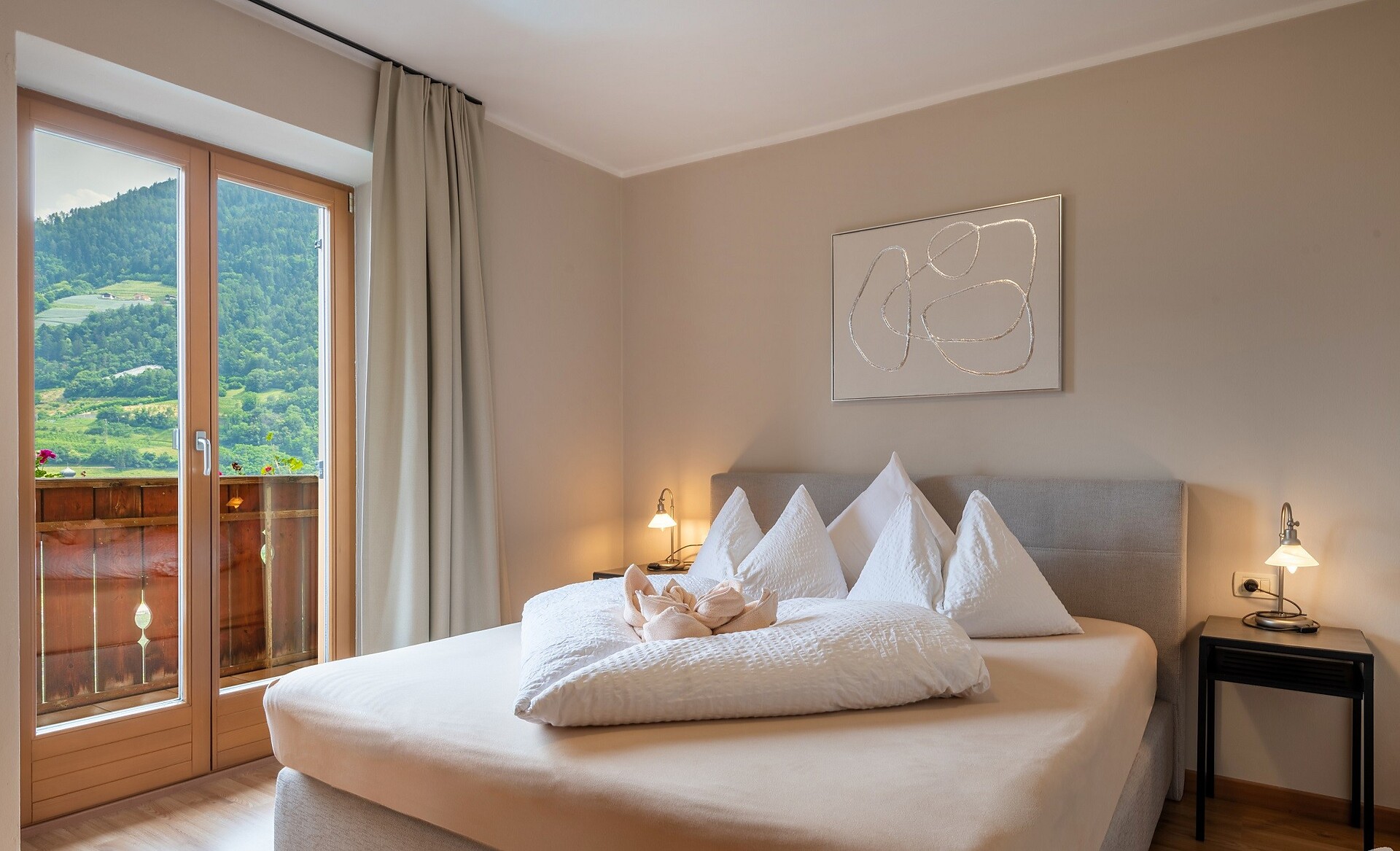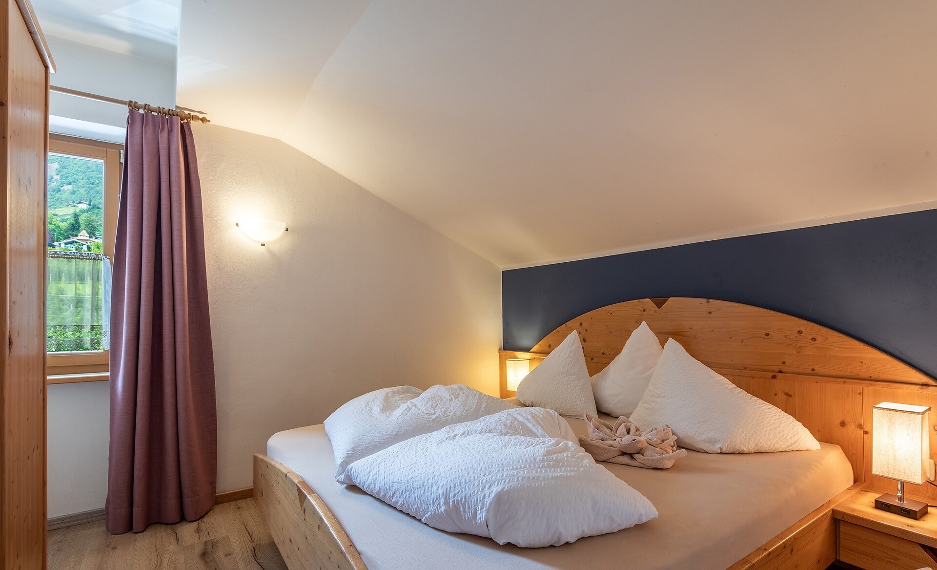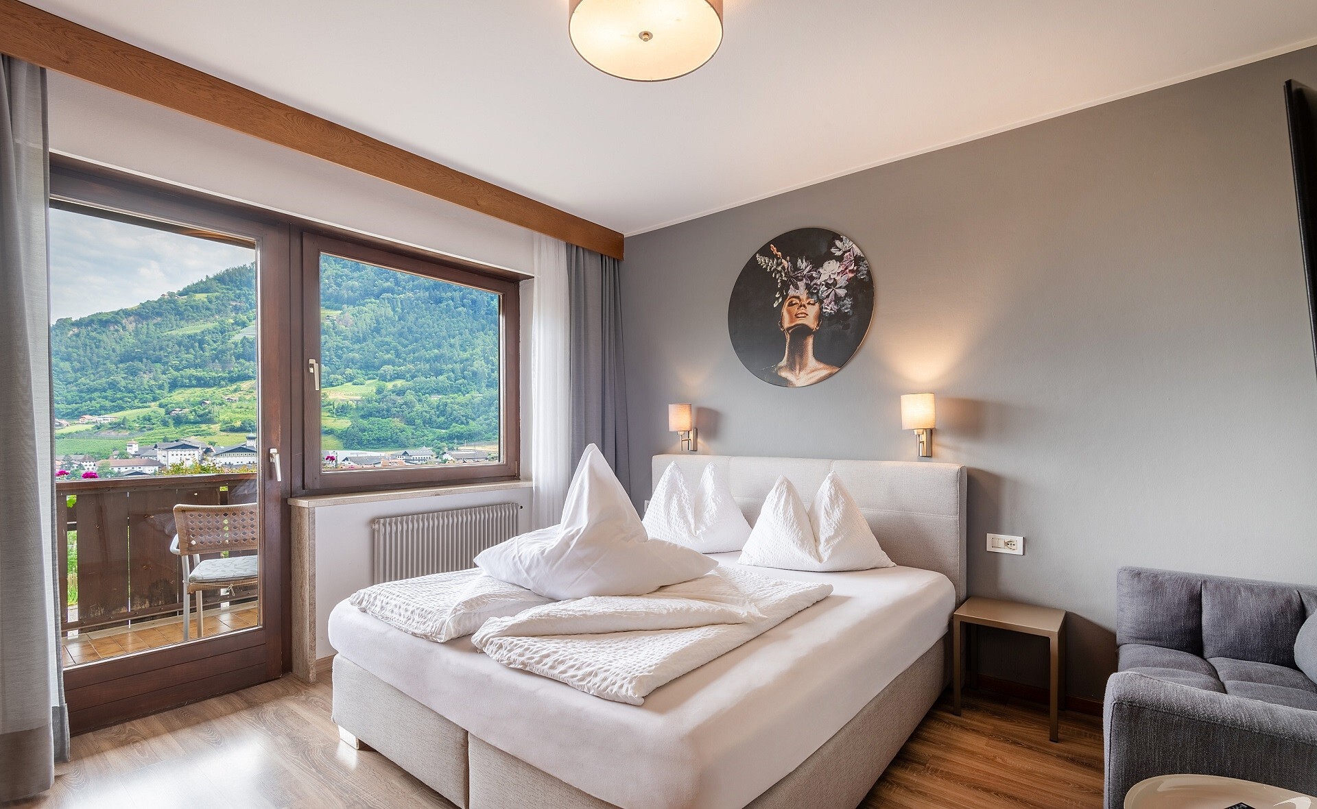 Double room Rosalie 20 square meters four 2 people / max. 3 Room with west balcony, bath, WC, SAT-TV & safe. Beautiful view to the mountains and Merano & surroundings. All our double rooms are equipped: with cozy bathrobes, well-being set. bahtroom: hairdryer, cosmetic mirror