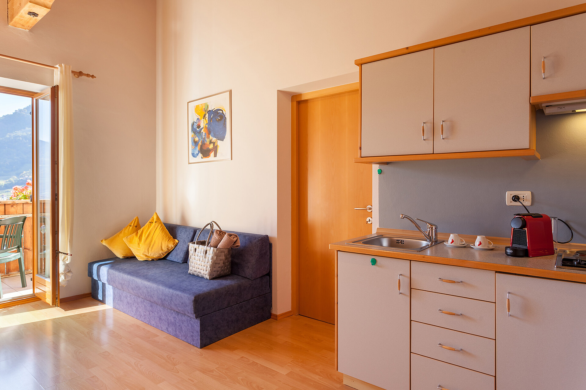 Ca. 45 m² | 3+1 people Our Suite Marlen has 45 square meters with a separate dining/living room with sofa bed, one double bed room, one bathroom. A south balcony with a beautiful view to Merano. All our kitchens of the Hotel Residence MaVie are equipped with fridge,freezer, electric cooker. water boiler and nespresso coffe machine. Bathroom: with bath/shower, hairdryer, WC.