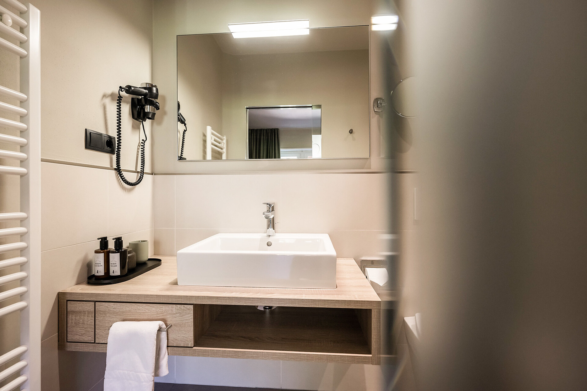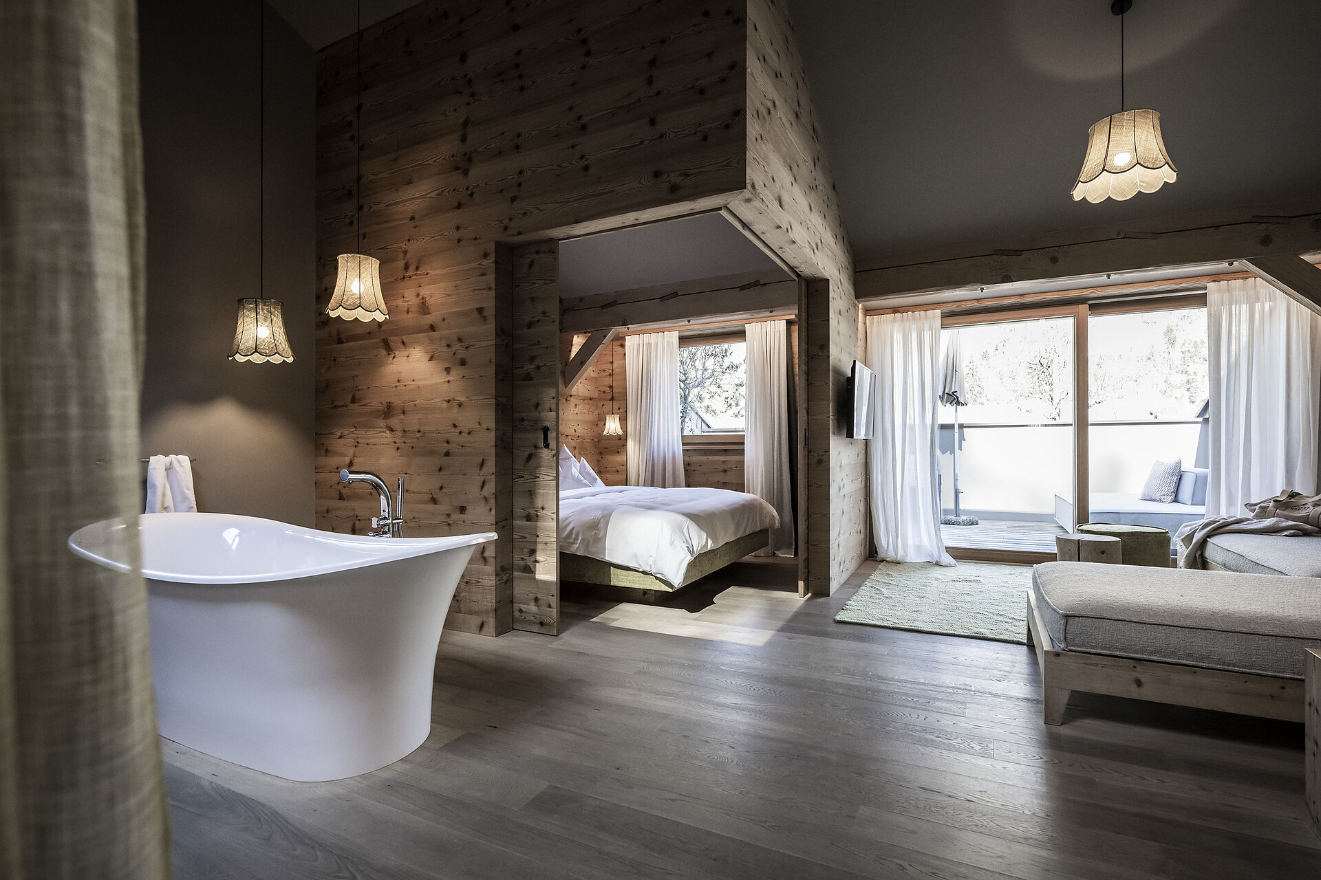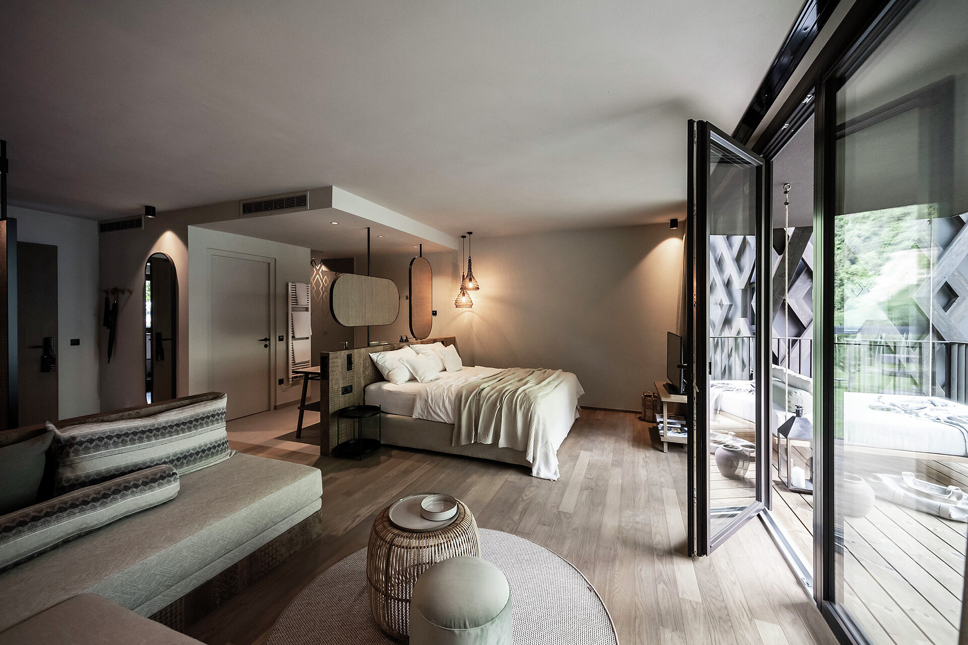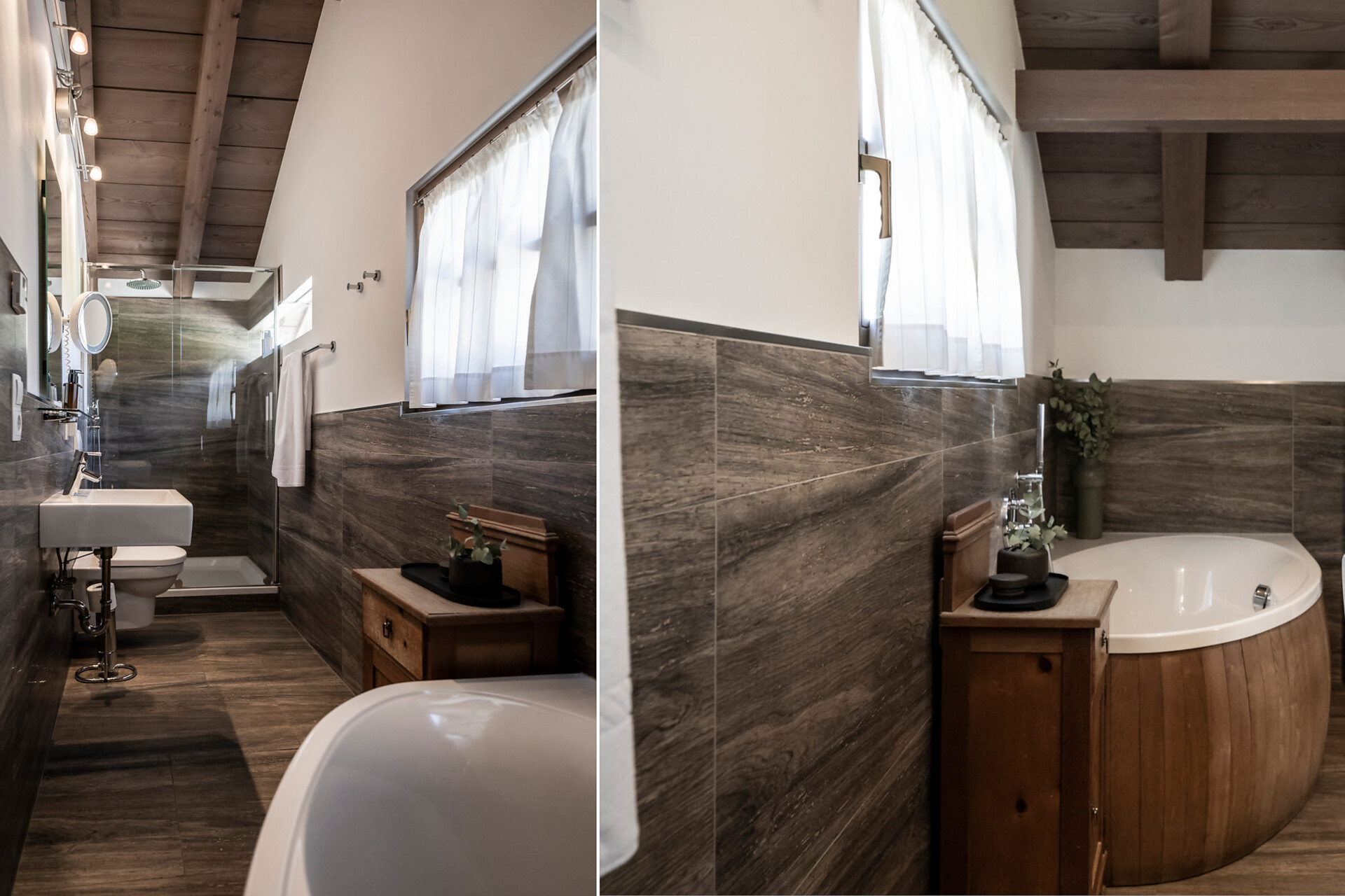 The solid wood paneling exudes intimacy and romance. The balcony overlooks directly onto our garden. With a panoramic shower, corner bathtub and panoramic windows, you can enjoy every moment together.