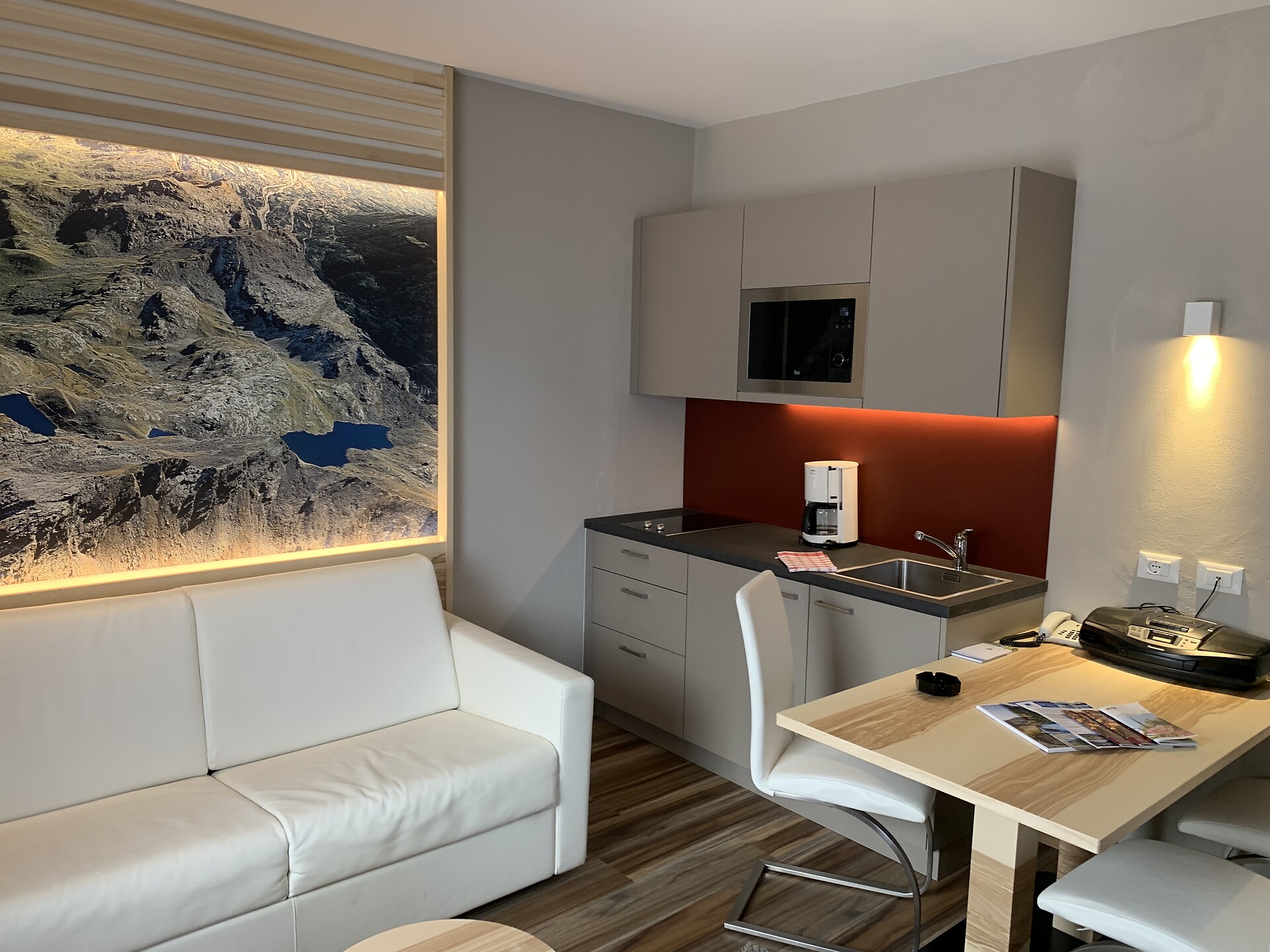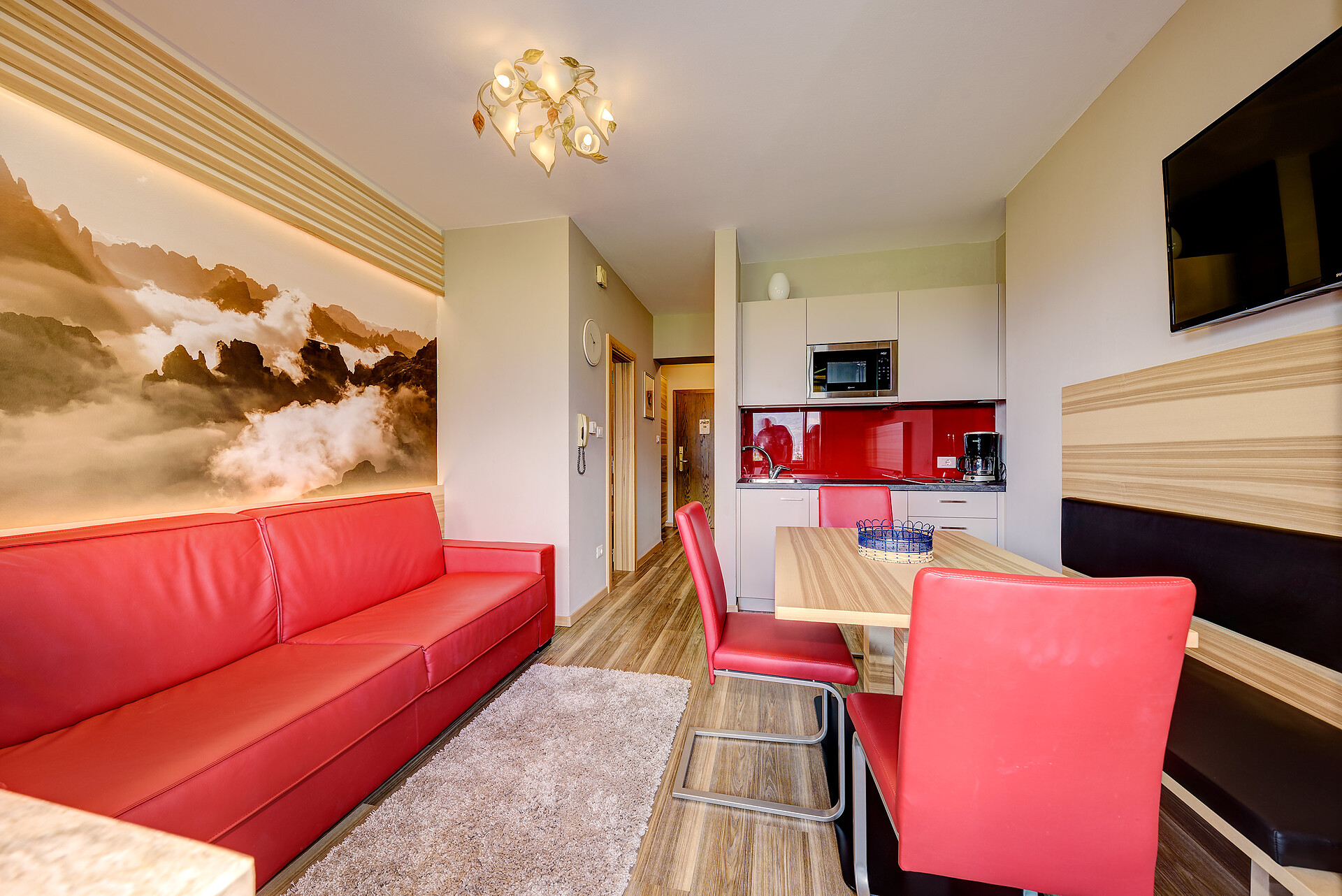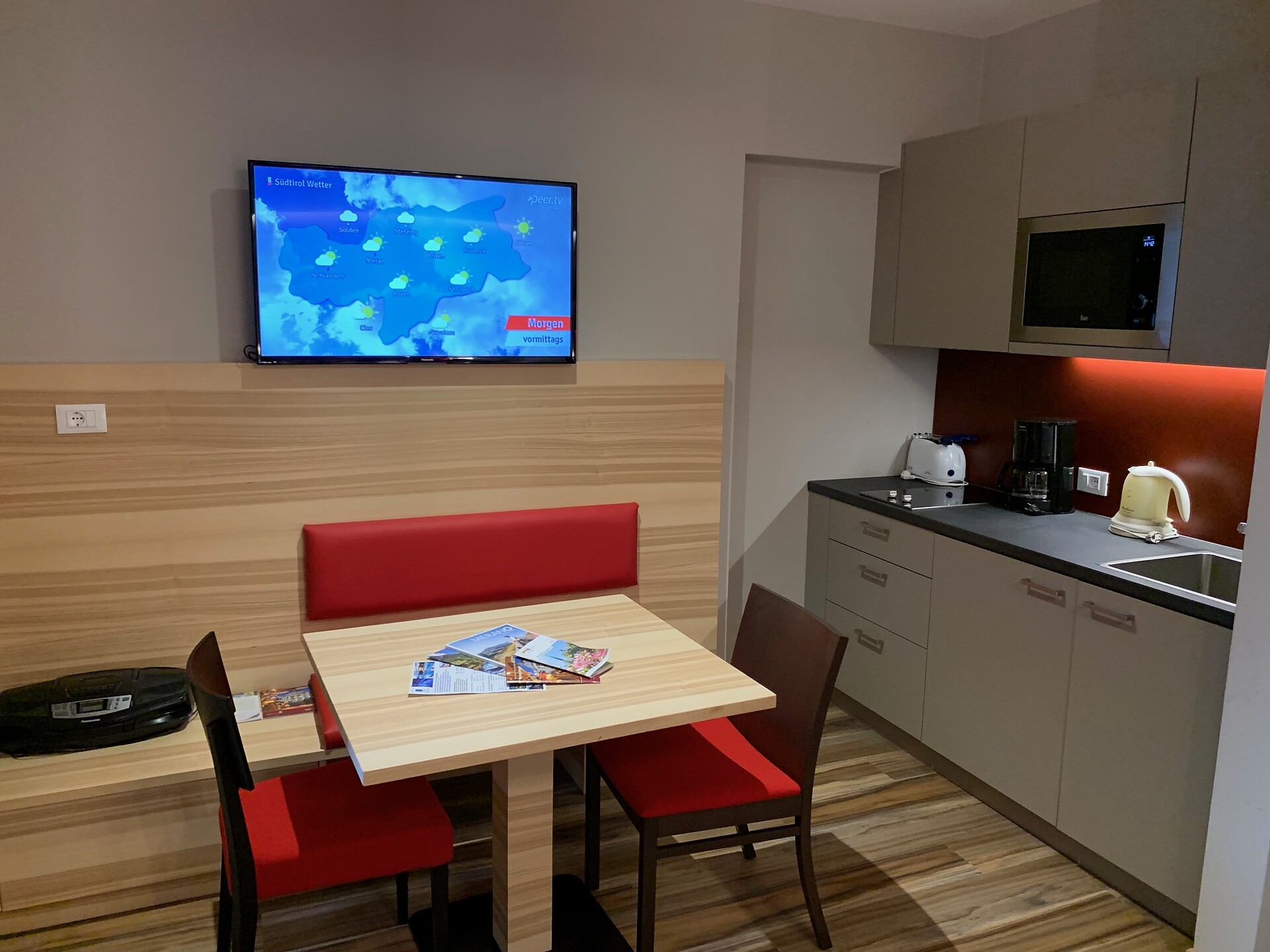 Nice apartment "type A" in the Ruster Apartments *** with large south-facing balcony and view of Meran, double room, lounge with double bed - couch and extra bed, kitchenette, dining area, bathroom or shower, toilet, satellite TV, telephone and safe.