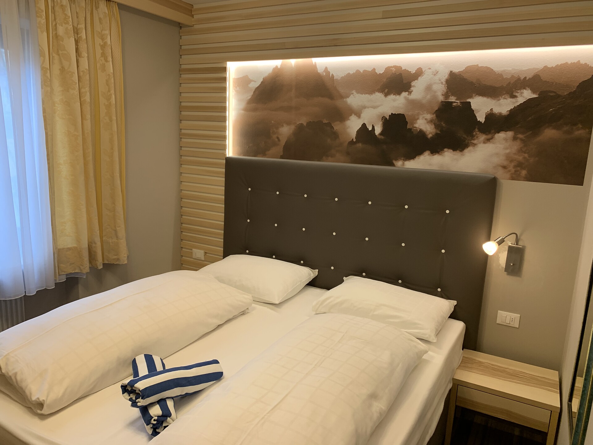 1 beautiful double room "Type Tyrol" (and sofa bed) in the hotel Friedheim with balcony on the southern side overlooking Merano, shower/WC, air conditioning, minibar, SAT-TV, telephone and safe