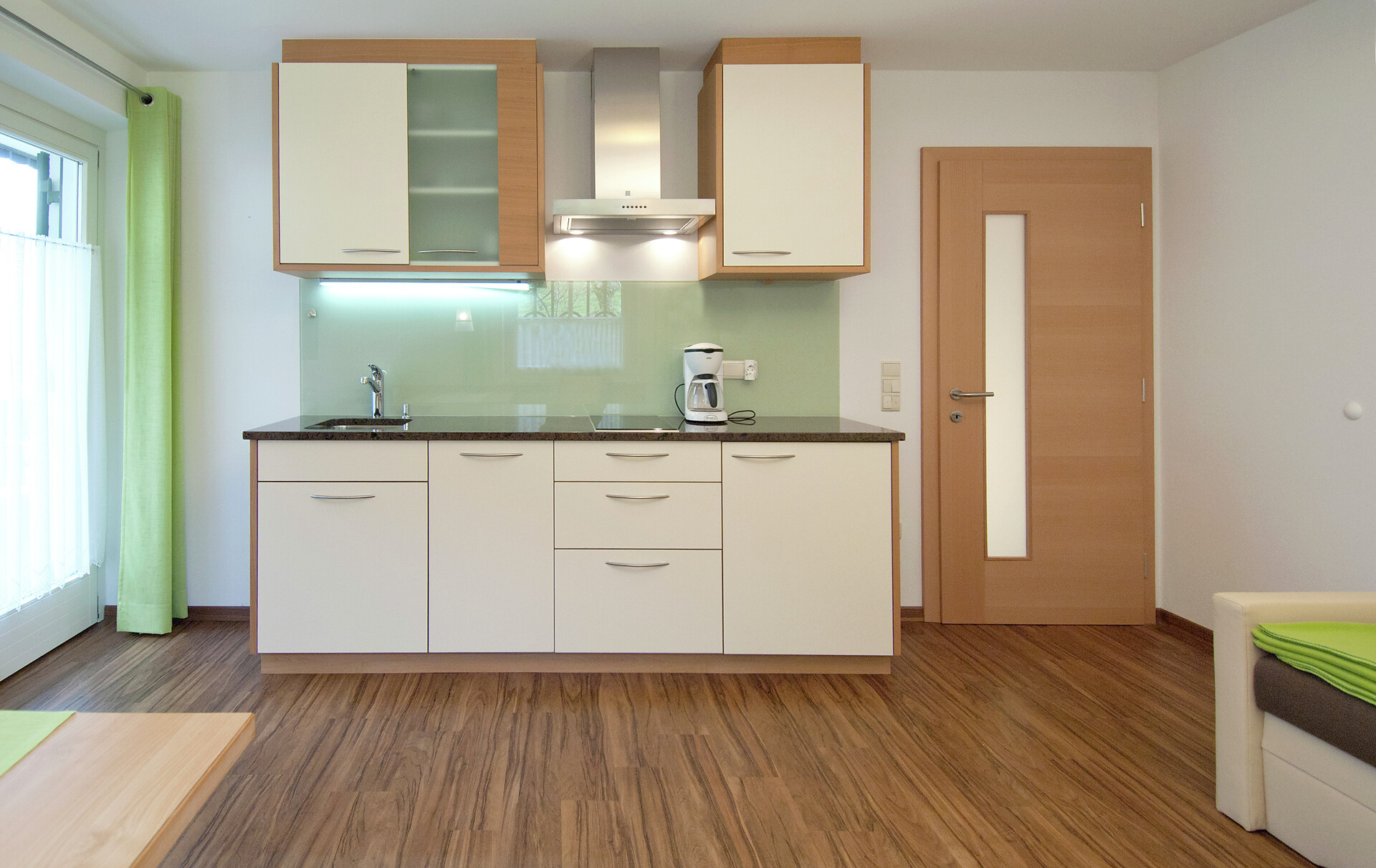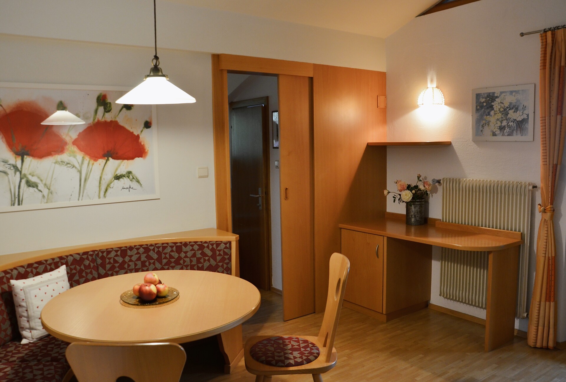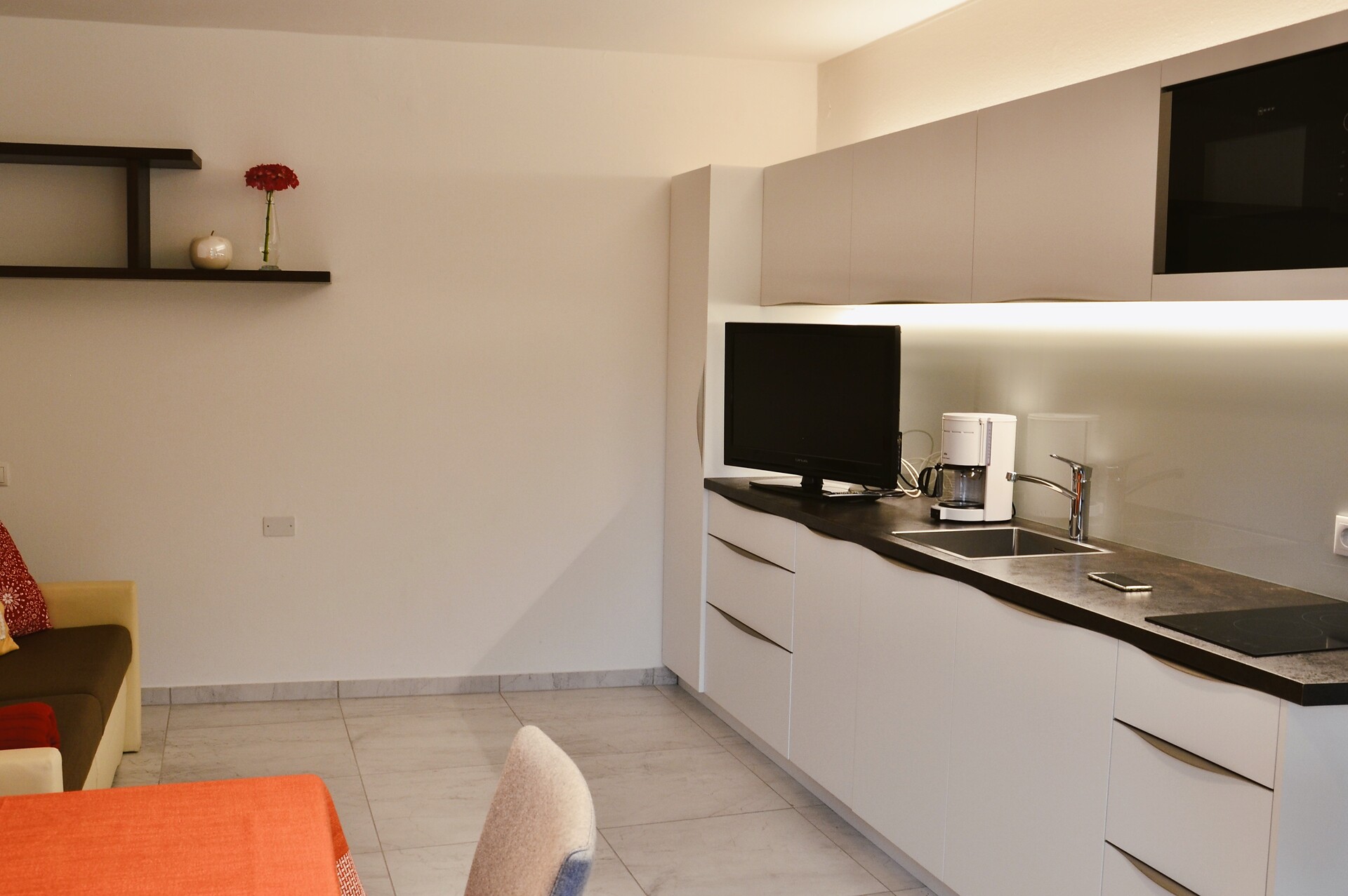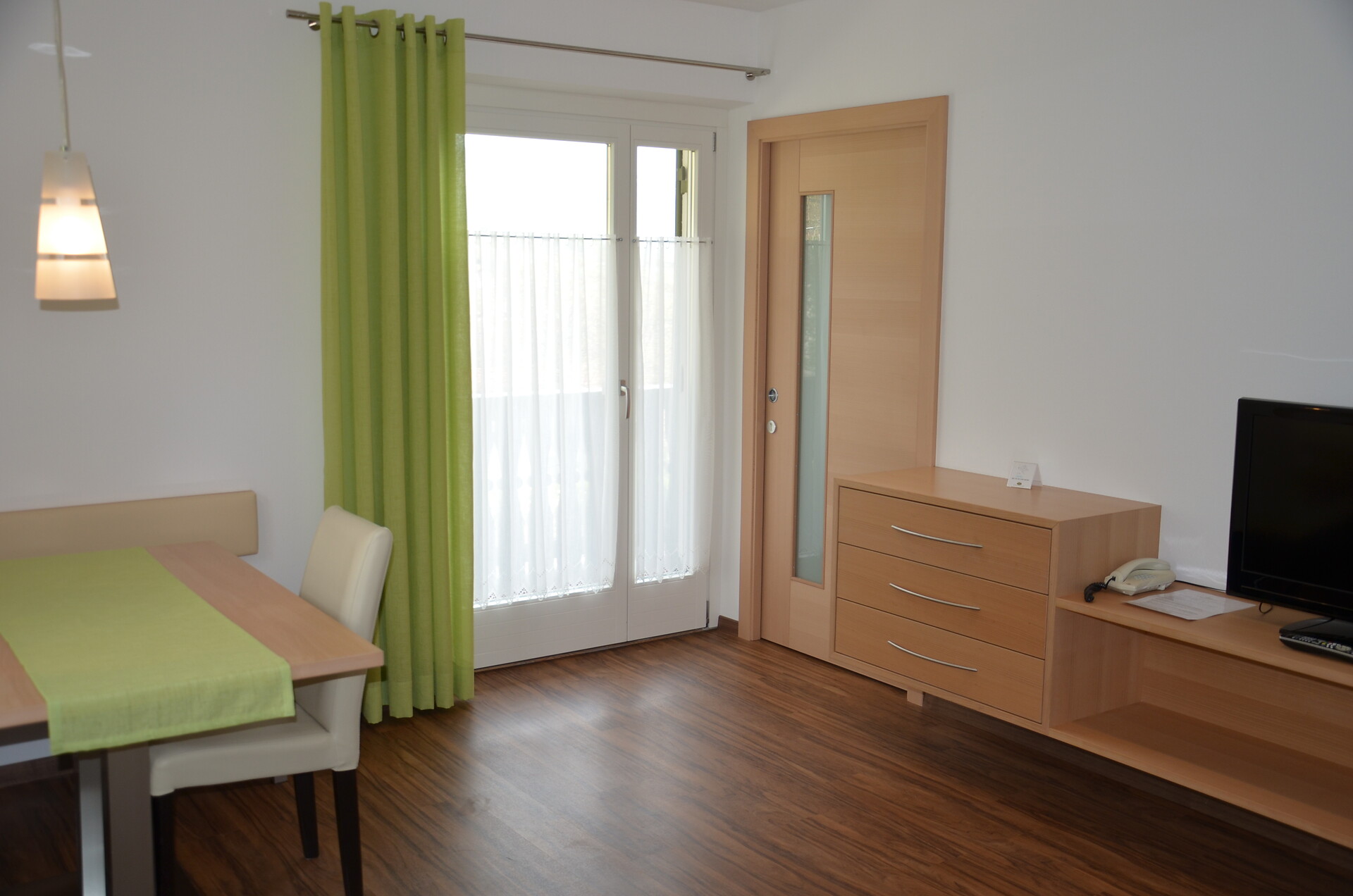 on first floor - 40 m² for 2-4 persons Living kitchen furnished with extendable Couch, dishwasher, access to large 12 m² covered balcony overlooking orchards and mountains, separate bedroom, modern shower/WC, phone, safe & Sat - TV and W-LAN Internet.