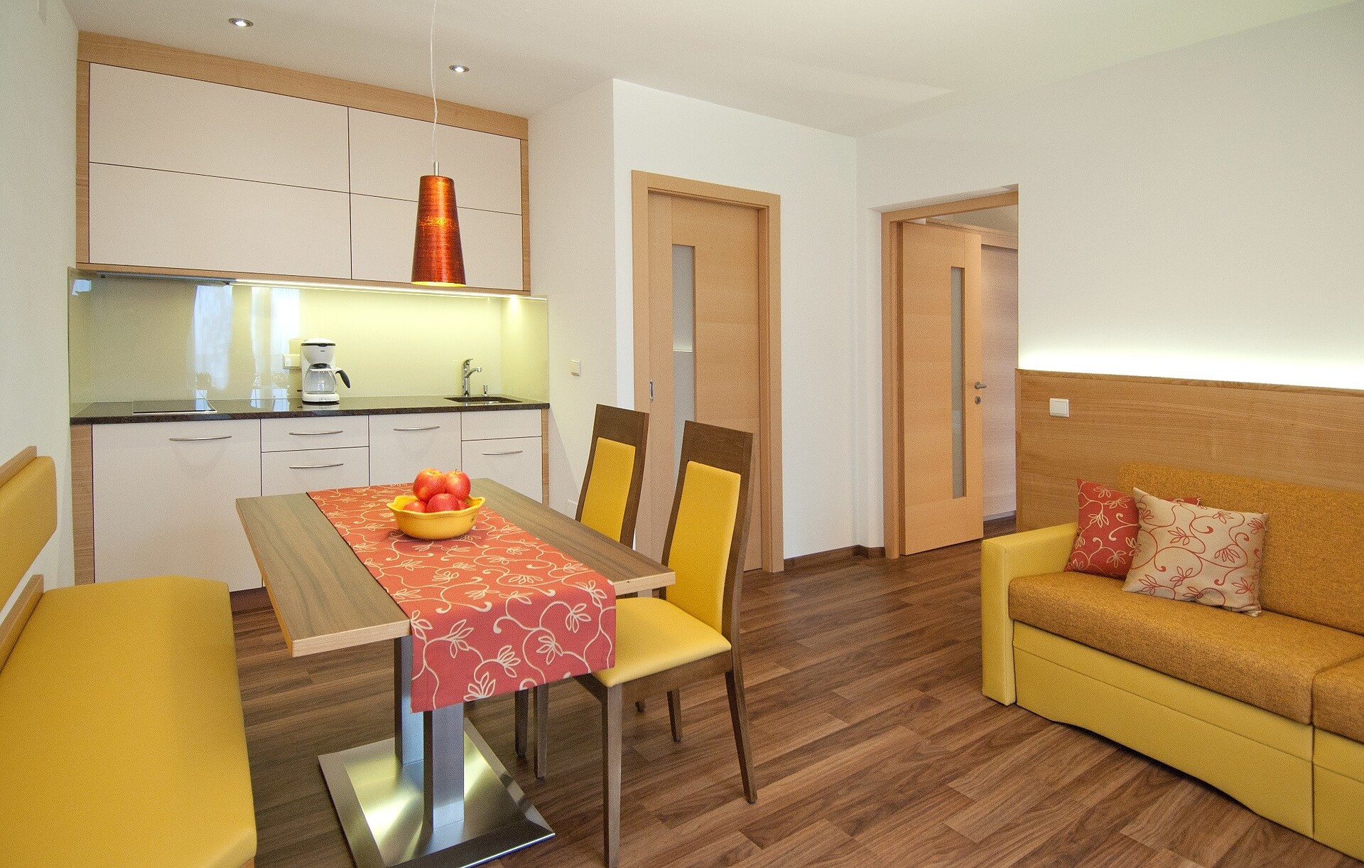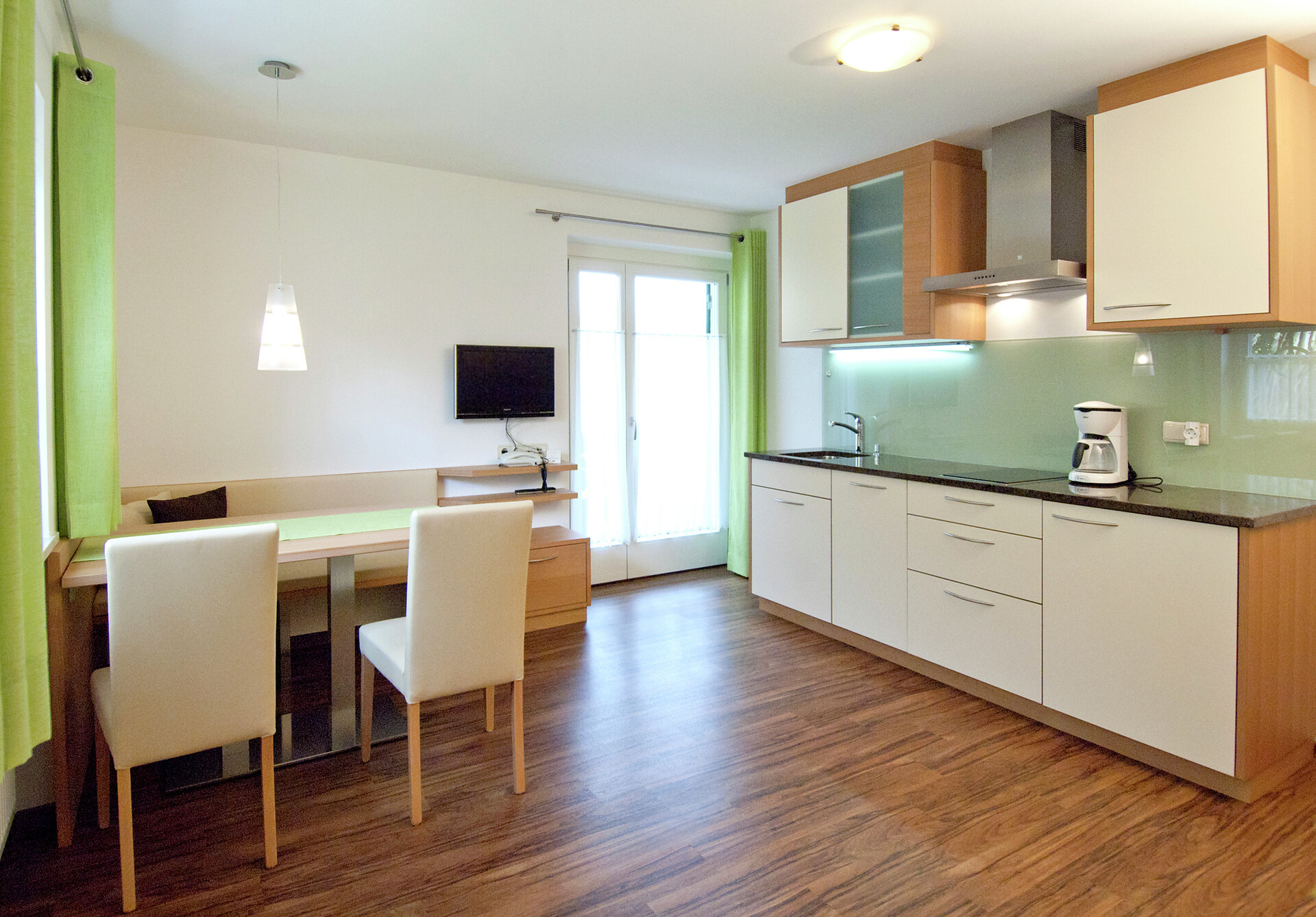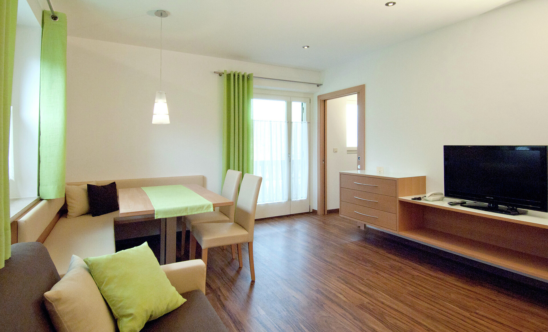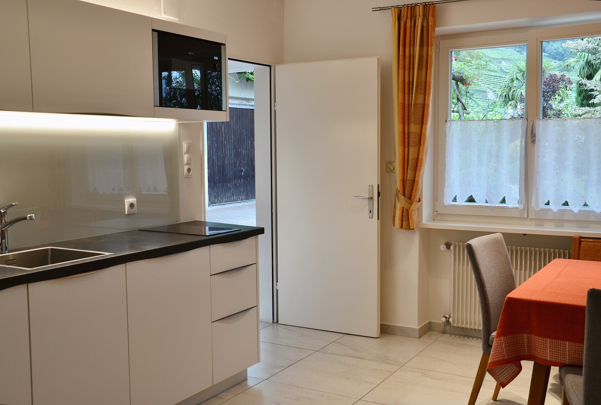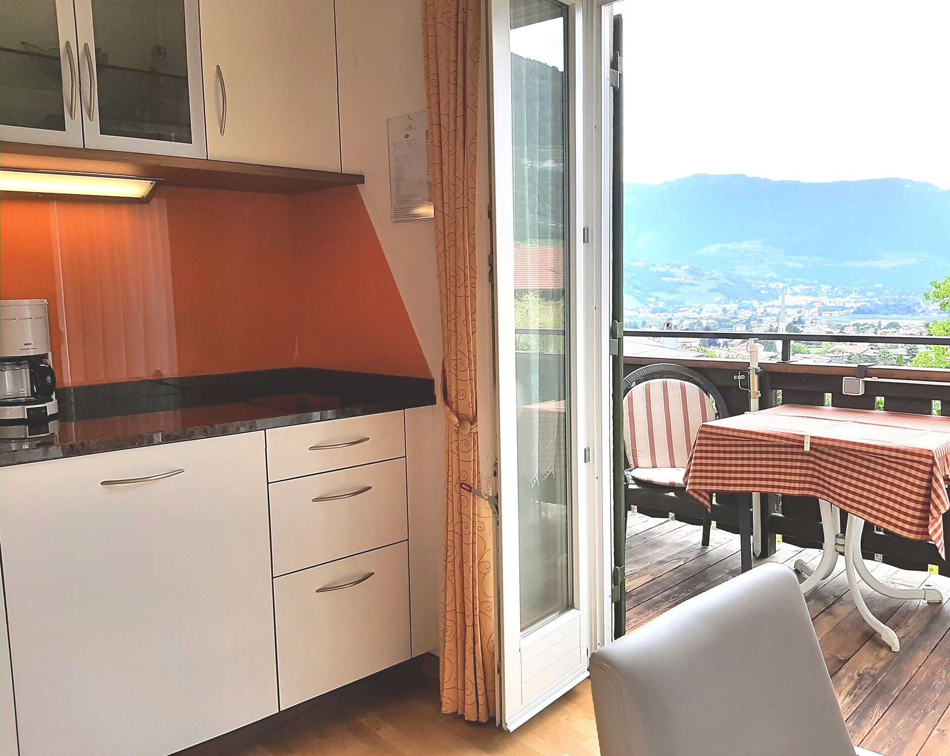 on first floor - 45 m² for 2-4 persons Living kitchen with extendable couch, dinette, Sat - TV, phone, safe, W-LAN Internet, kitchenette with dish washer, separate bedroom, access to the balcony from living room and bedroom overlooking Merano and mountains around