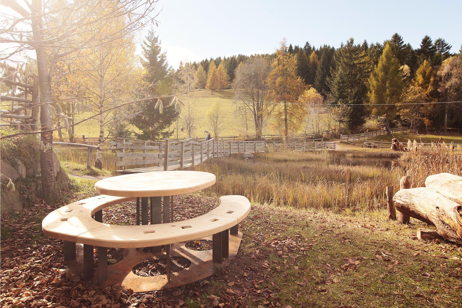 Presso il laghetto Löschteich di Verano è stata realizzata un'area di sosta particolarmente versatile. Lo troverai proseguendo sul sentiero escursionistico 11 dopo aver superato la malga Leadner Alm. Una panchina con tavolo invita a fare un picnic, mentre le barre di equilibrio e un tepee garantiscono movimento e gioco, offrendo una gradita varietà soprattutto alle famiglie. Presso lo stagno Weiher Bruggen sono state invece realizzate due panchine a forma di ferro di cavallo con tavolo integrato.