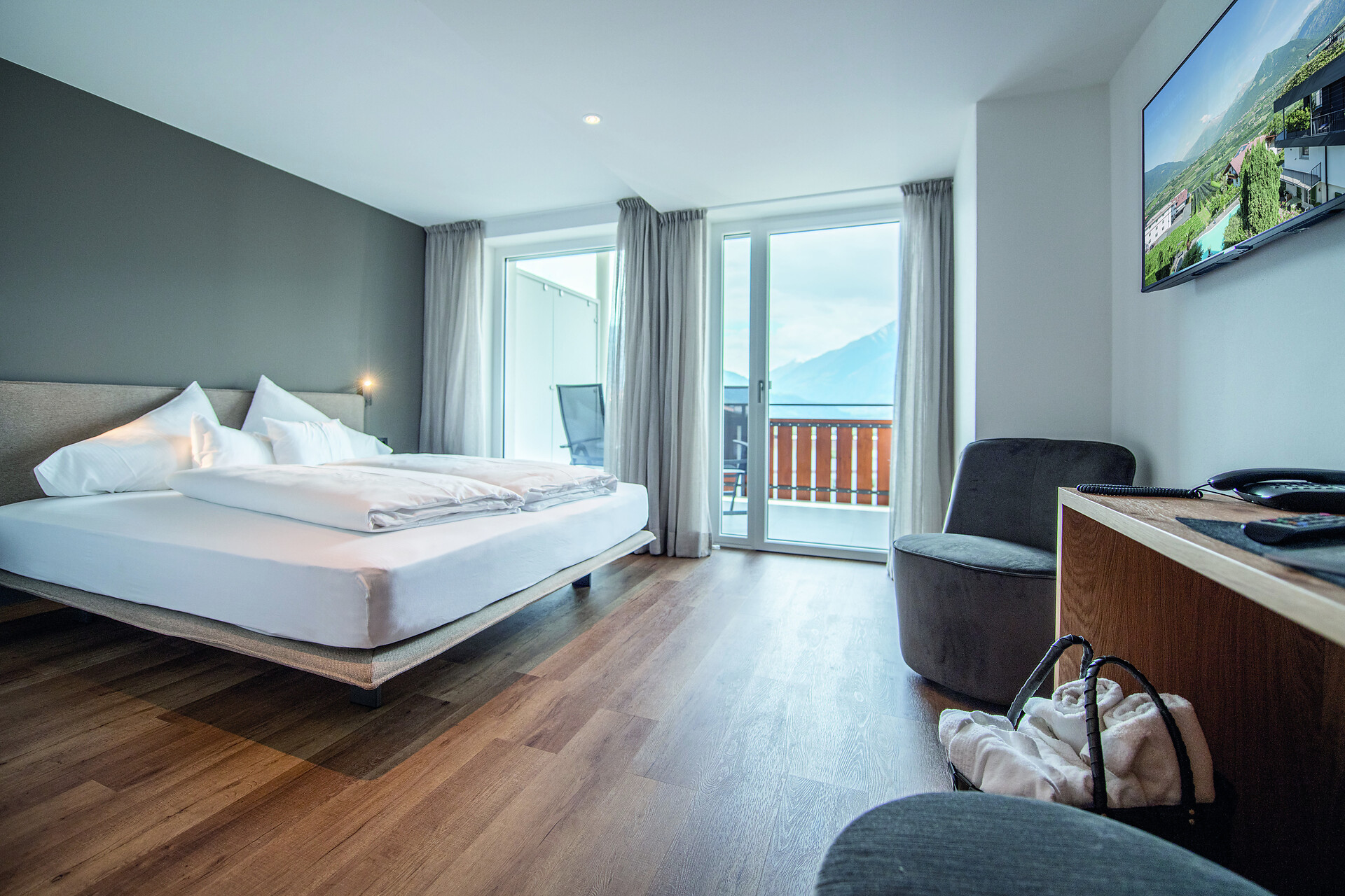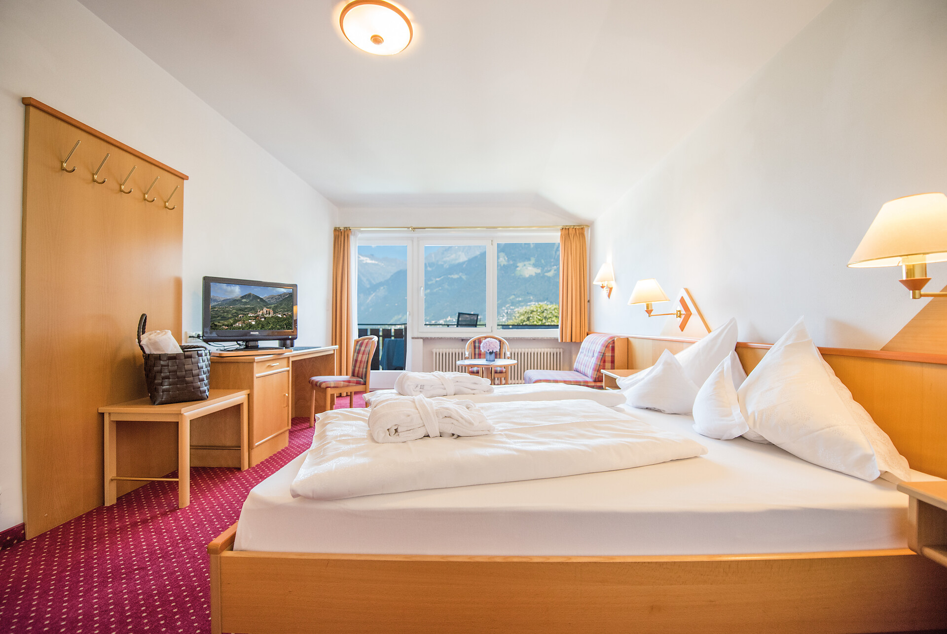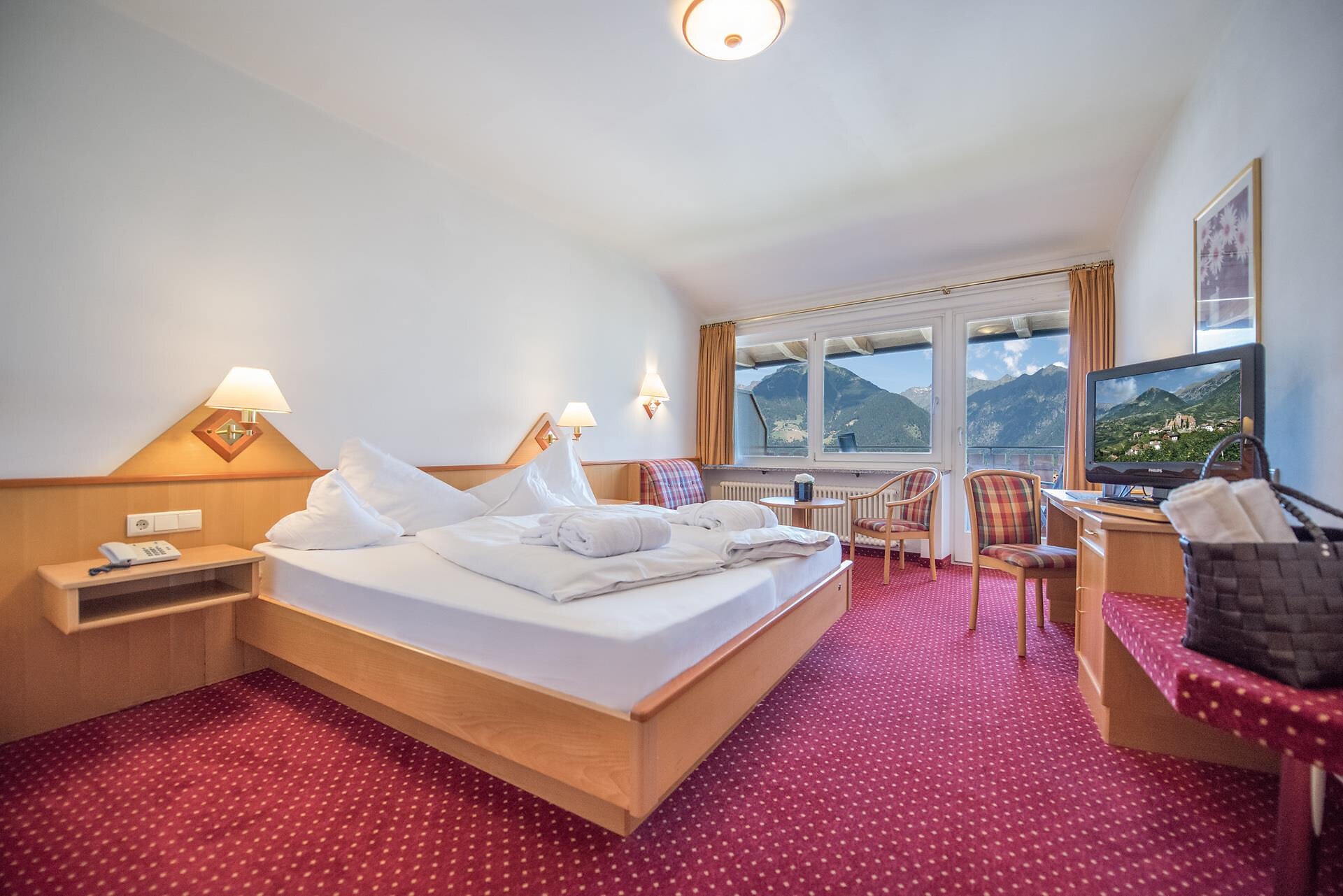 Camera doppia deluxe al 2° piano con grande balcone panoramico esposto a ovest con vista verso Merano e le montagne circostanti.