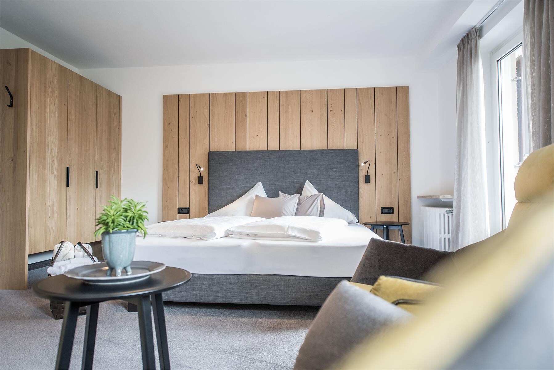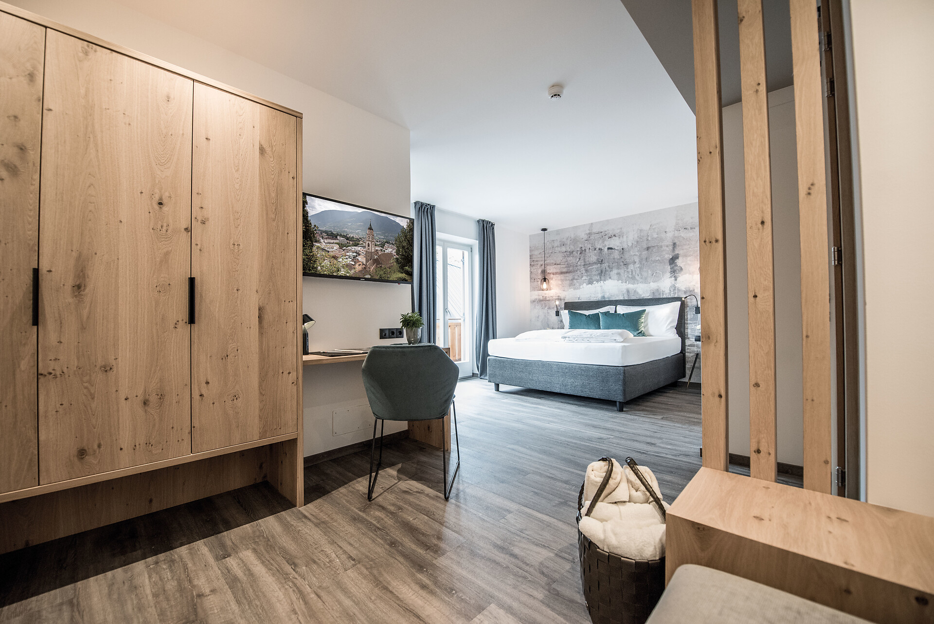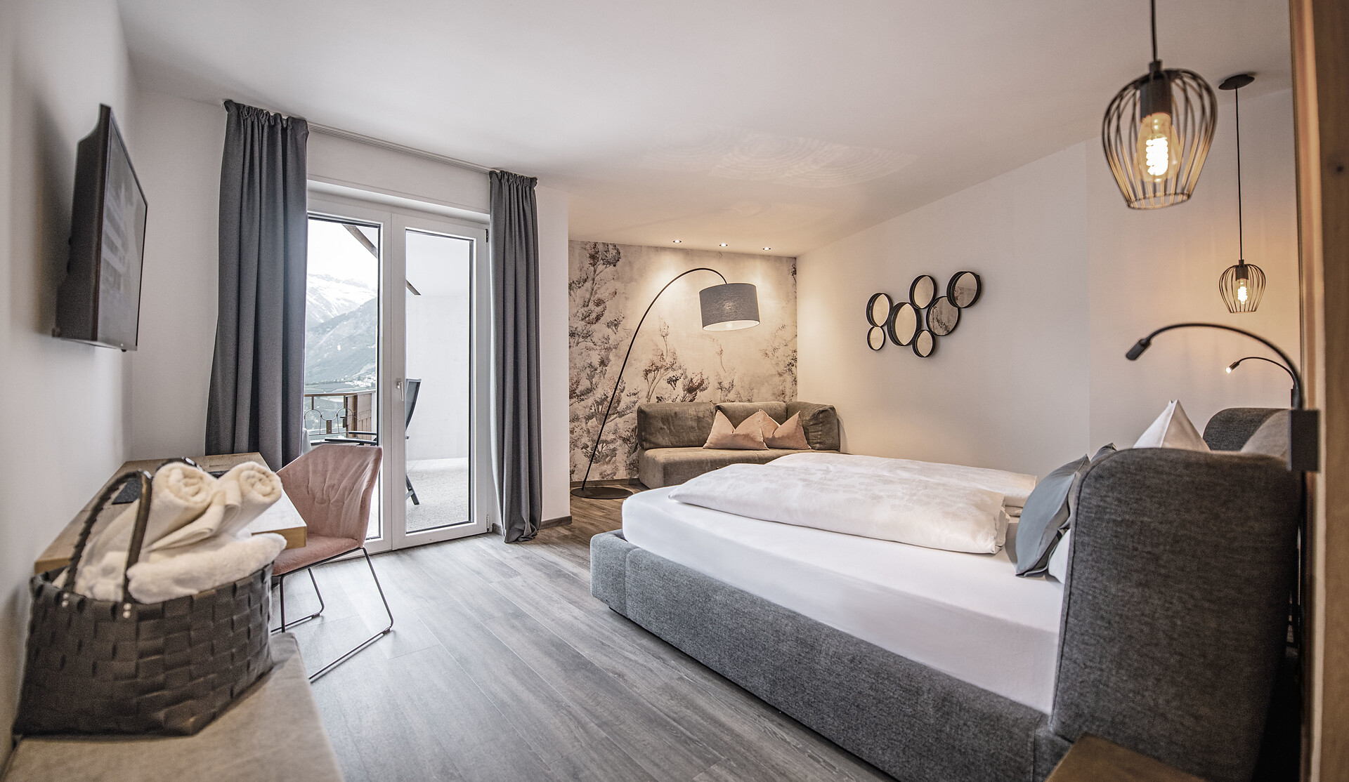Camera doppia deluxe al 2° piano con grande balcone panoramico esposto a ovest con vista verso Merano e le montagne circostanti.