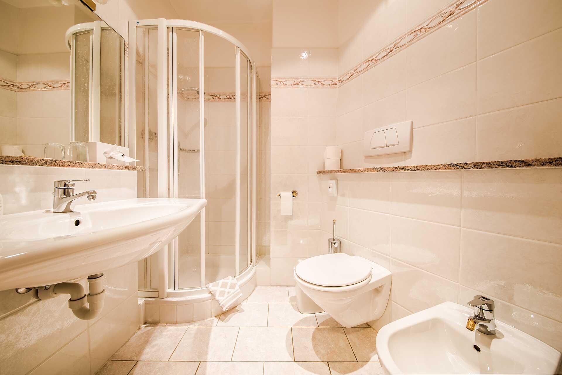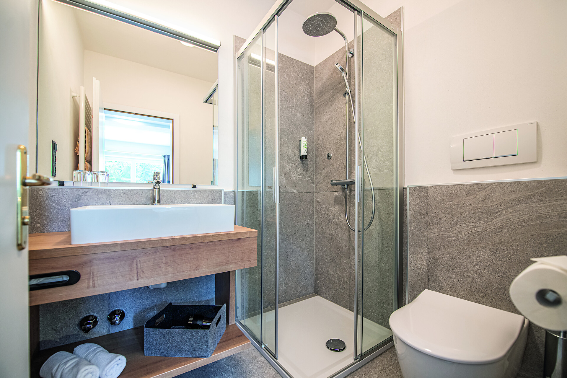 Arredato con eleganti letti, divanetto, parquet, doccia, WC, asciugacapelli, specchio trucco, telefono, cassaforte, TV HD a schermo piatto, borsa da bagno con accappatoio & telo da bagno.
