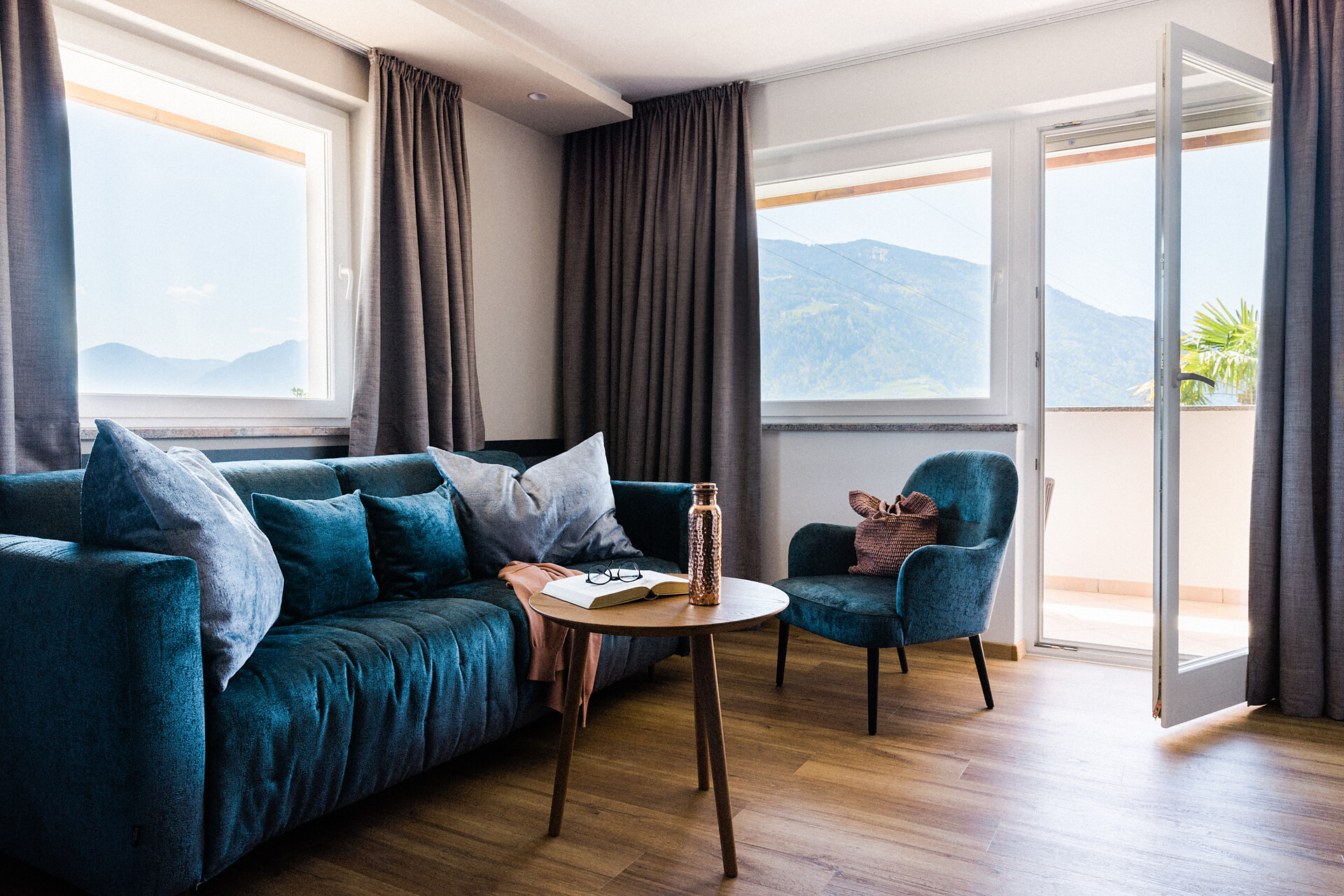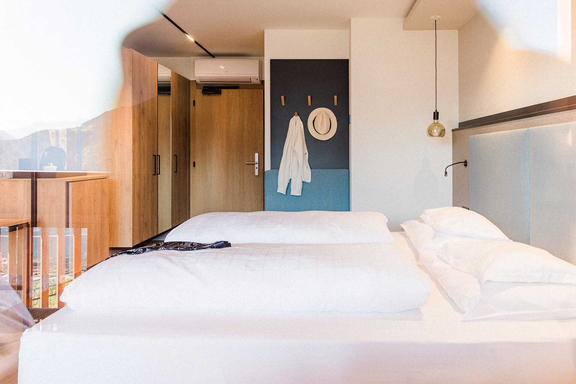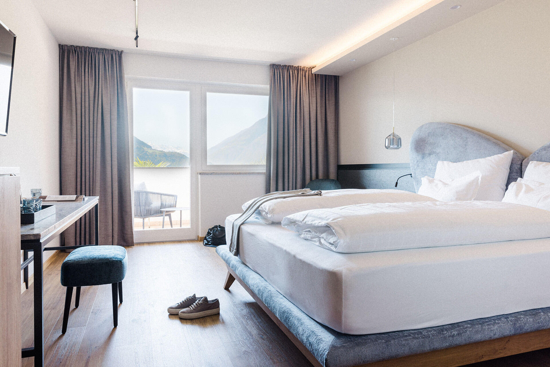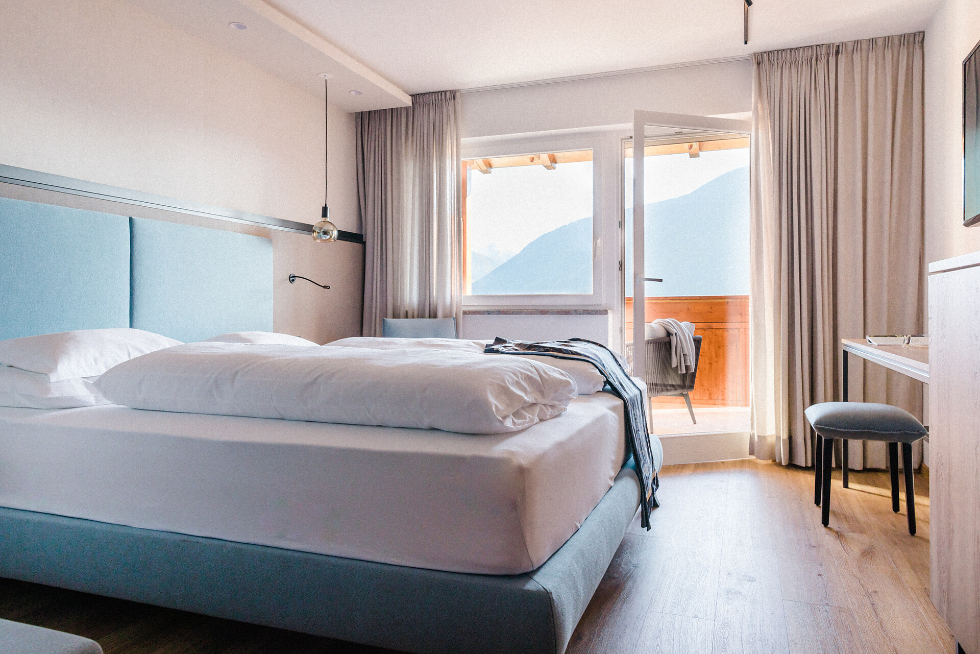 Camera doppia con aria condizionata, cabina doccia, WC, bidet, asciugacapelli, cassaforte, minibar, WLAN, pavimento in legno, TV a schermo piatto, telefono e vista panoramica verso Muthspitze.