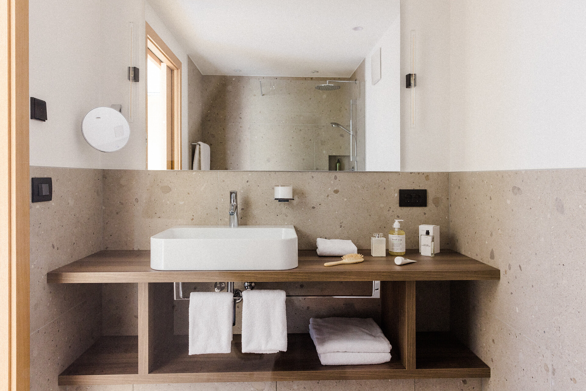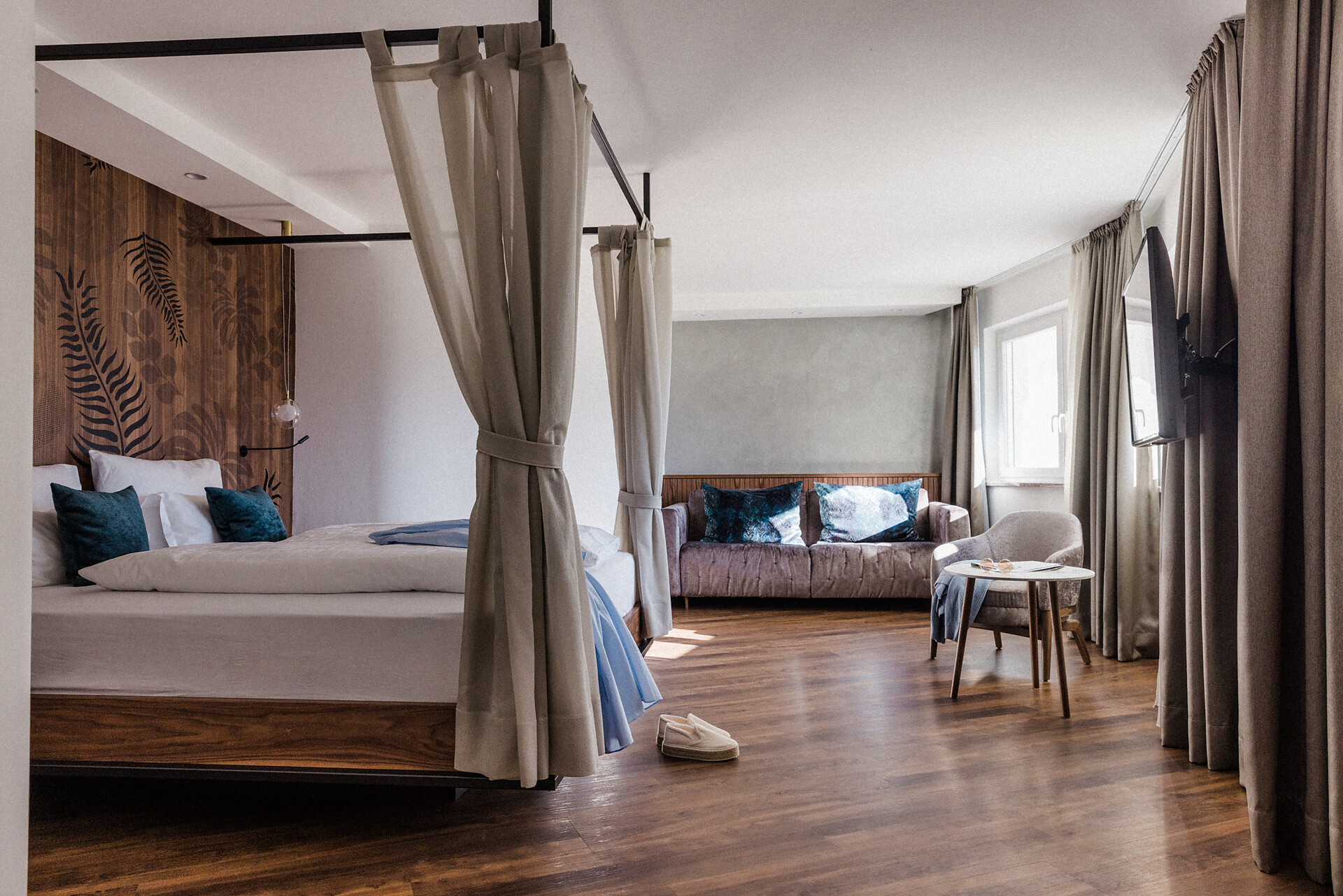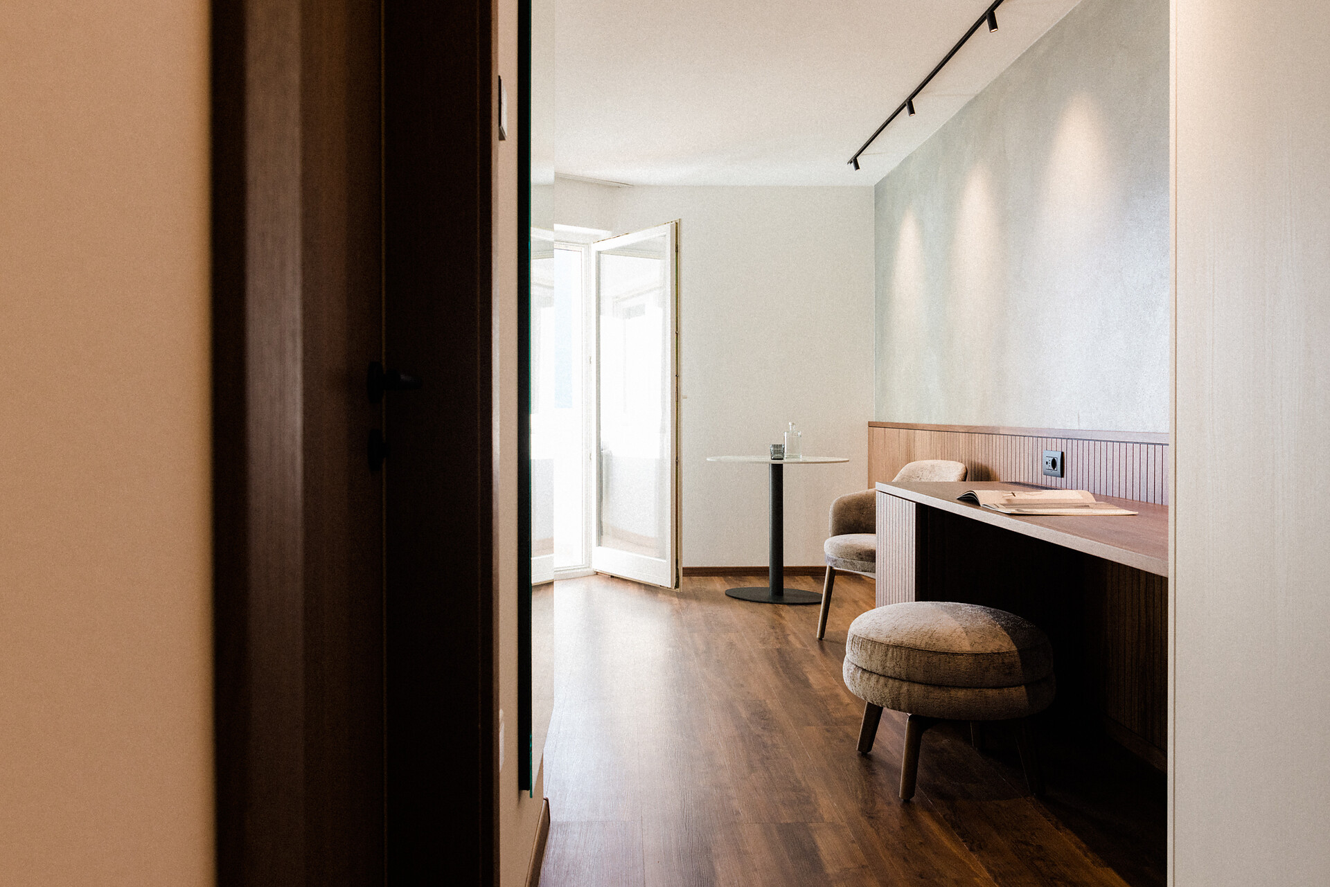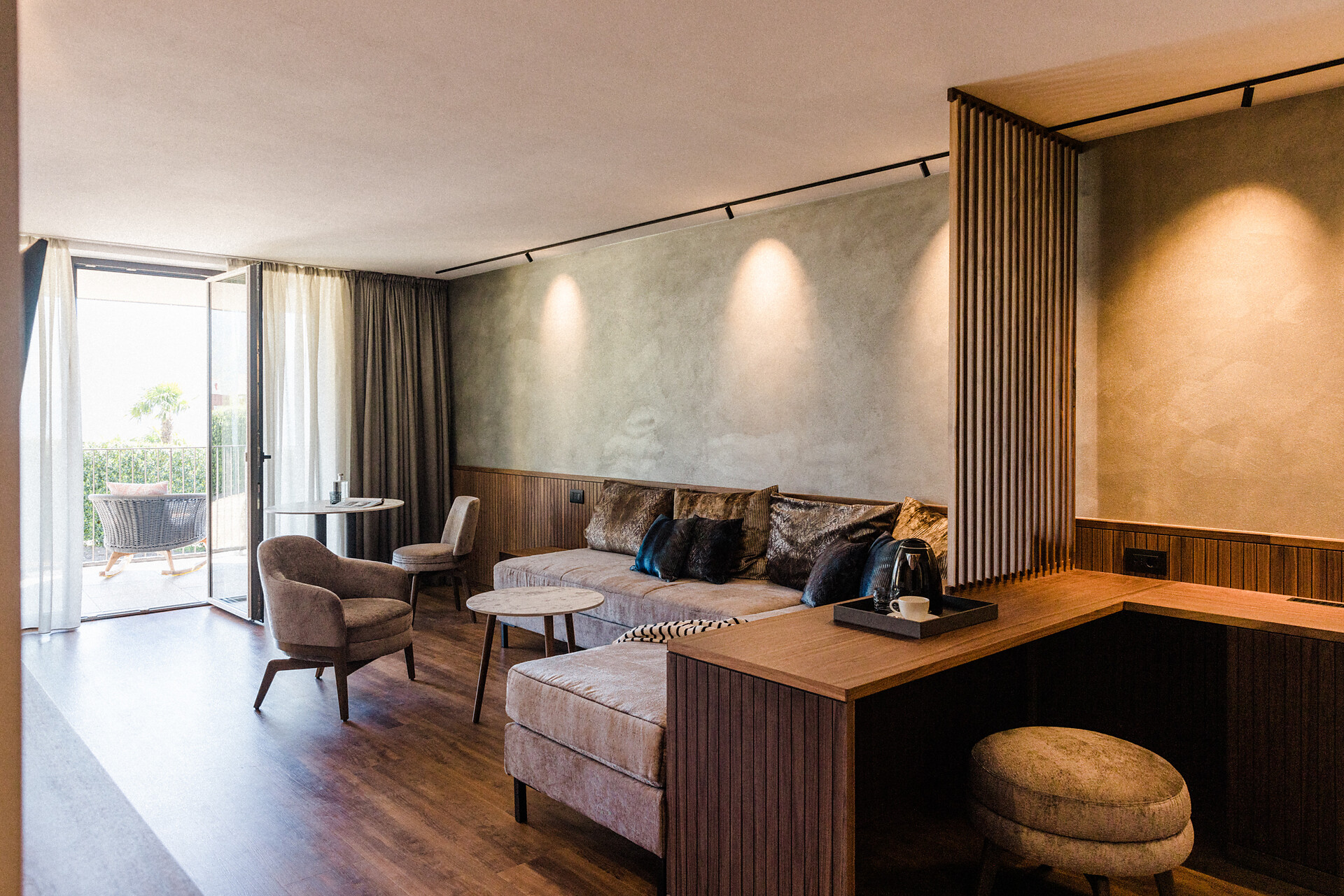 Camera doppia con aria condizionata, cabina doccia, WC, bidet, asciugacapelli, cassaforte, minibar, WLAN, pavimento in legno, TV a schermo piatto, telefono e vista panoramica verso Muthspitze.