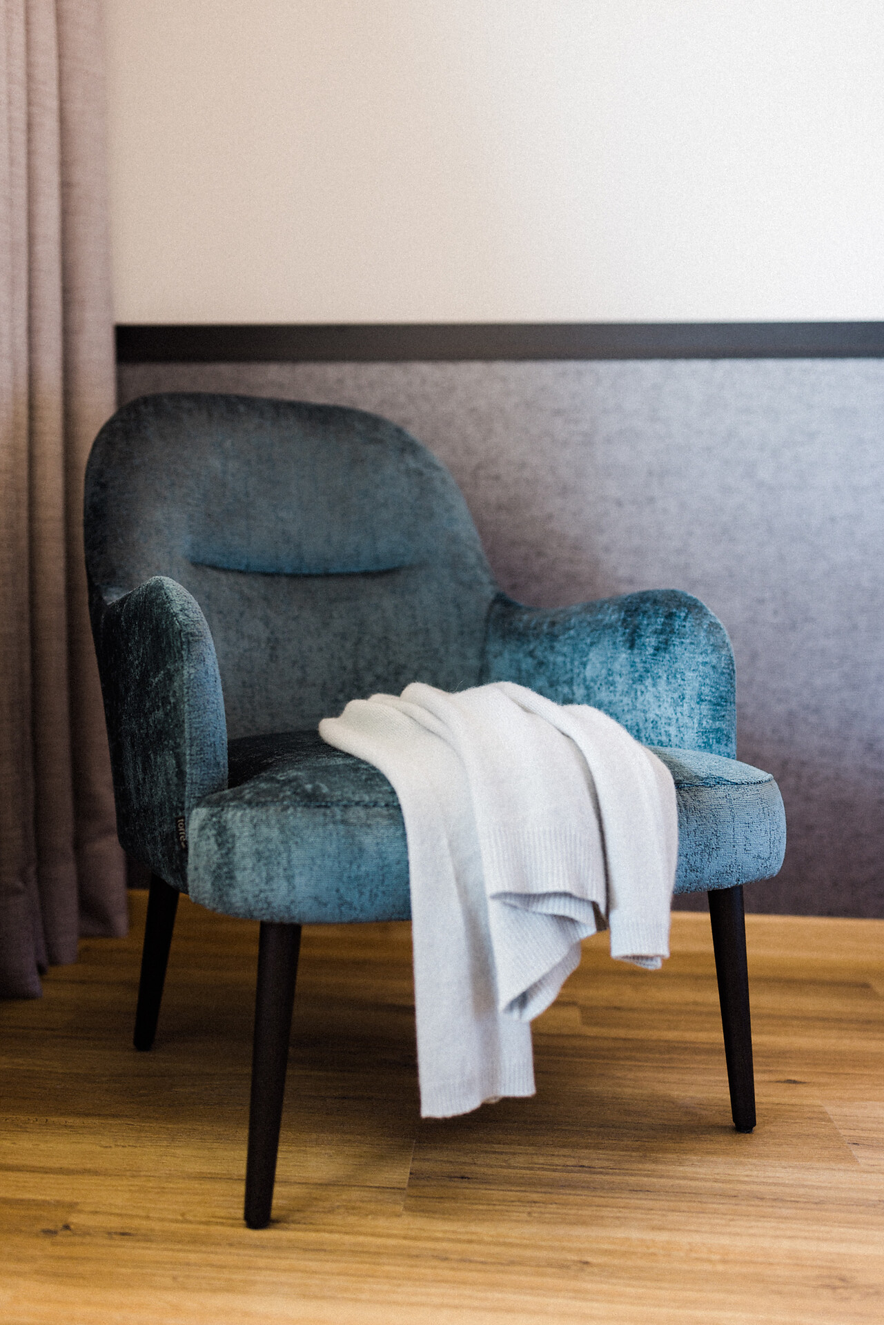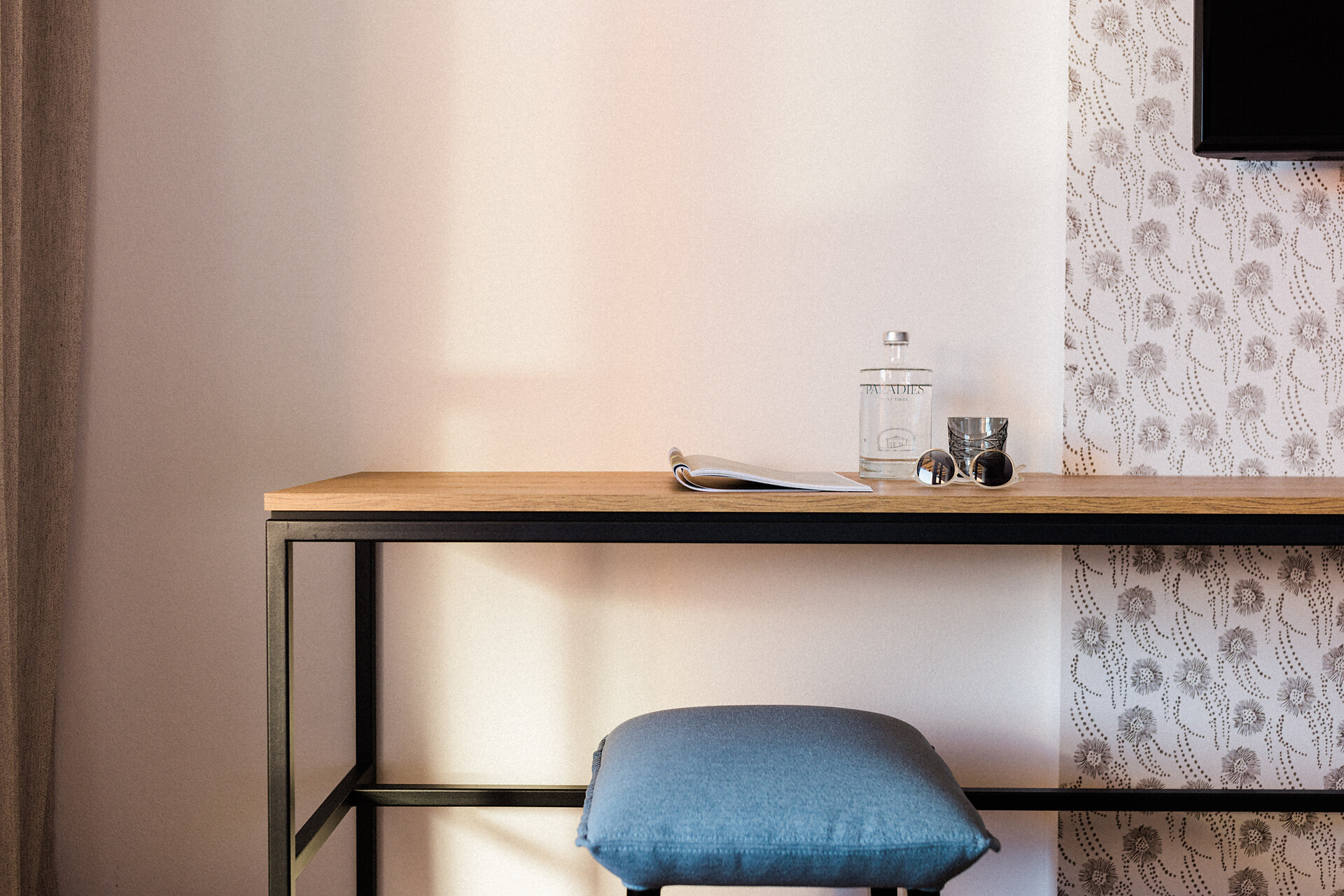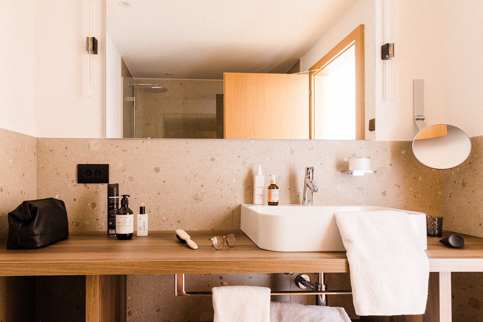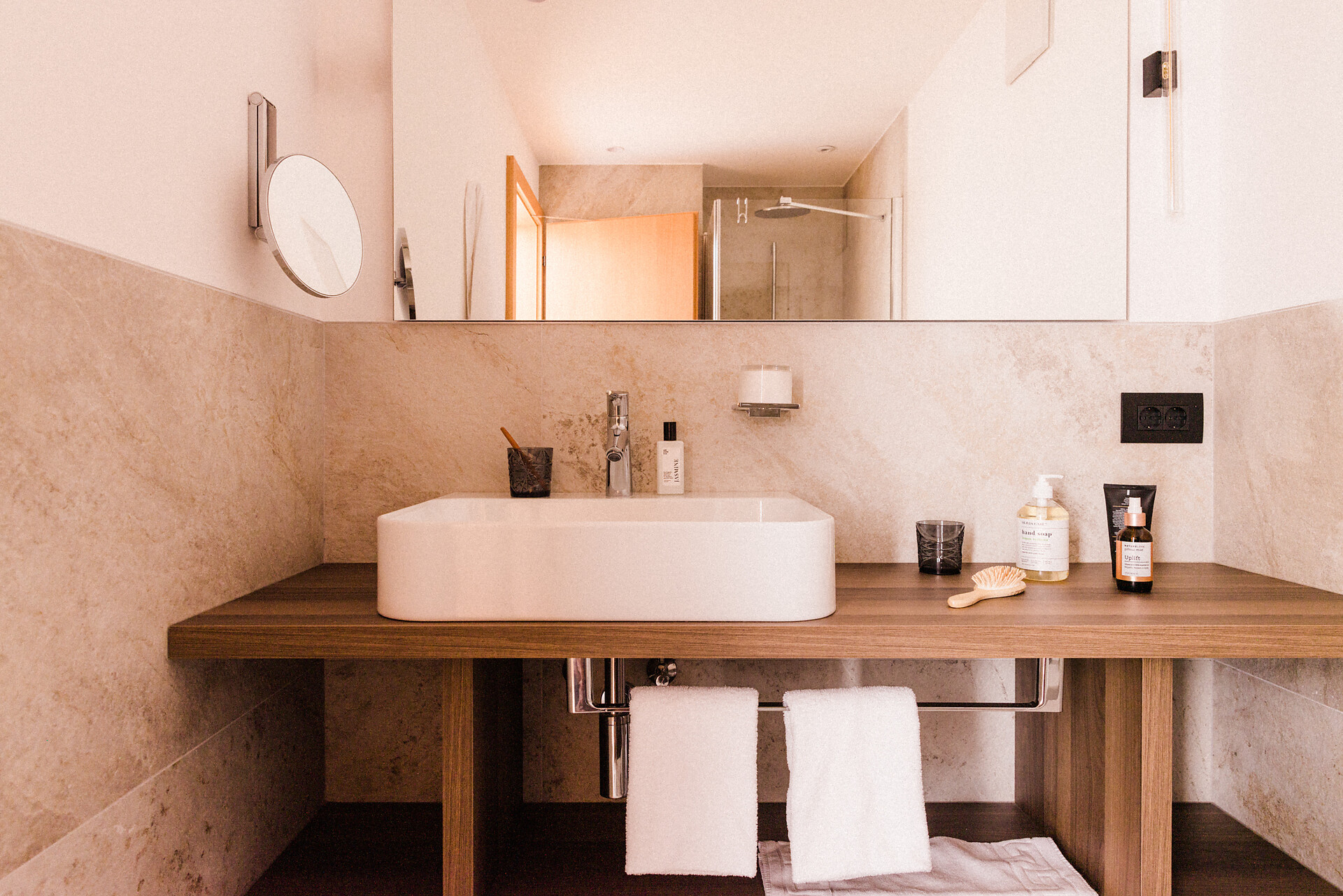 Camera doppia con aria condizionata, cabina doccia, WC, bidet, asciugacapelli, cassaforte, minibar, WLAN, pavimento in legno, TV a schermo piatto, telefono e vista panoramica verso Muthspitze.
