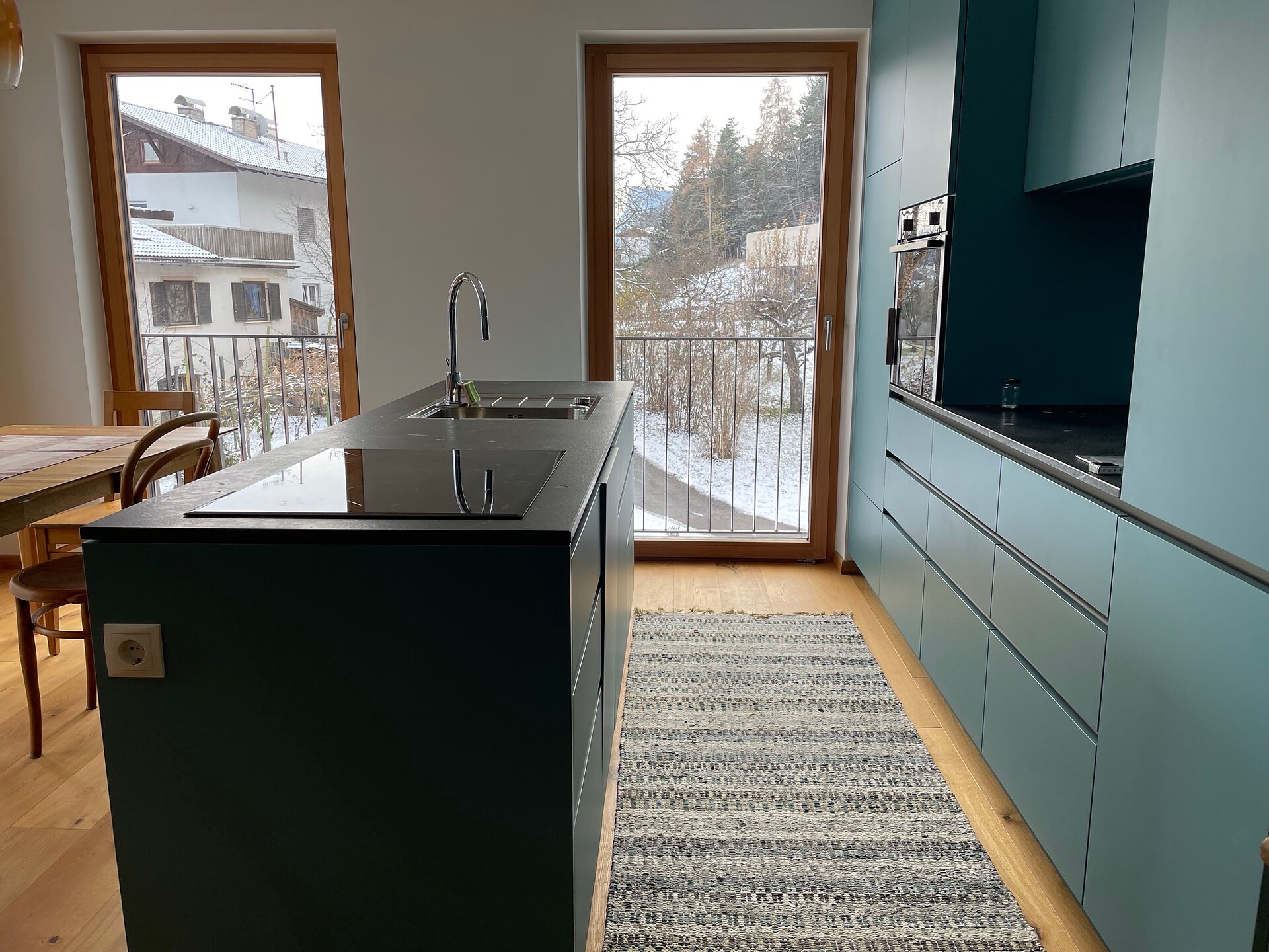 Cucina-soggiorno con piano di lavoro in basalto di Siusi