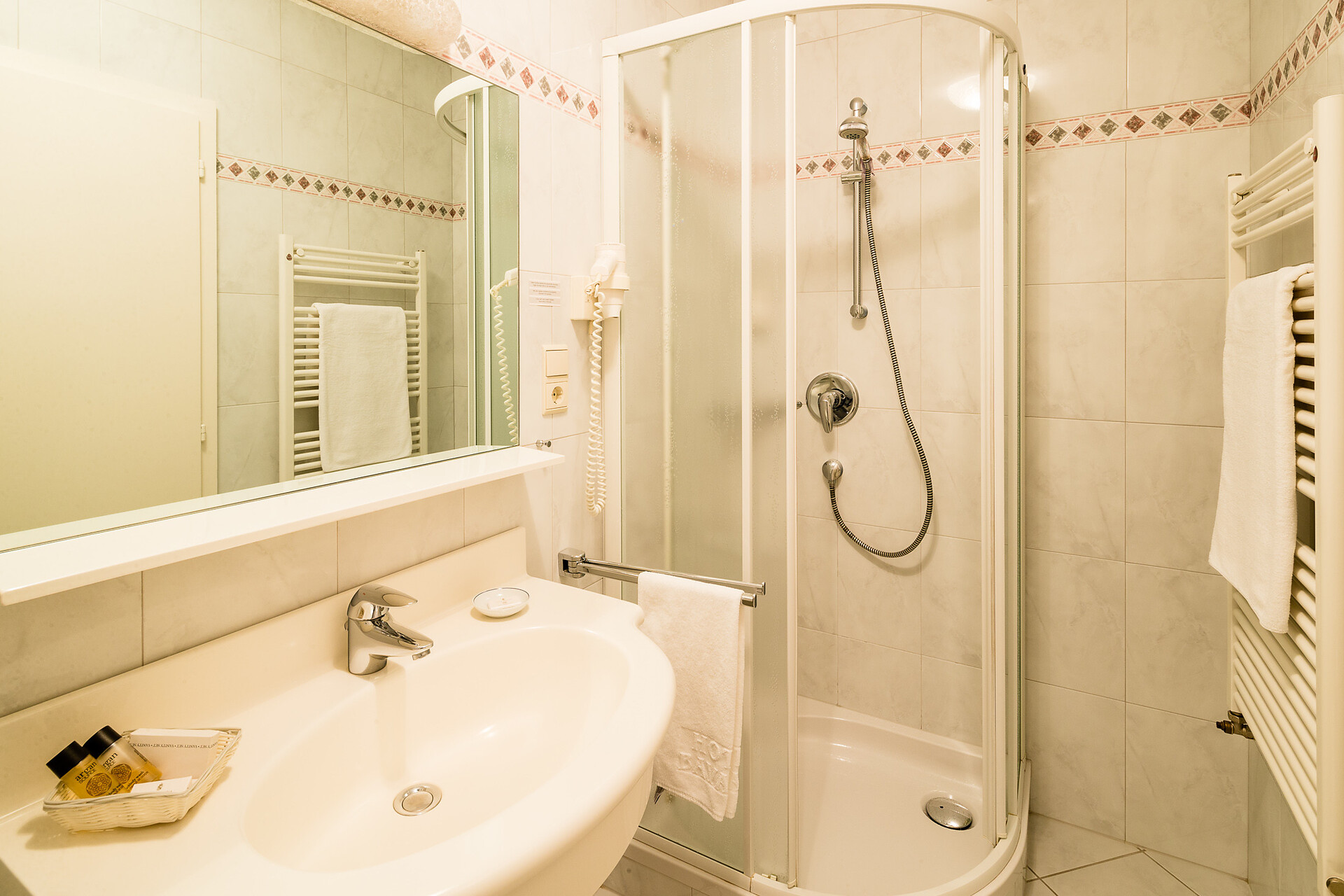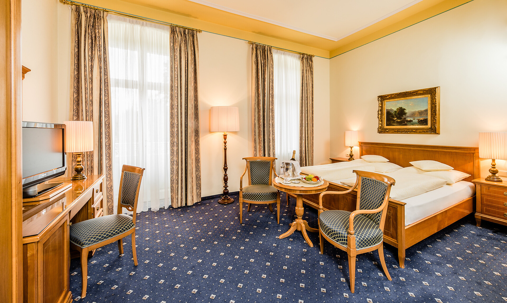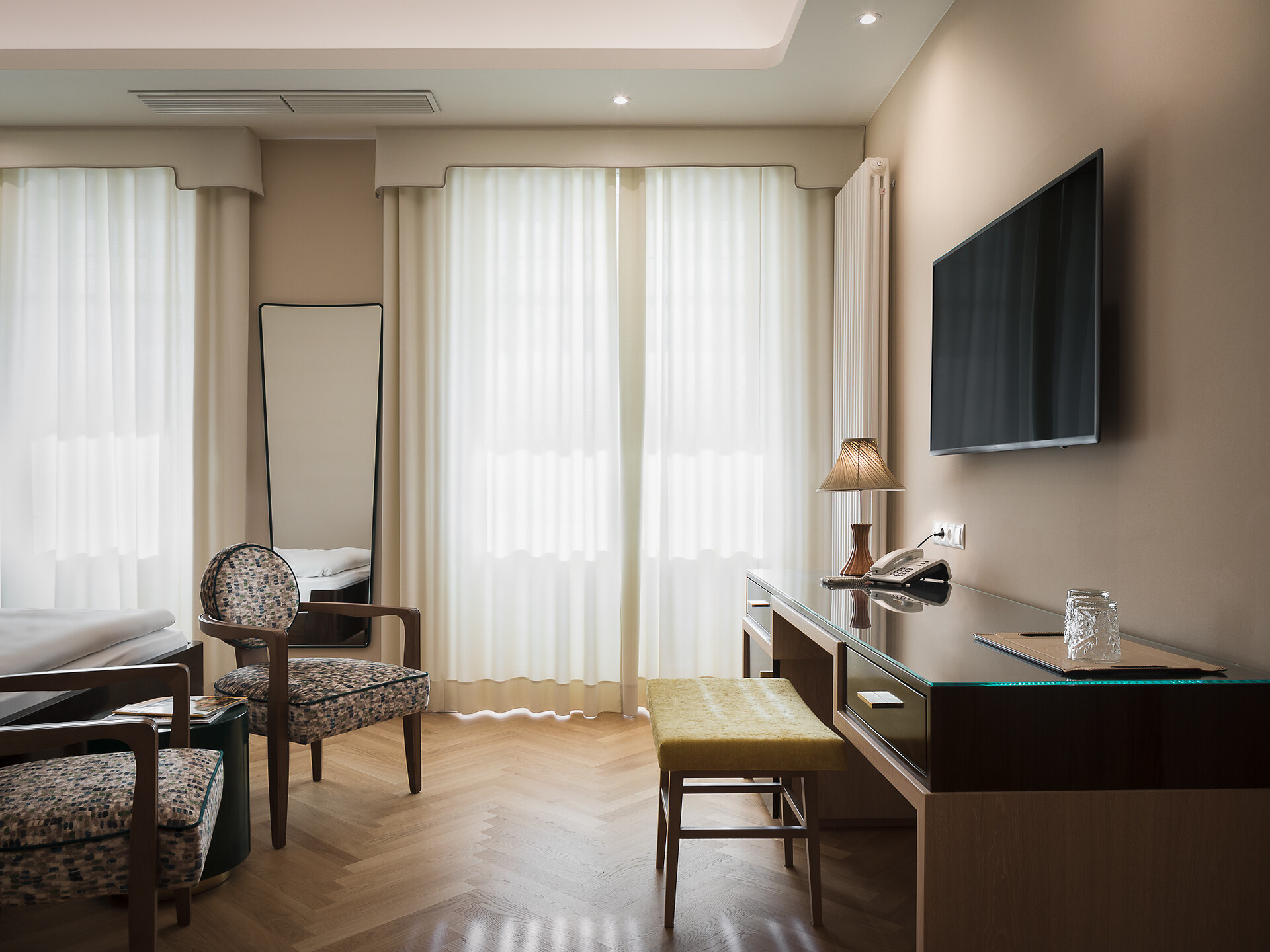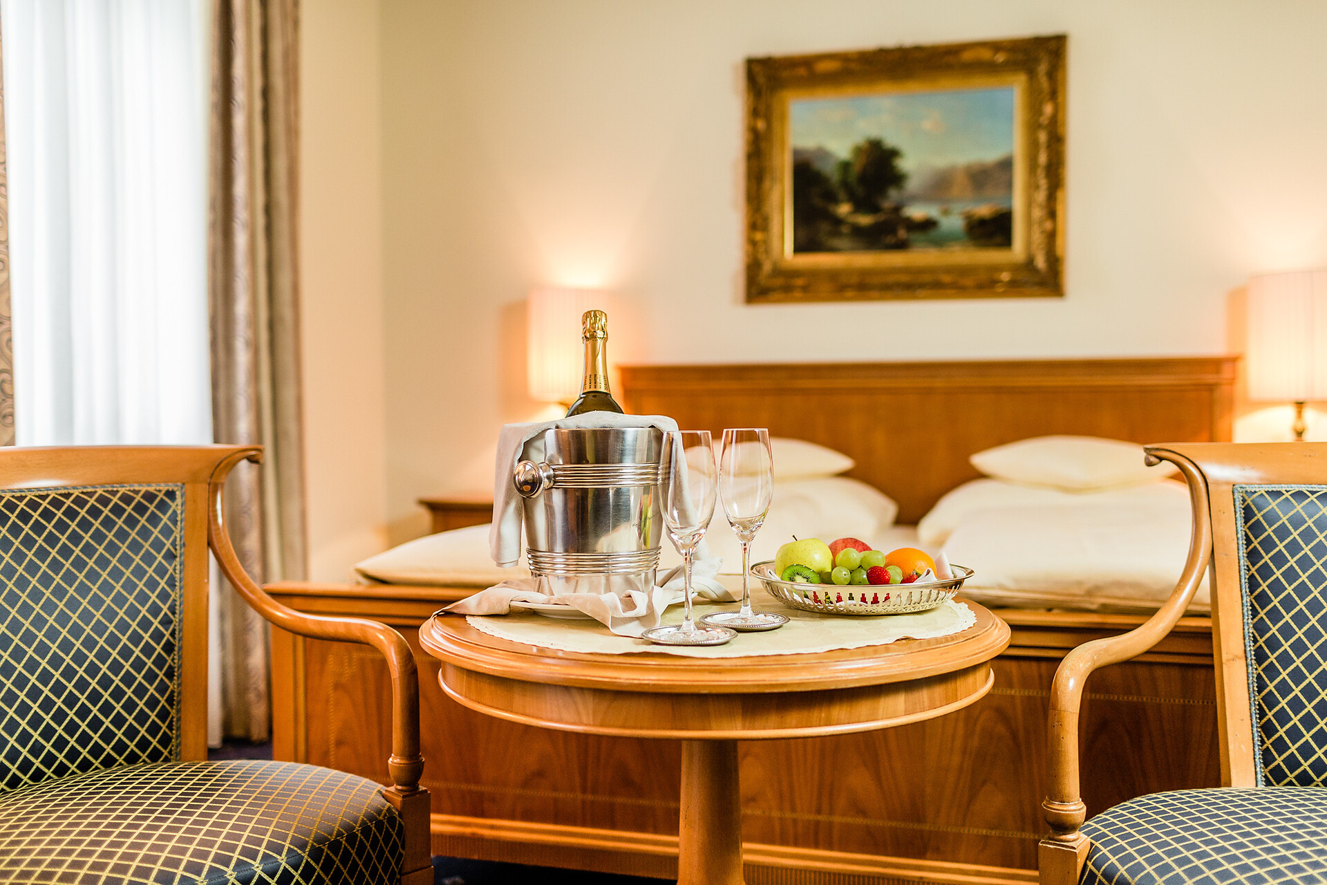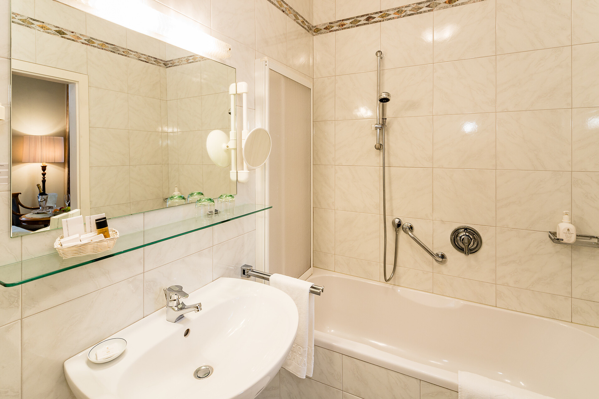 La camera singola Superior ha le seguenti caratteristiche: Pavimento in parquet, balcone esposto a sud, doccia, bidet, WC, asciugacapelli, accappatoio e pantofole, prodotti da bagno Lalique, telefono, TV, WLAN, cassaforte, minibar e aria condizionata.