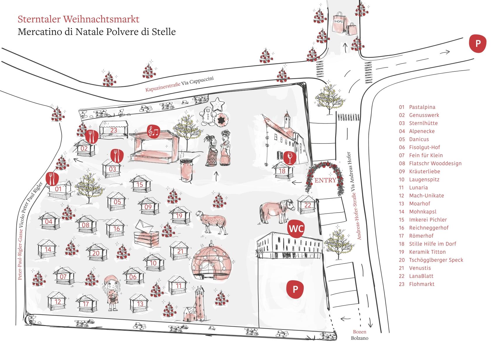 Vin brulé, brulé alla mela, tè, birra “Psairer Bier“, succhi, prosecco, Xmas-spritz, vino bianco e rosso della cantina Merano, chili con carne, involtini fritti di verdure alla griglia, di crauti o di strudel di mele, canederli dolci di ricotta con cuore di cioccolato.