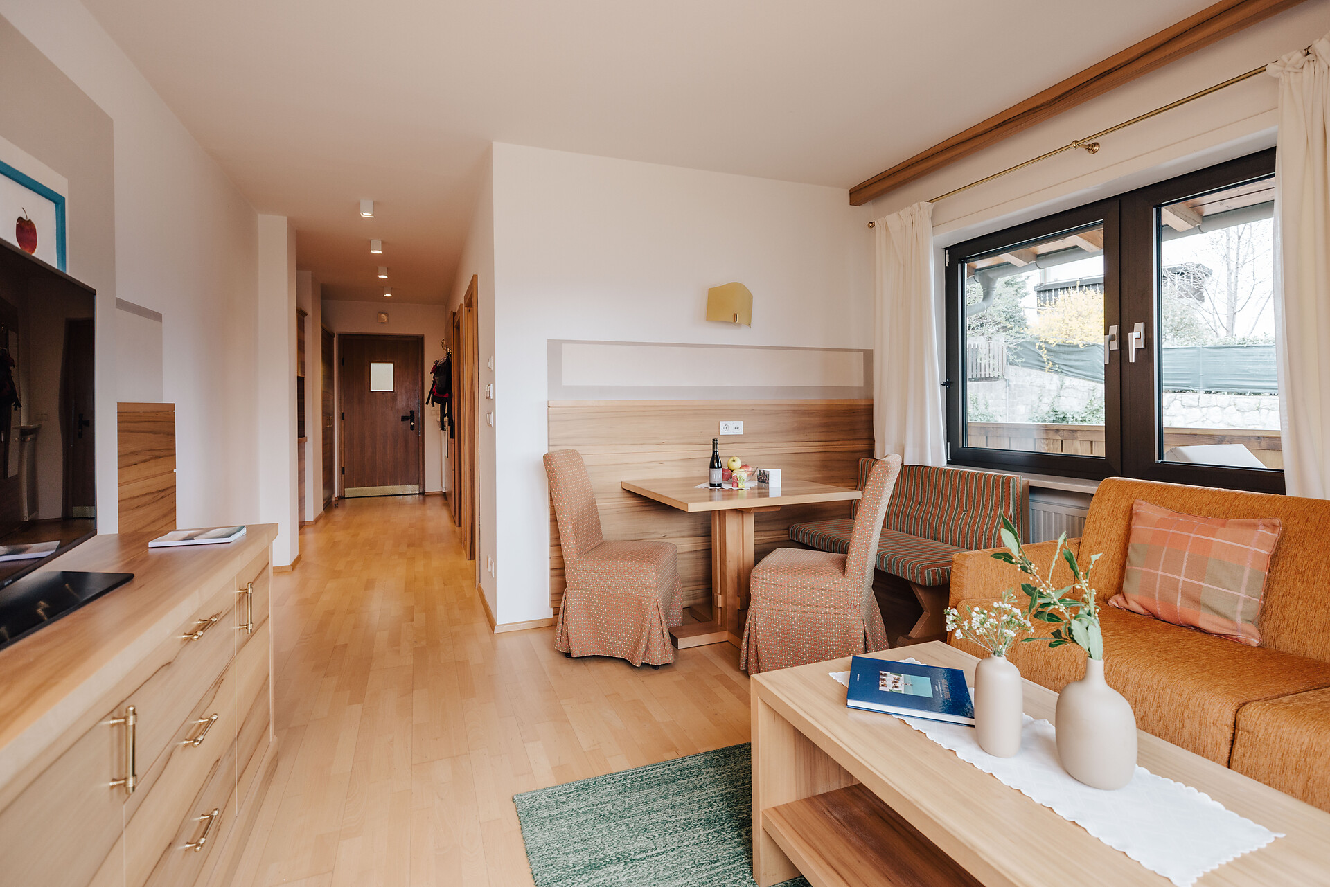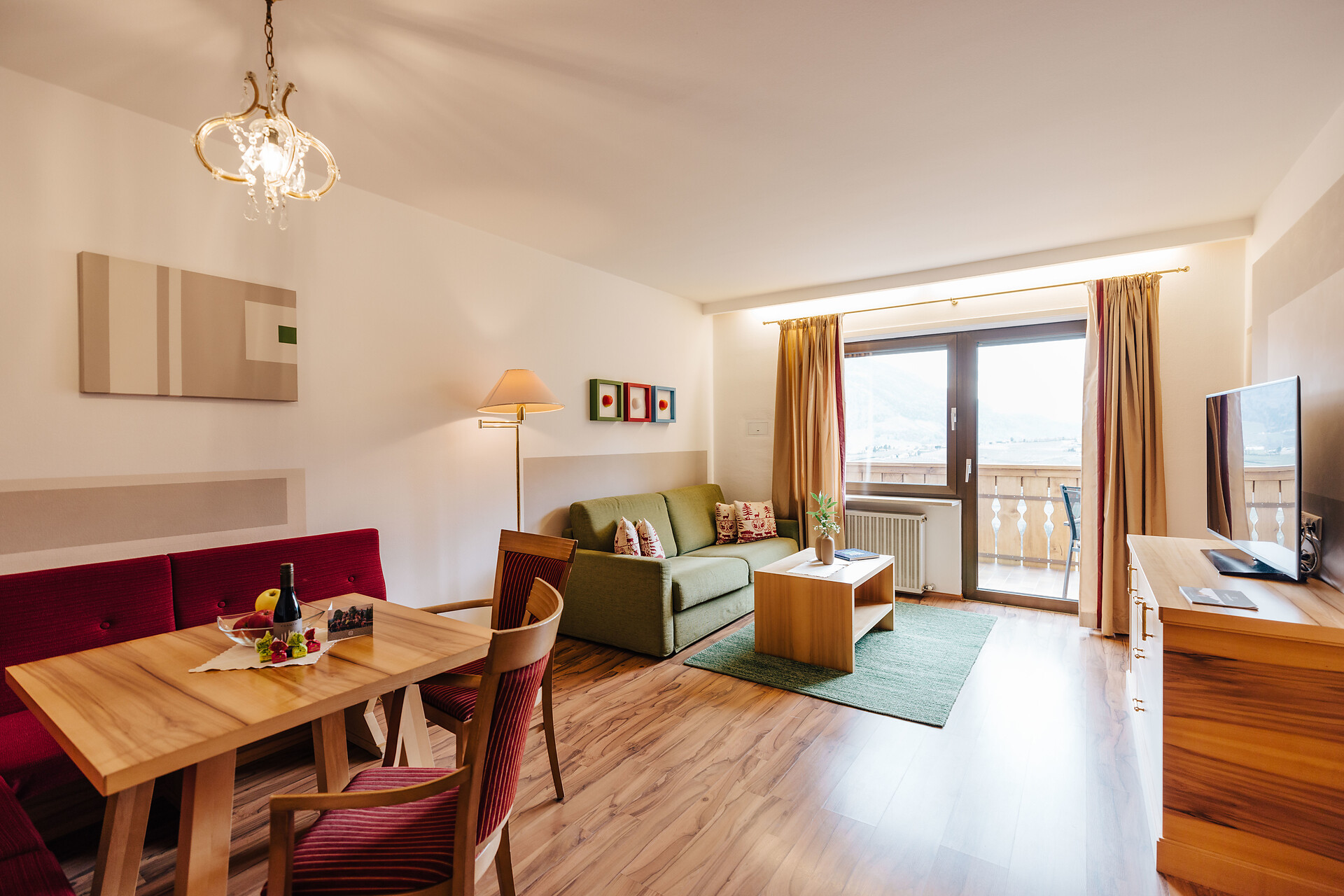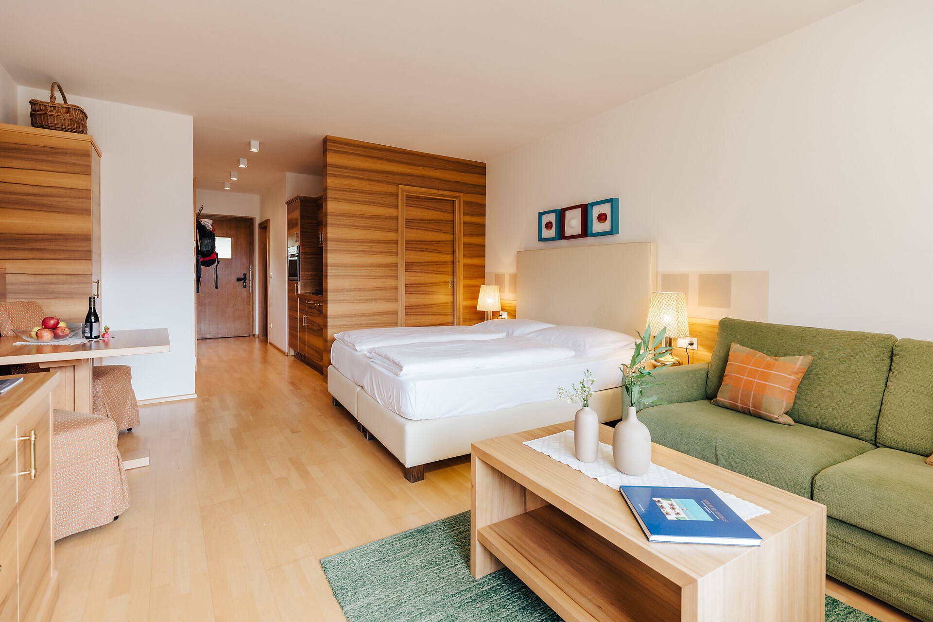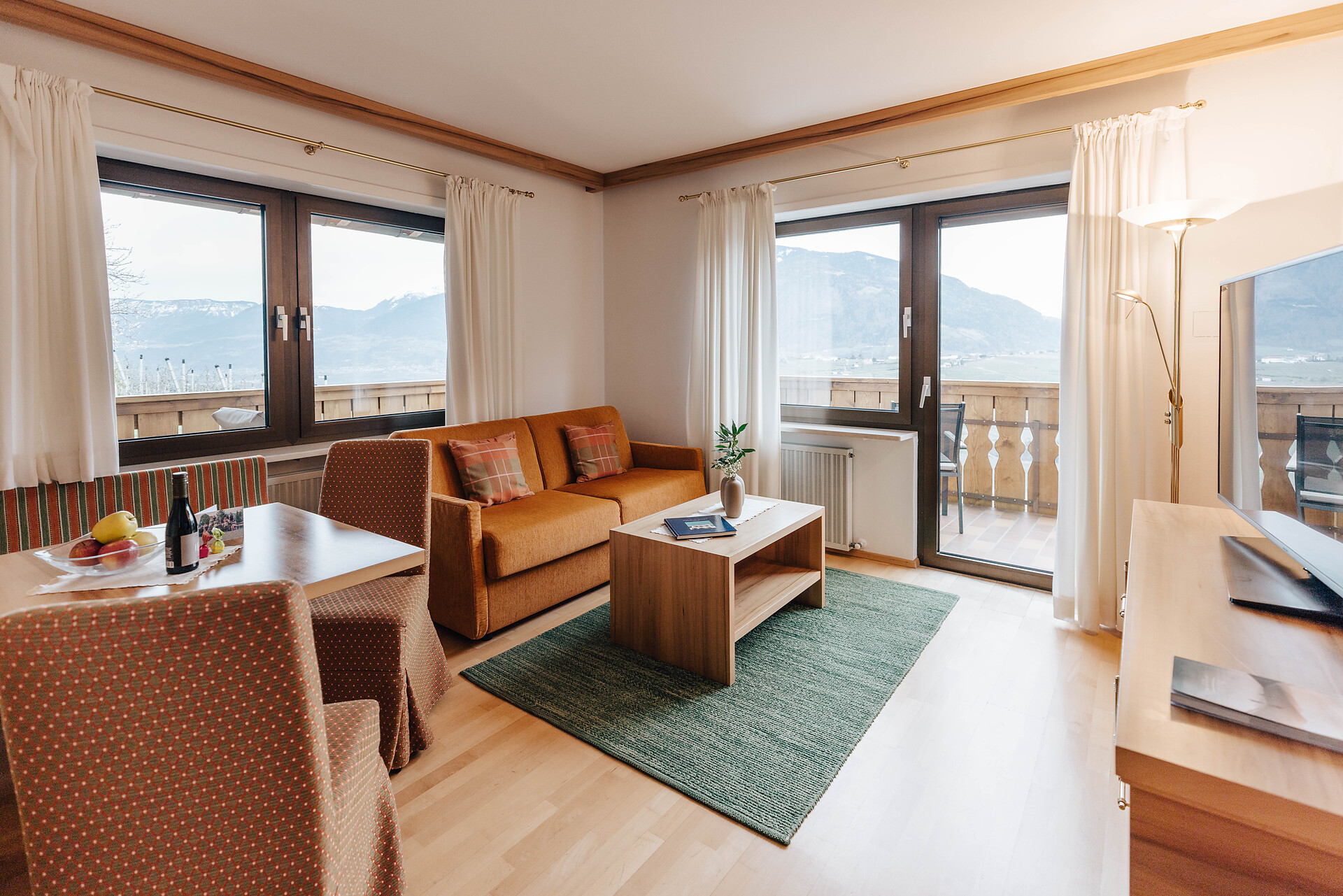 Grande appartamento per quattro persone. L’appartamento Küchelberg dispone su 80 m² di due camere con letti matrimoniali, un soggiorno, una cucina abitabile completamente arredata e un grande bagno con doccia, vasca, bidet e WC separato. La terrazza è il luogo ideale per una piacevole colazione sulle comode sedie a sdraio, si può godere il meraviglioso parco e i dintorni.