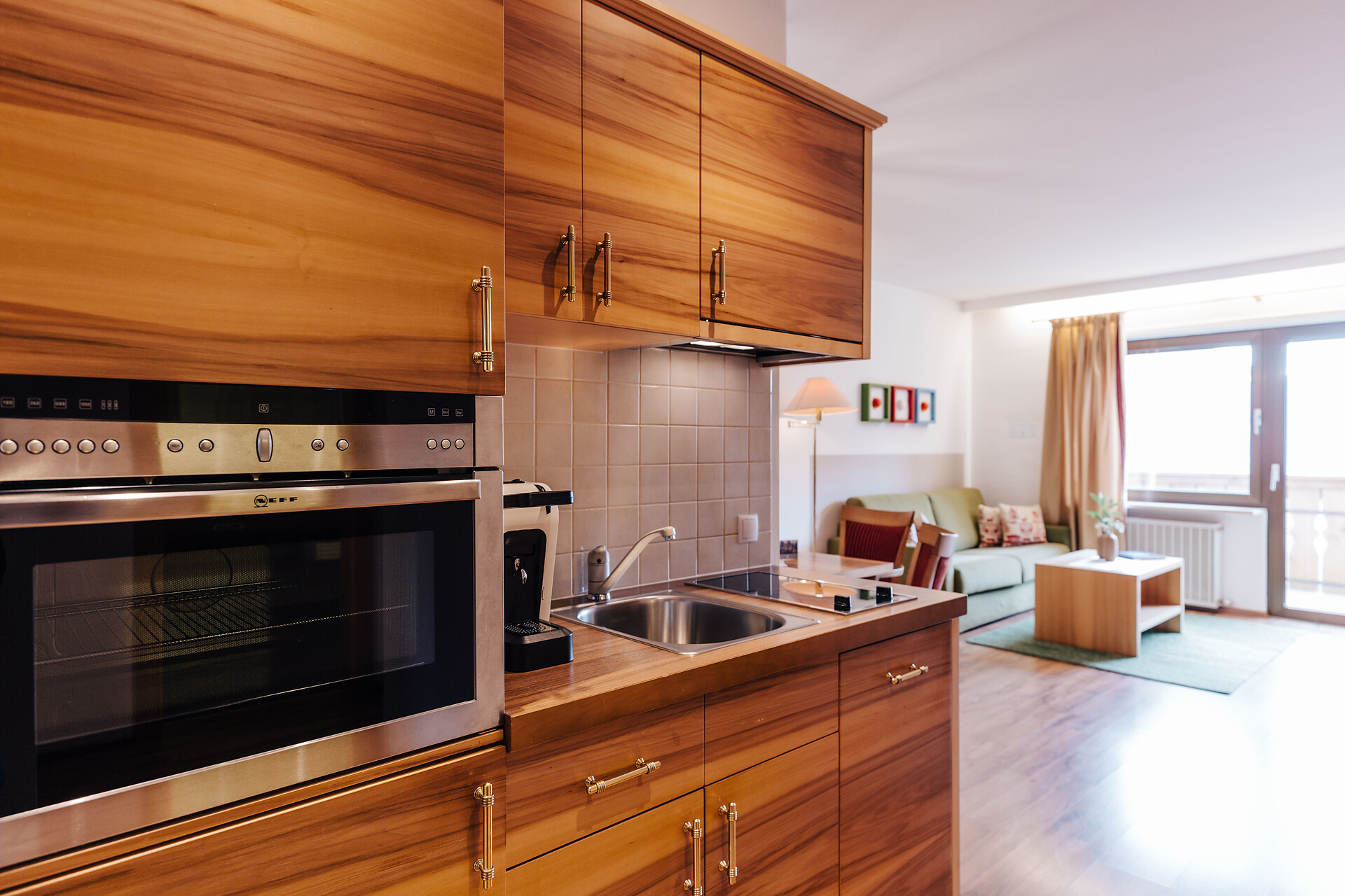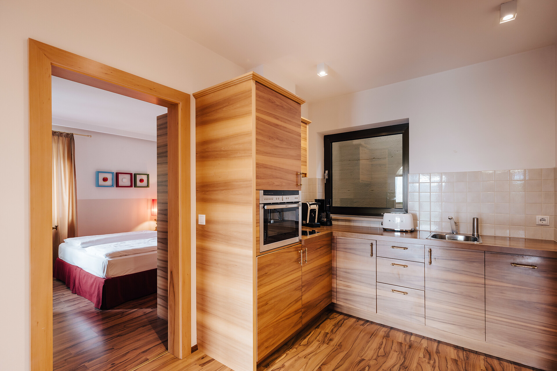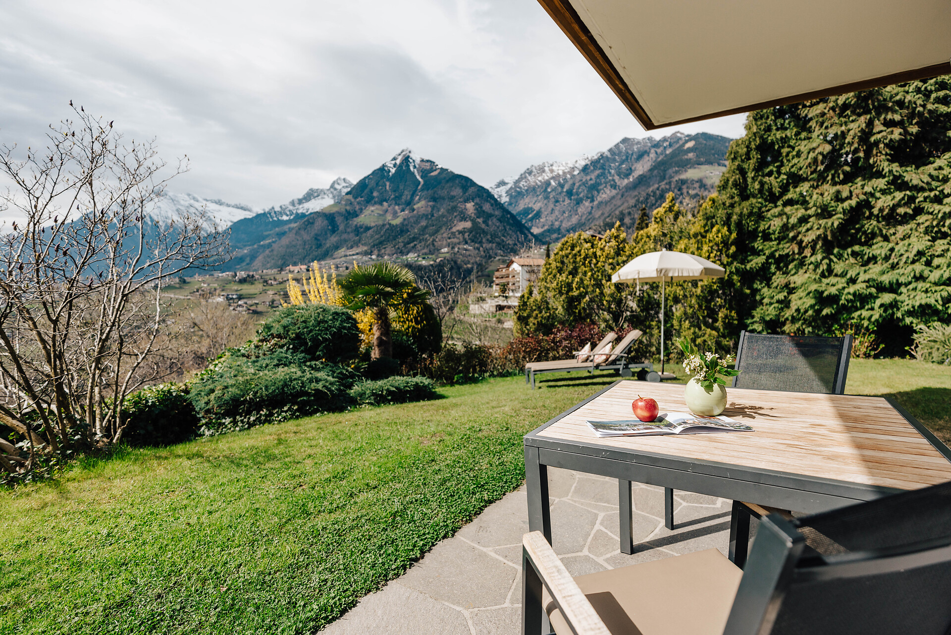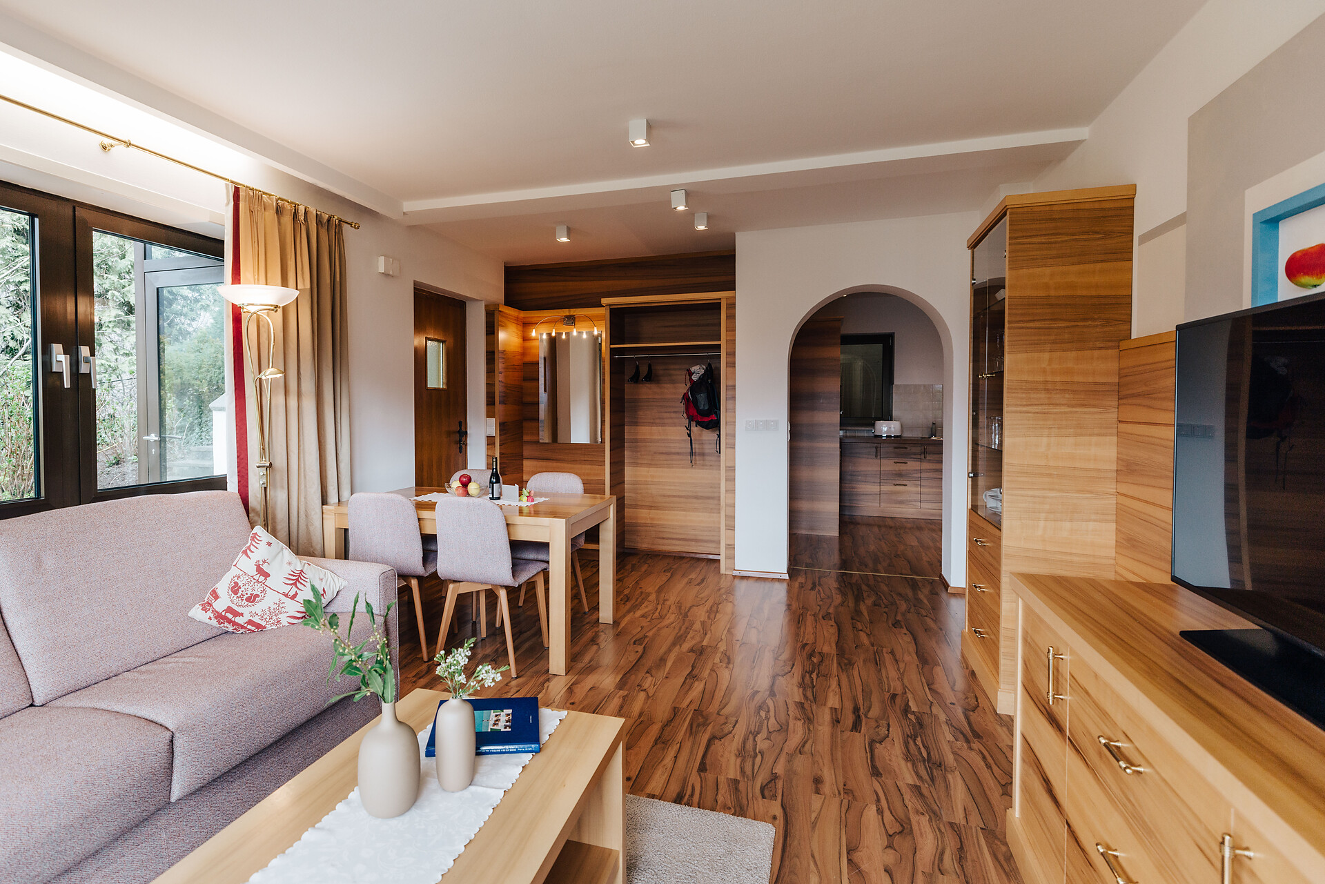 Grande appartamento per quattro persone. L’appartamento Küchelberg dispone su 80 m² di due camere con letti matrimoniali, un soggiorno, una cucina abitabile completamente arredata e un grande bagno con doccia, vasca, bidet e WC separato. La terrazza è il luogo ideale per una piacevole colazione sulle comode sedie a sdraio, si può godere il meraviglioso parco e i dintorni.