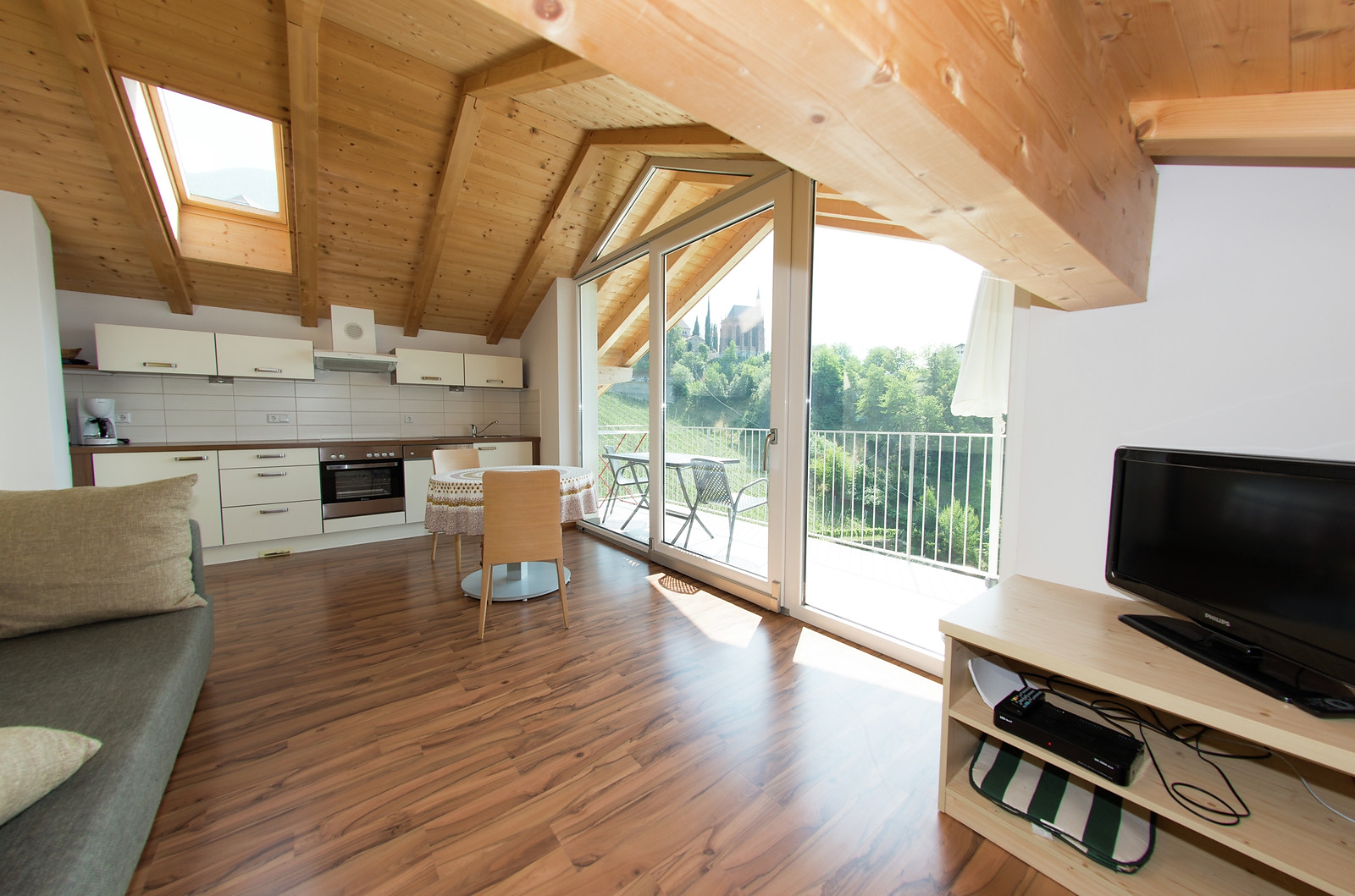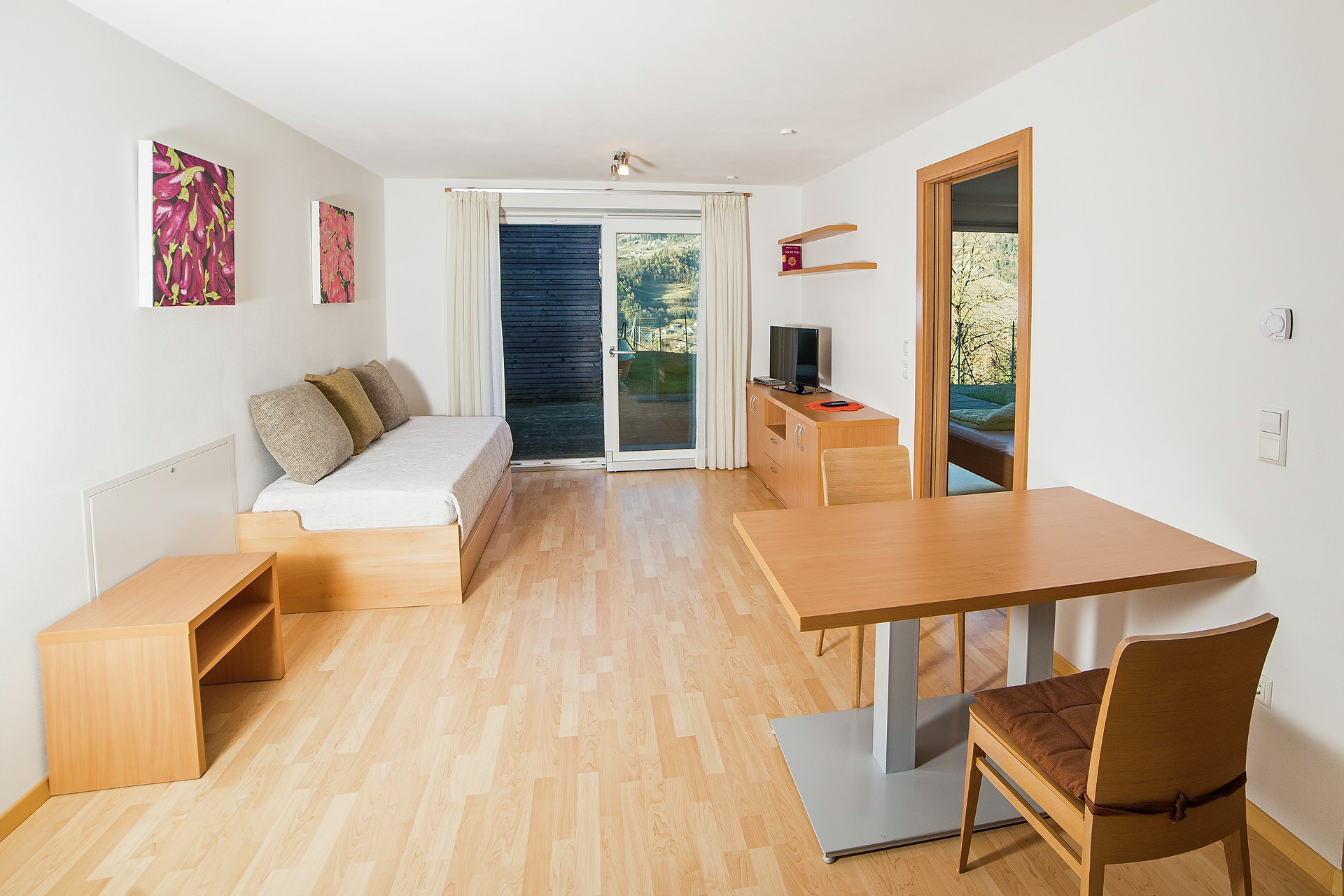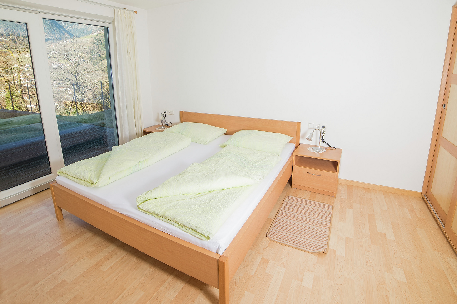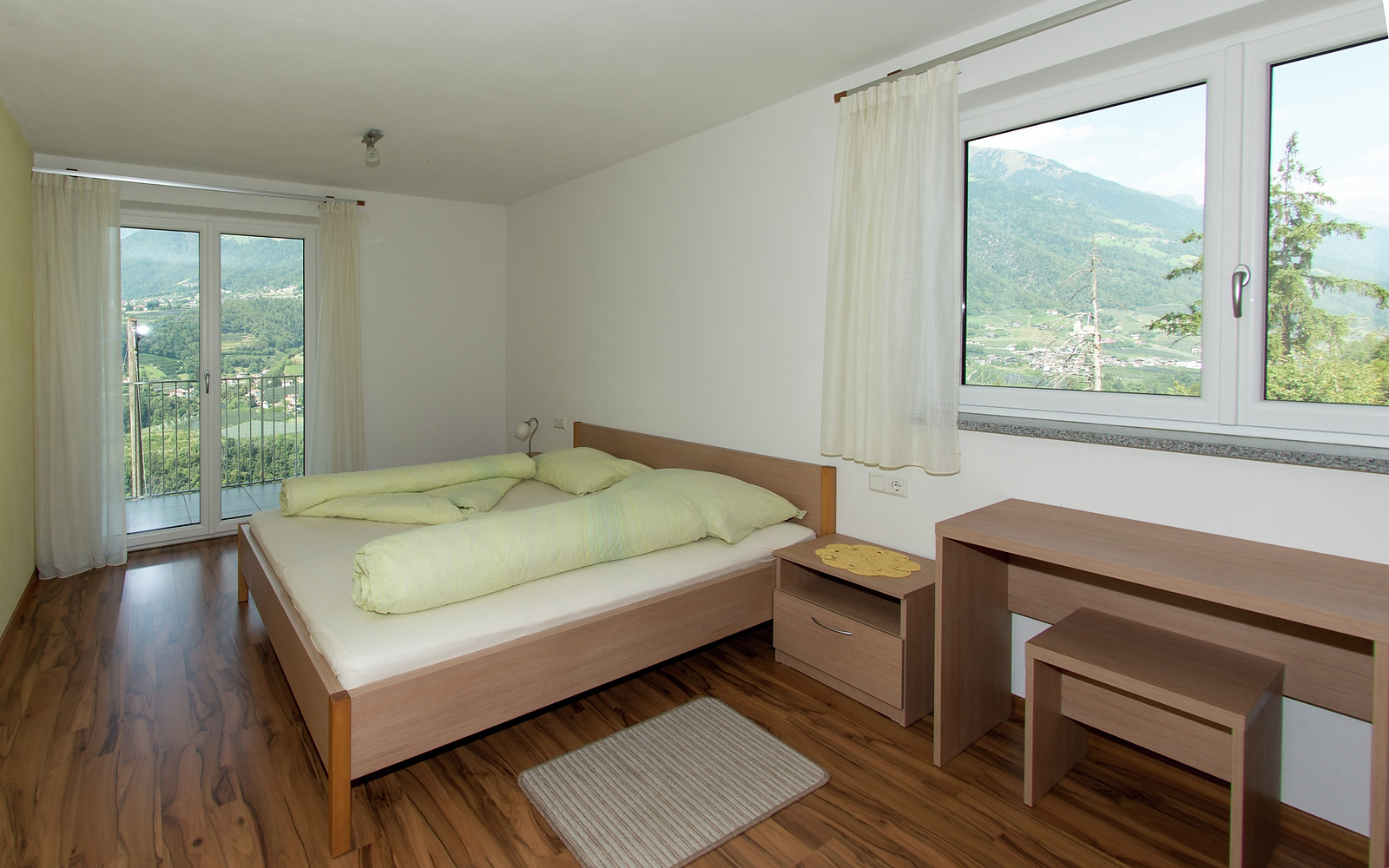 Appartamento tipo “Westside” per quattro persone con vista verso ovest. L’appartamento dispone di una terrazza, che dá verso ovest ed offre una splendida vista sulla valle. È composto da una camera da letto matrimoniale, un soggiorno, dotato di divano-letto a due piazze, un angolo cottura (fornelli elettrici, frigorifero, lavastoviglie, forno, macchinetta del caffé e un servizio di piatti completo) e un bagno con doccia e WC. Inoltre dispone di televisione satellitare e di una cassaforte. Wi-FI, le lenzuola, gli asciugamani, il lettino per il bambino e il posto macchina sono compresi nel prezzo.