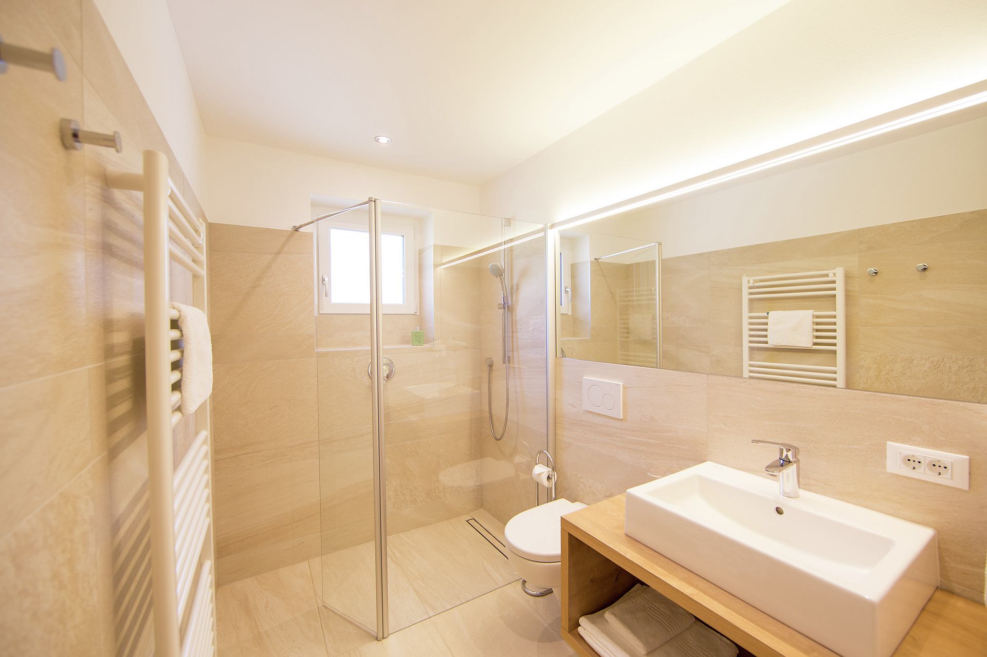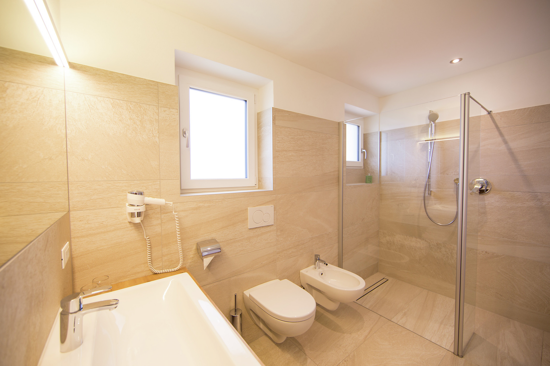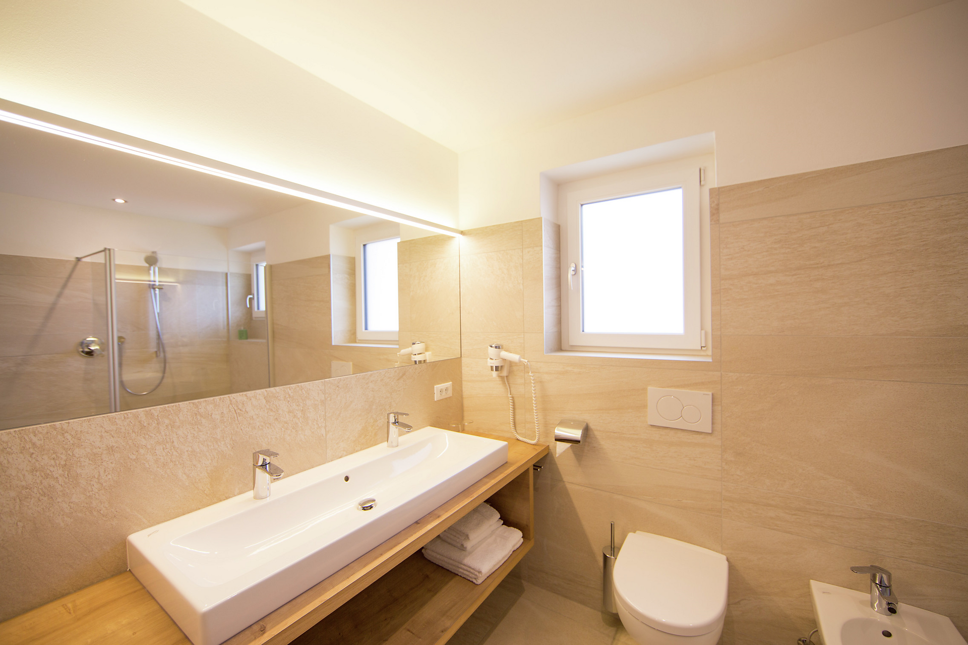 • bagno luminoso con doccia, WC, asciugacapelli e biancheria da bagno