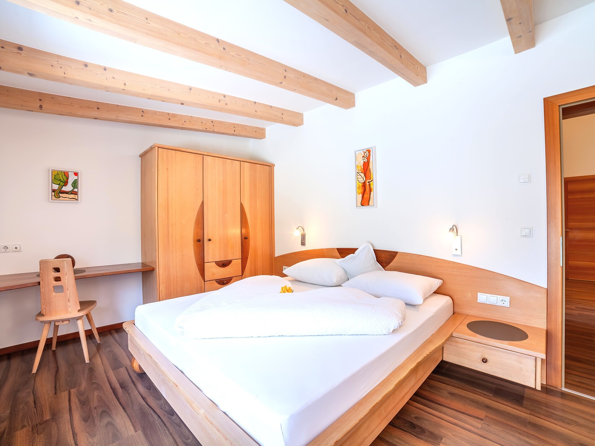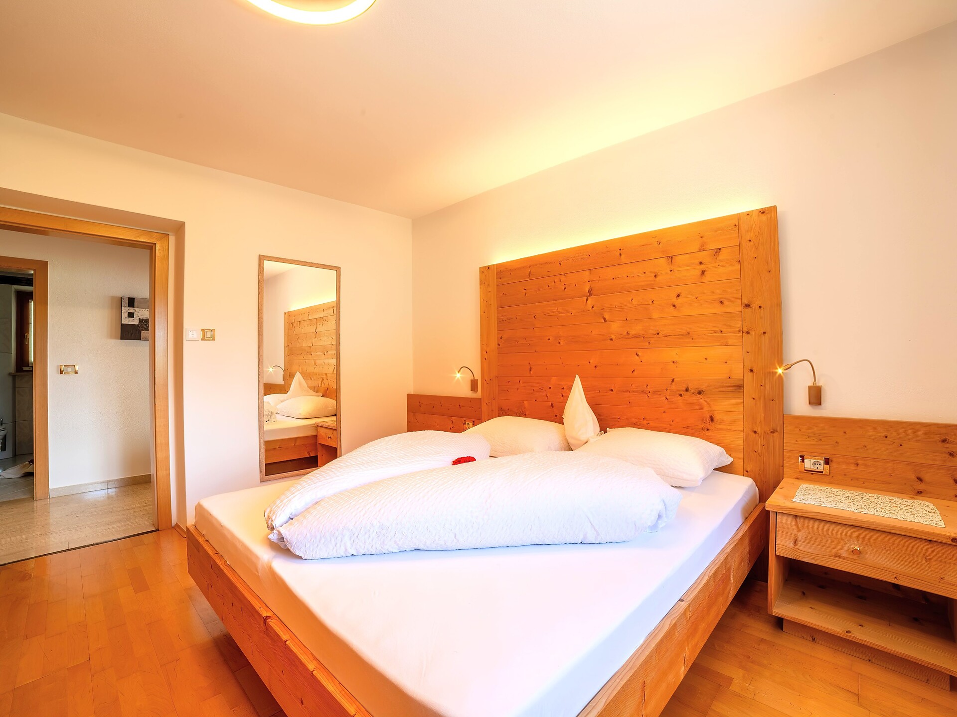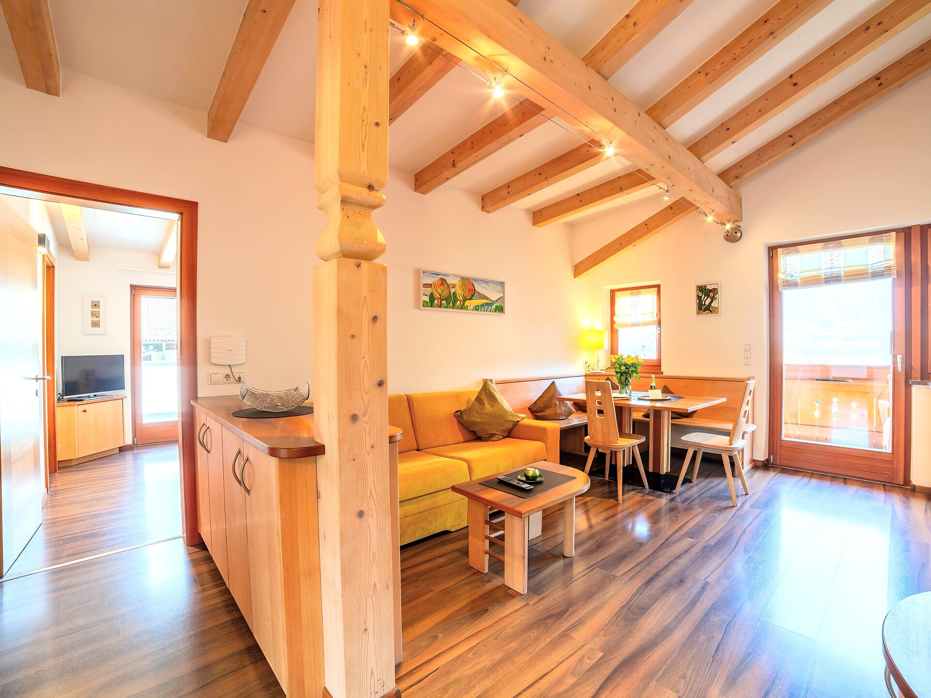 Situato al secondo piano, l’Appartamento 3° combina abitabilità confortevole e fascino naturale. Gli arredi in legno naturale e i due balconi esposti a sud e sud-est offrono splendide viste sulle montagne e molta luce – ideali per momenti di relax e sole in qualsiasi momento della giornata.