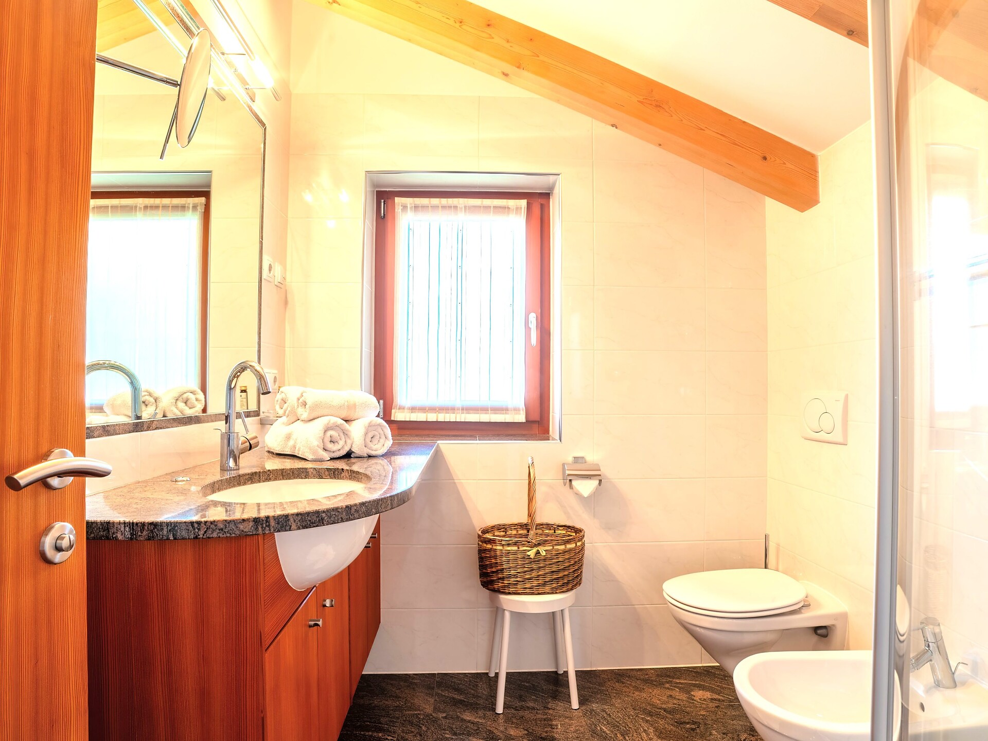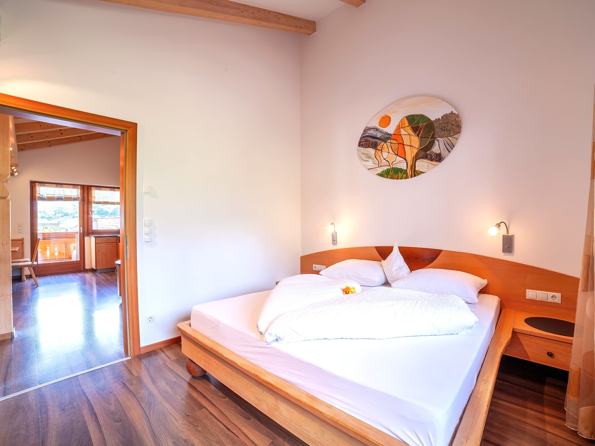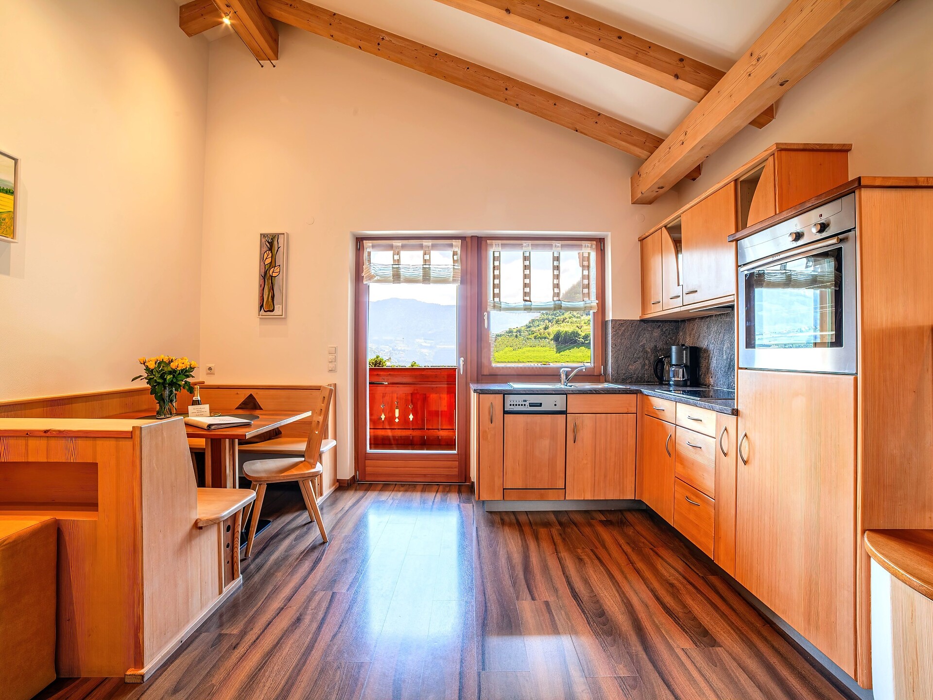 Situato al secondo piano, l’Appartamento 3° combina abitabilità confortevole e fascino naturale. Gli arredi in legno naturale e i due balconi esposti a sud e sud-est offrono splendide viste sulle montagne e molta luce – ideali per momenti di relax e sole in qualsiasi momento della giornata.