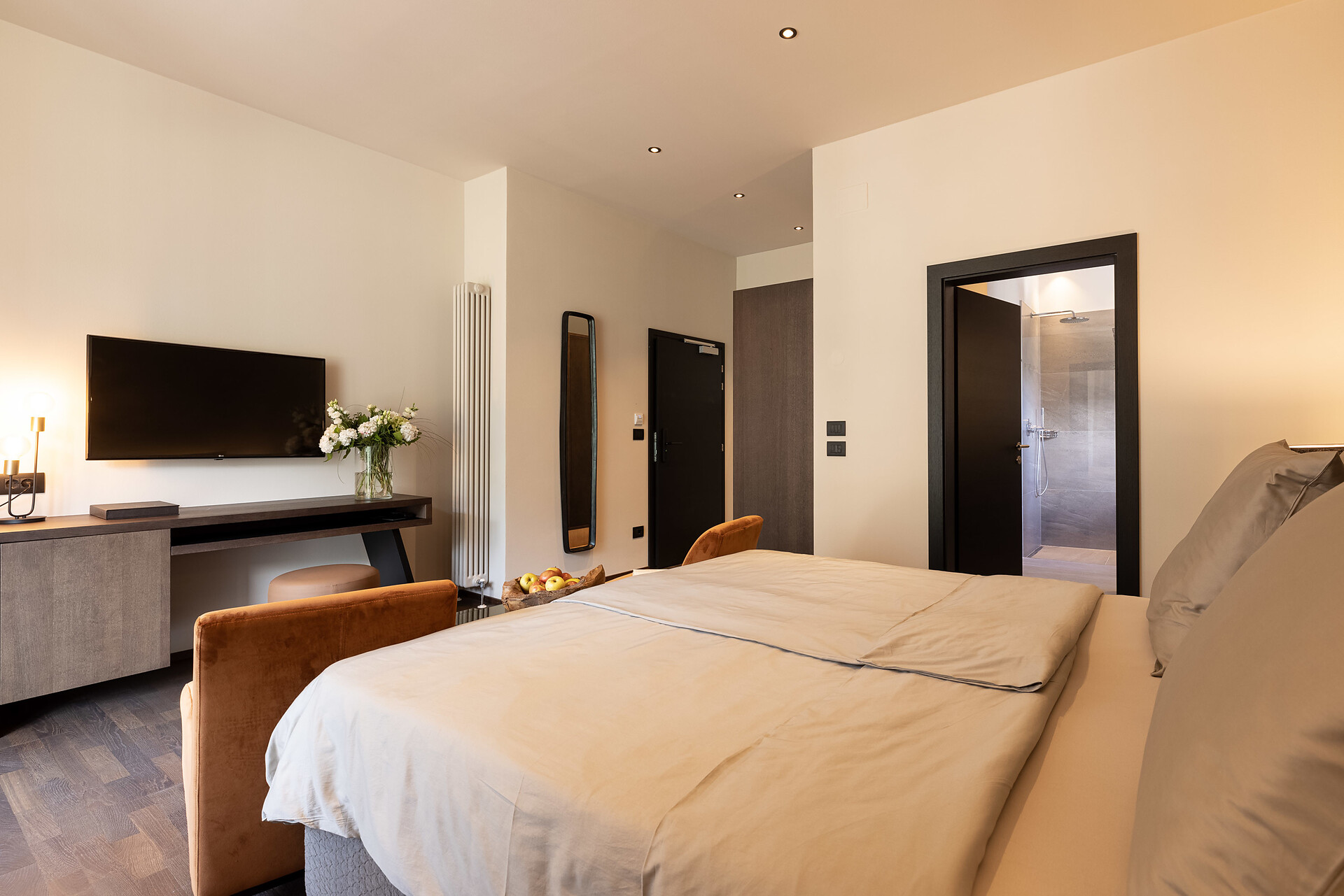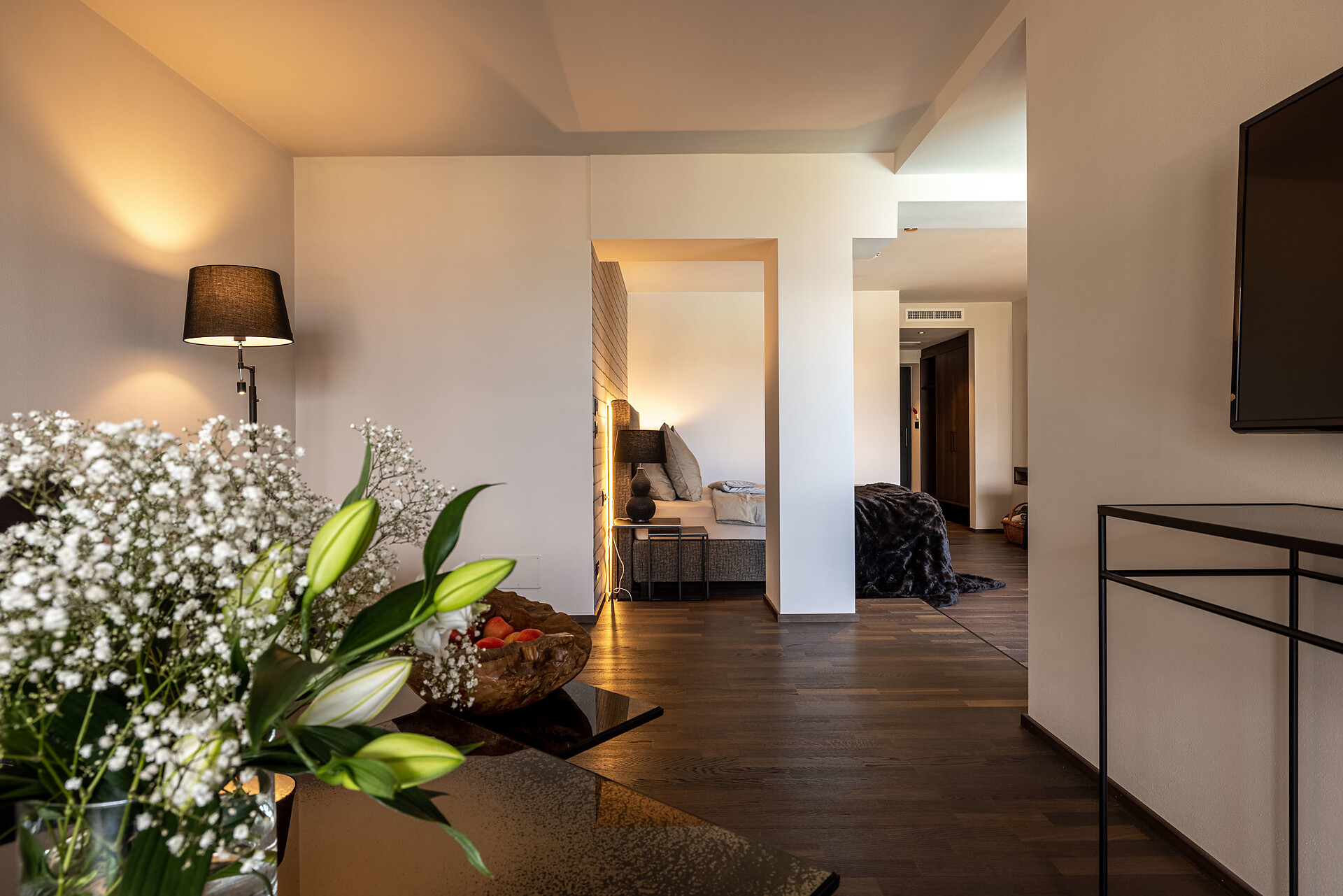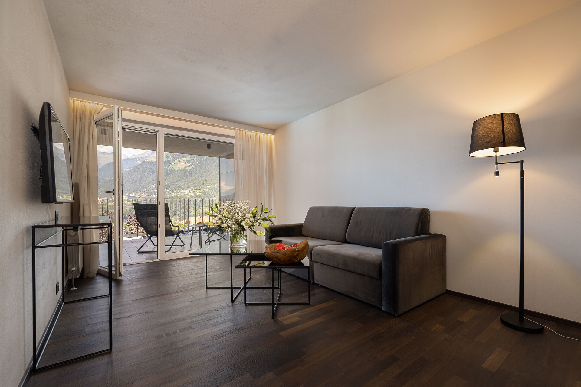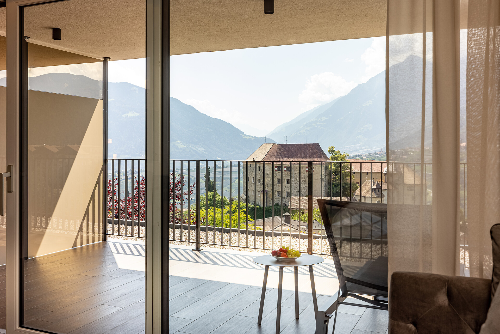 Suite Exclusiv "Königschwan" 45m² con Terrazza 30m². Suite monolocale con letto matrimoniale + divano letto. Vista: Scena e Merano Terrazza esposta a Sudovest con vasca idromassaggi Allestimento: bagno con doccia, asciugacapelli, cassaforte, TV satellitare, telefono, frigorifero, minibar, WiFi.