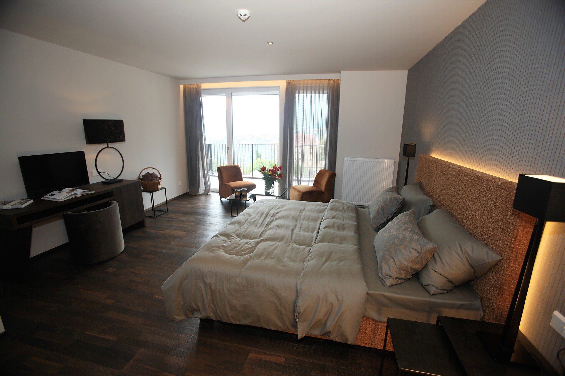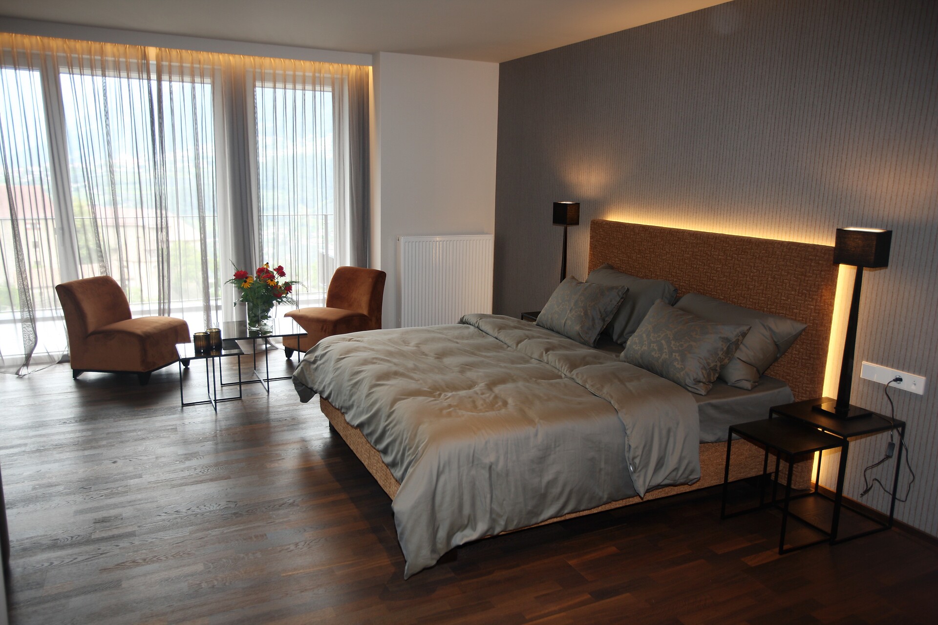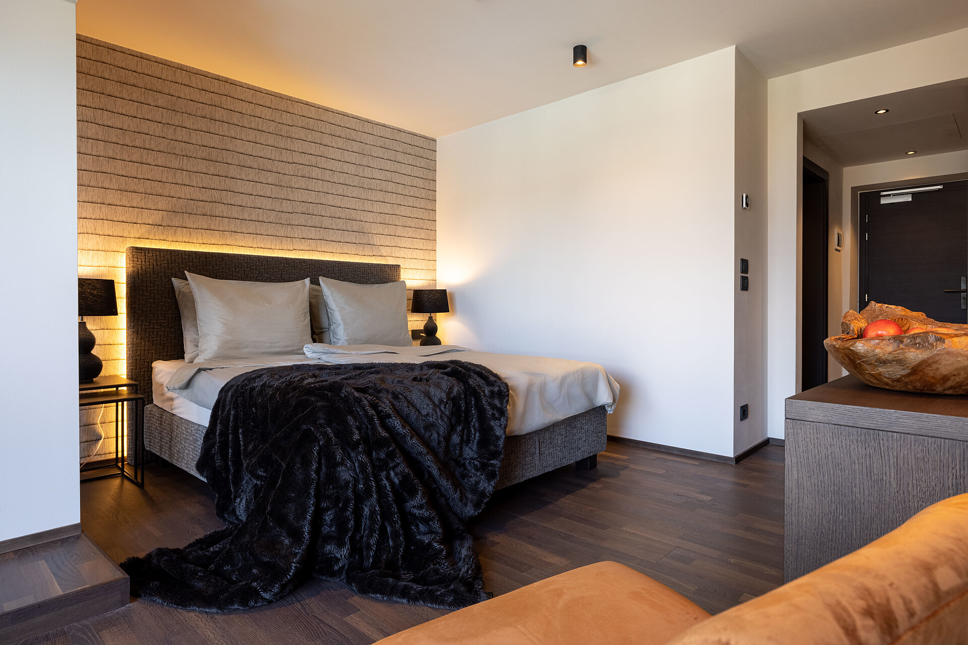 Suite Exclusiv "Königschwan" 45m² con Terrazza 30m². Suite monolocale con letto matrimoniale + divano letto. Vista: Scena e Merano Terrazza esposta a Sudovest con vasca idromassaggi Allestimento: bagno con doccia, asciugacapelli, cassaforte, TV satellitare, telefono, frigorifero, minibar, WiFi.
