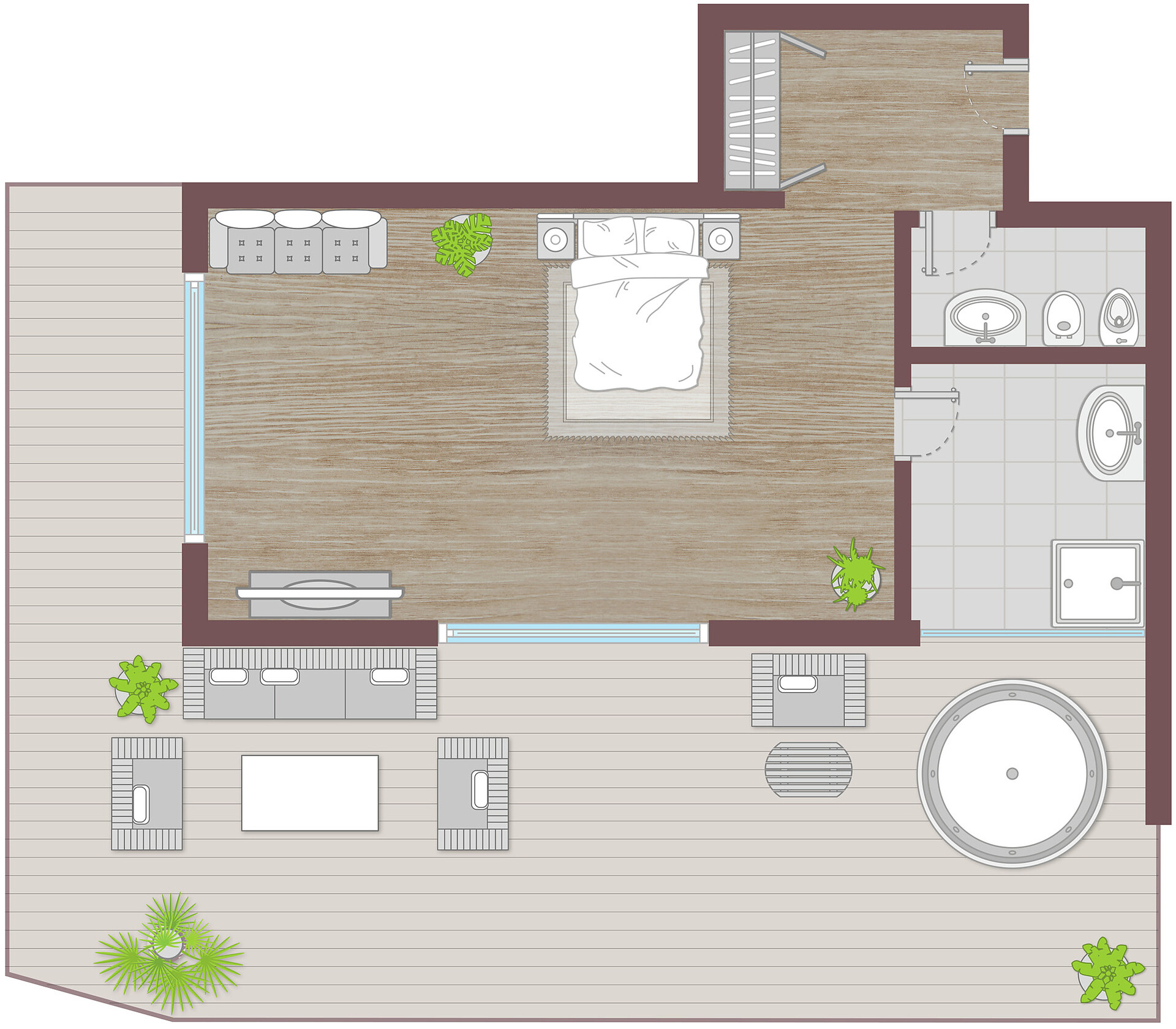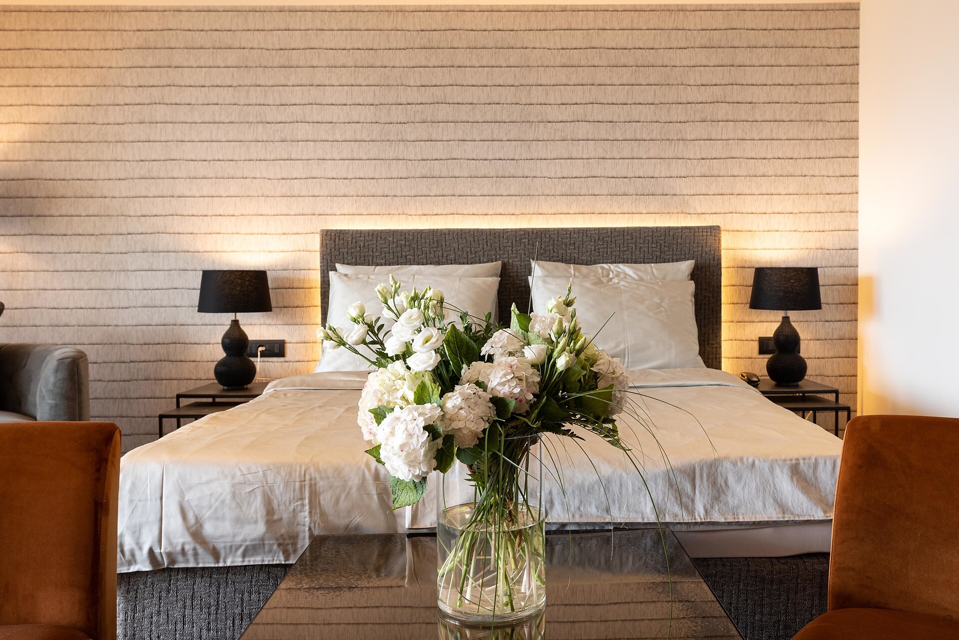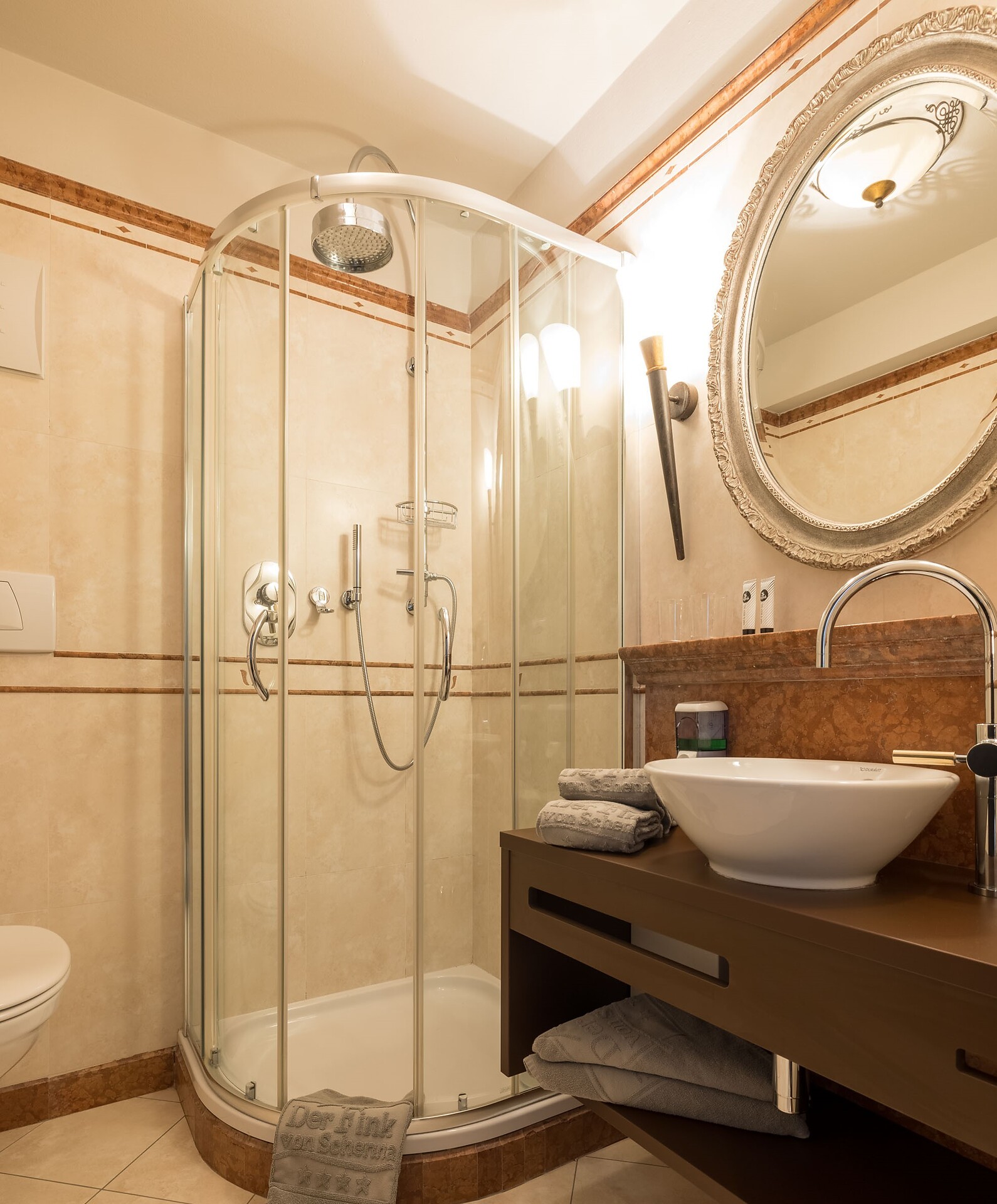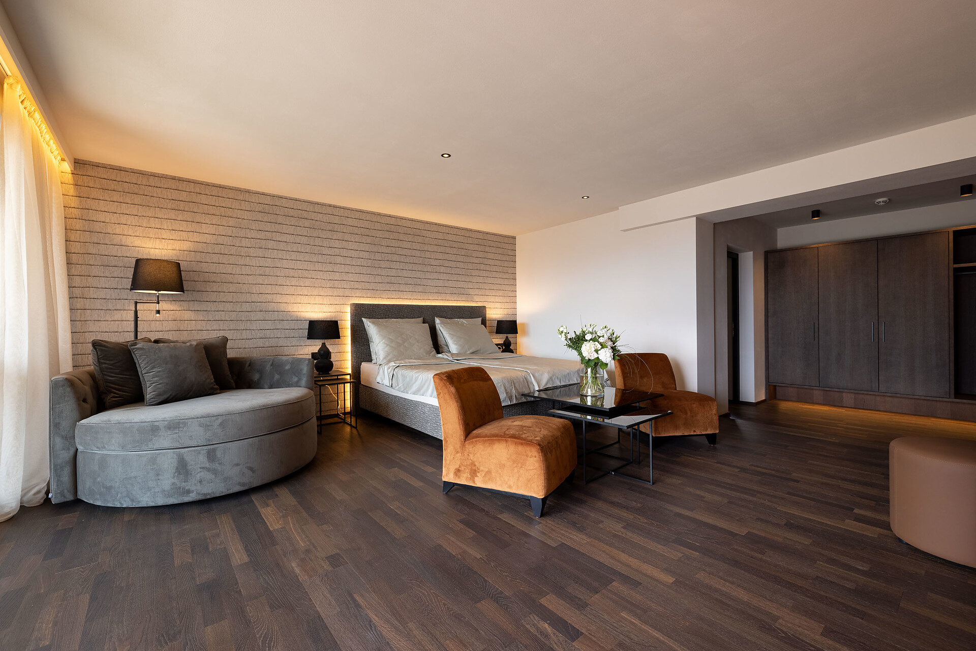 Suite Exclusiv "Königschwan" 45m² con Terrazza 30m². Suite monolocale con letto matrimoniale + divano letto. Vista: Scena e Merano Terrazza esposta a Sudovest con vasca idromassaggi Allestimento: bagno con doccia, asciugacapelli, cassaforte, TV satellitare, telefono, frigorifero, minibar, WiFi.