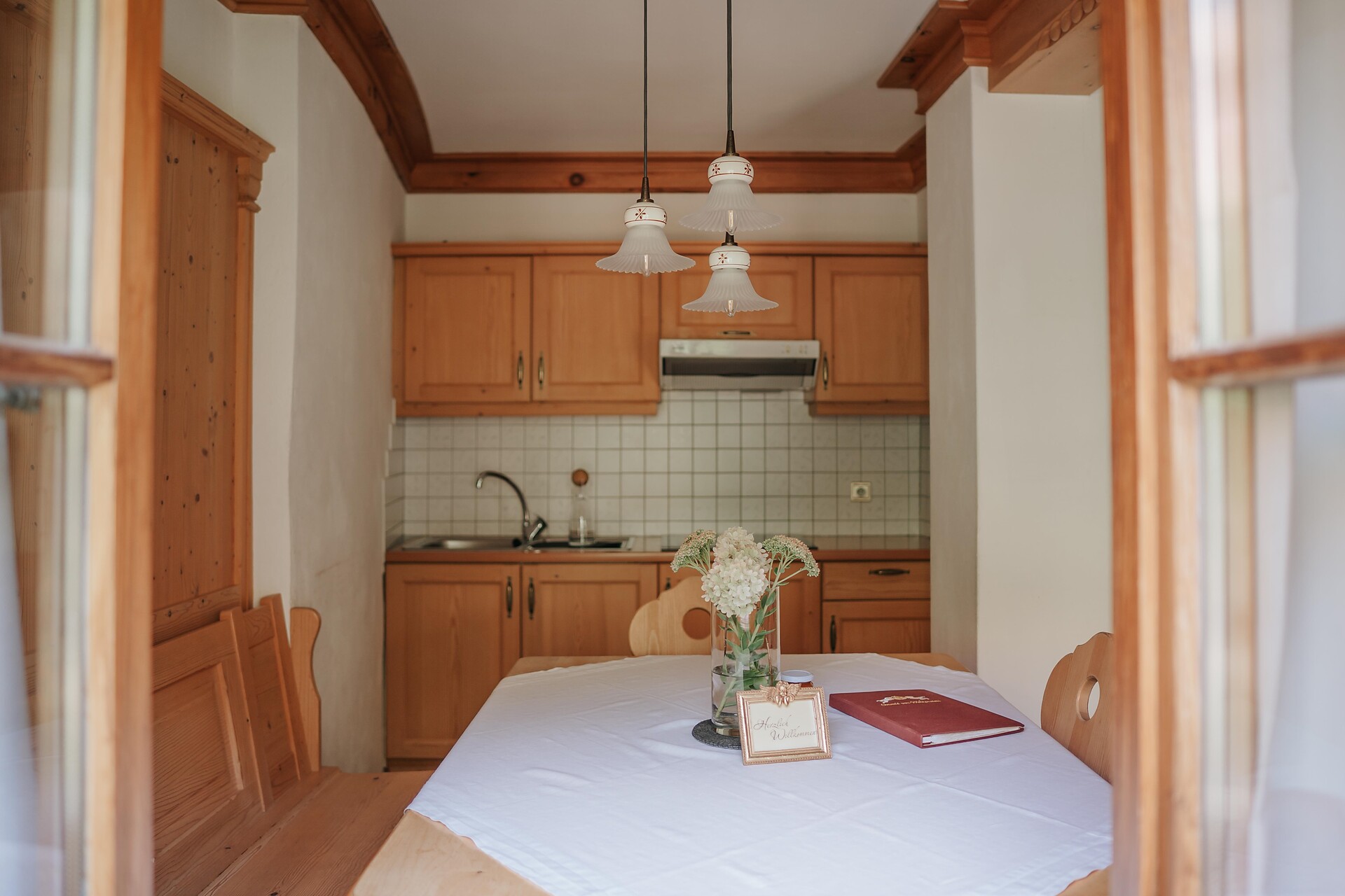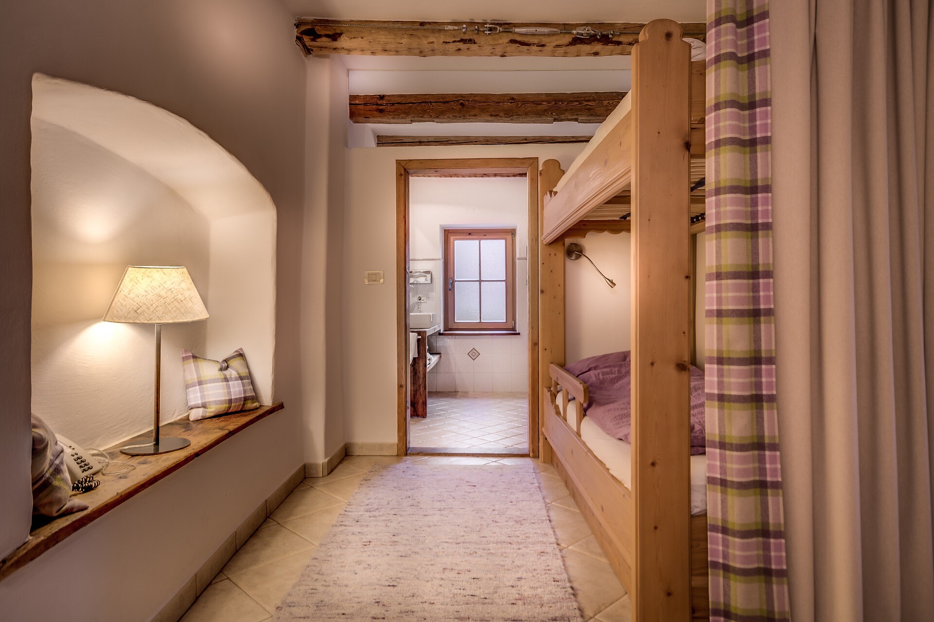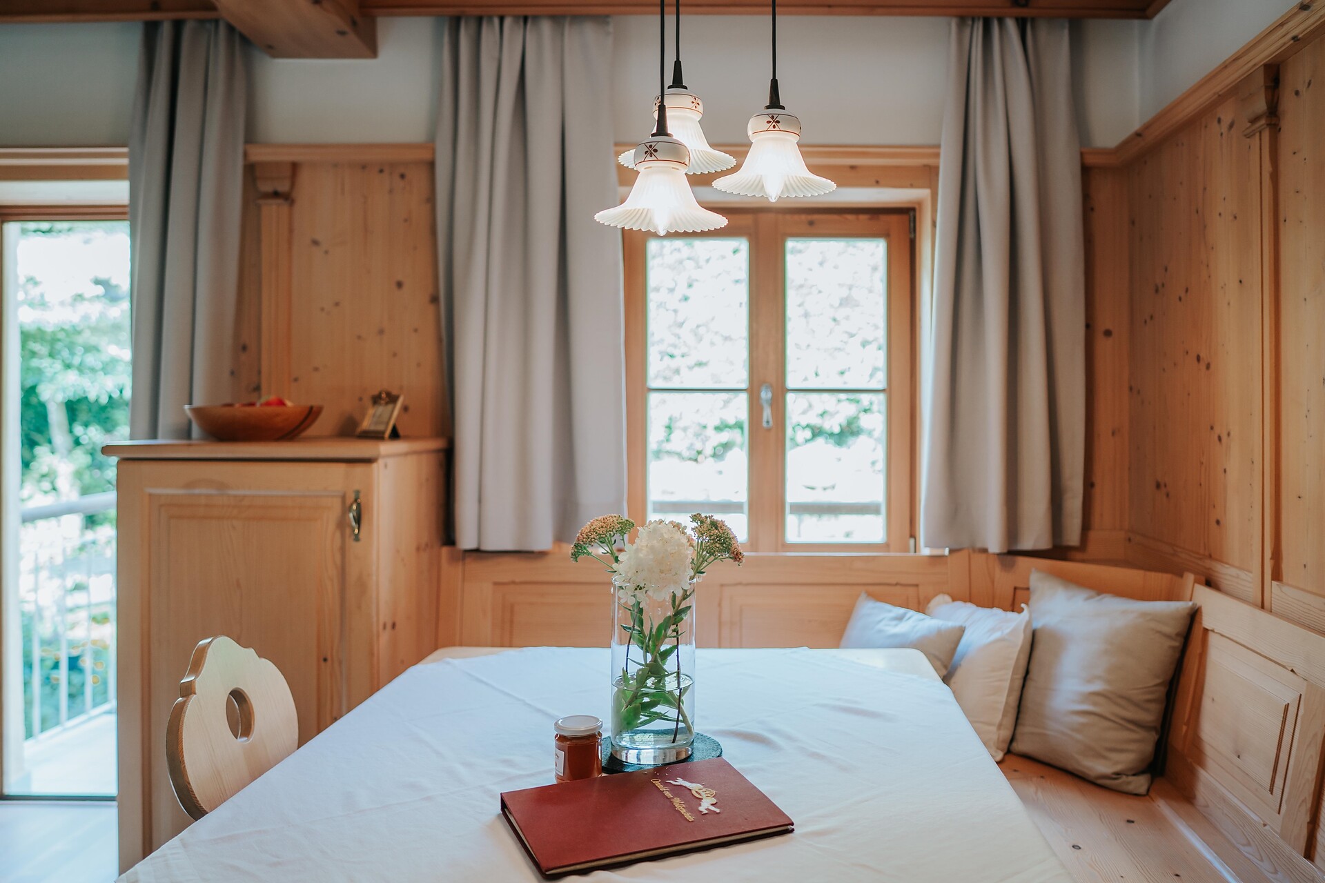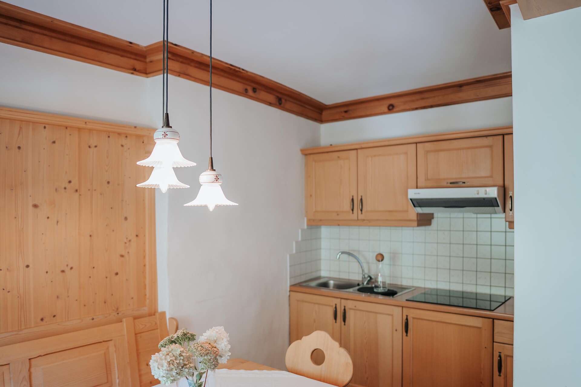 Accogliente appartamento vacanze in stile alpino moderno: cucina-soggiorno in rovere massiccio con lavastoviglie, stufa a legna e comodo divano in pelle. Camera matrimoniale arredata con mobili contadini restaurati, letto a castello nel vano d’ingresso. Ampio bagno con doccia, bidet e WC – l’ideale per una vacanza rigenerante in famiglia.