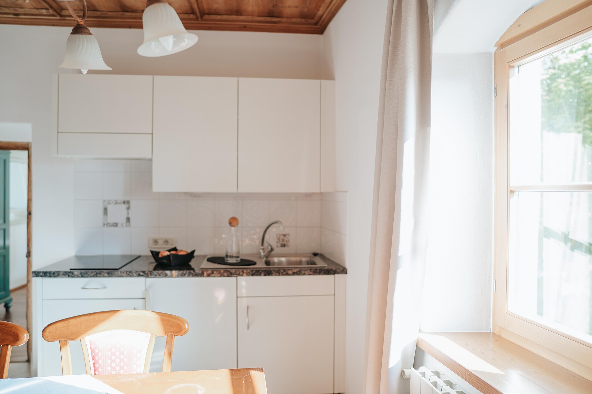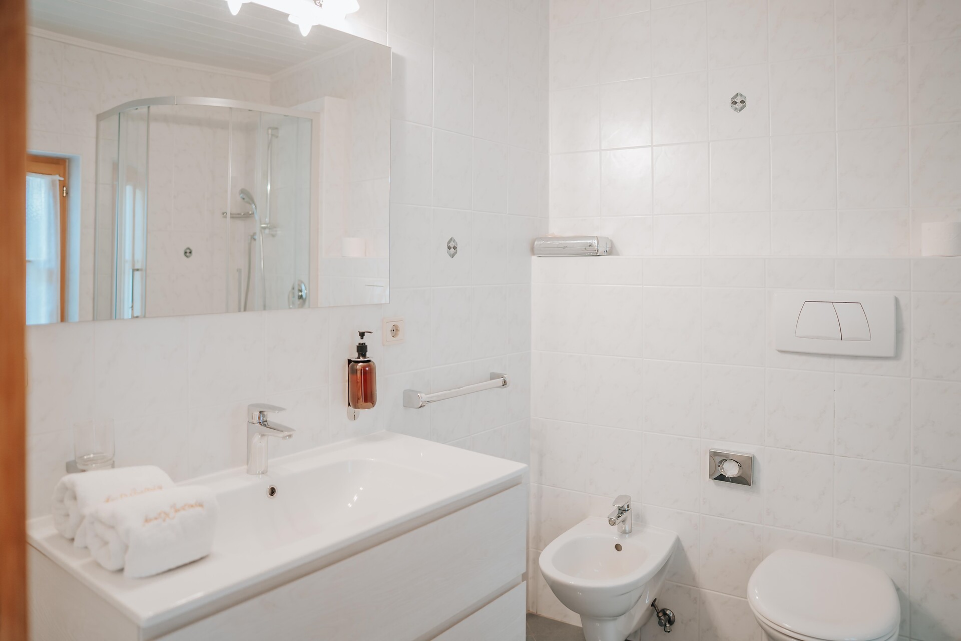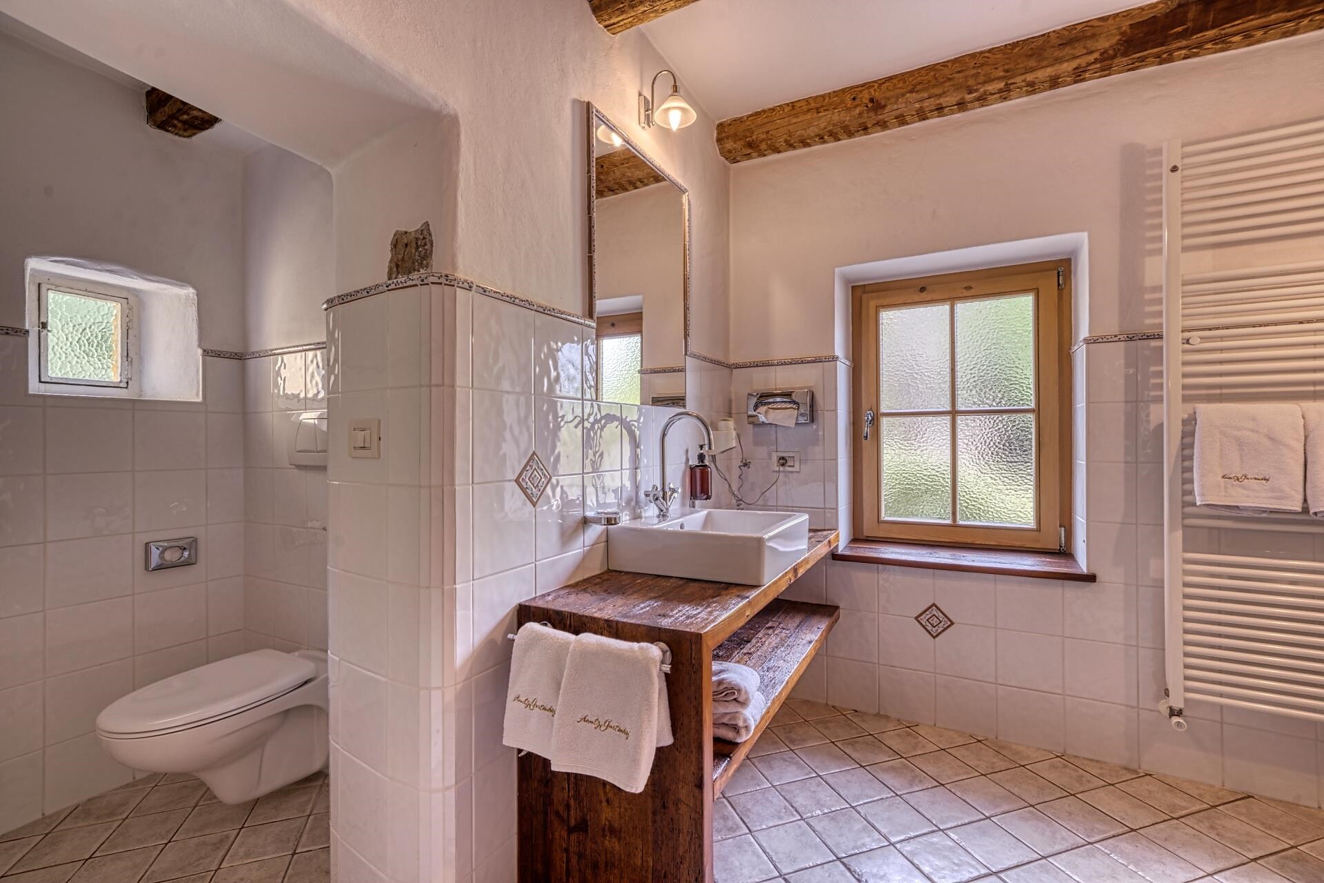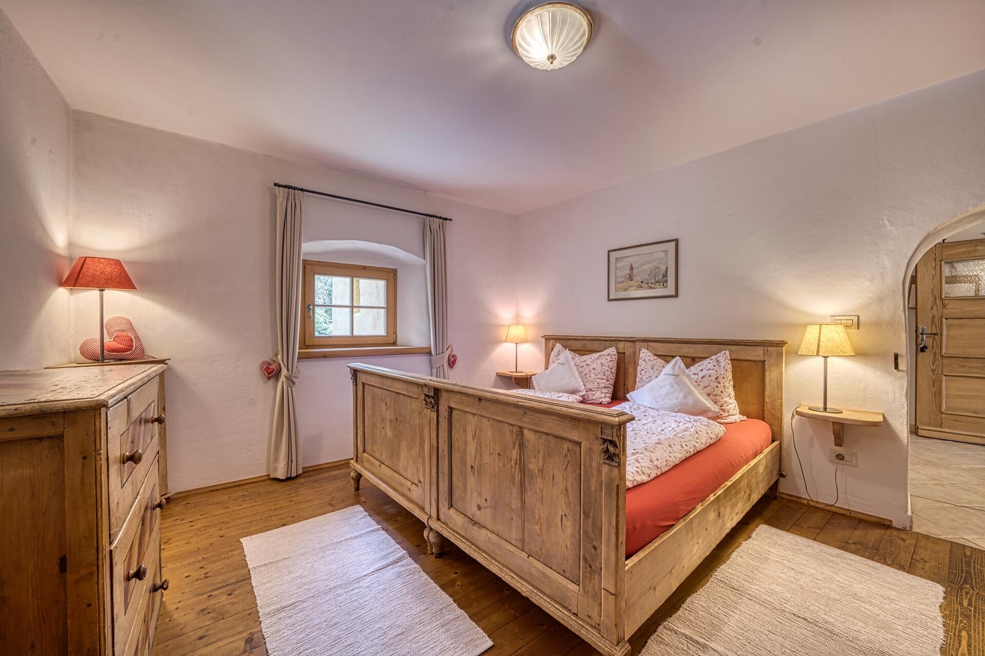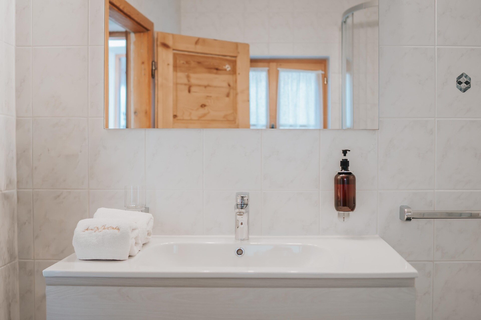 Accogliente appartamento vacanze in stile alpino moderno: cucina-soggiorno in rovere massiccio con lavastoviglie, stufa a legna e comodo divano in pelle. Camera matrimoniale arredata con mobili contadini restaurati, letto a castello nel vano d’ingresso. Ampio bagno con doccia, bidet e WC – l’ideale per una vacanza rigenerante in famiglia.