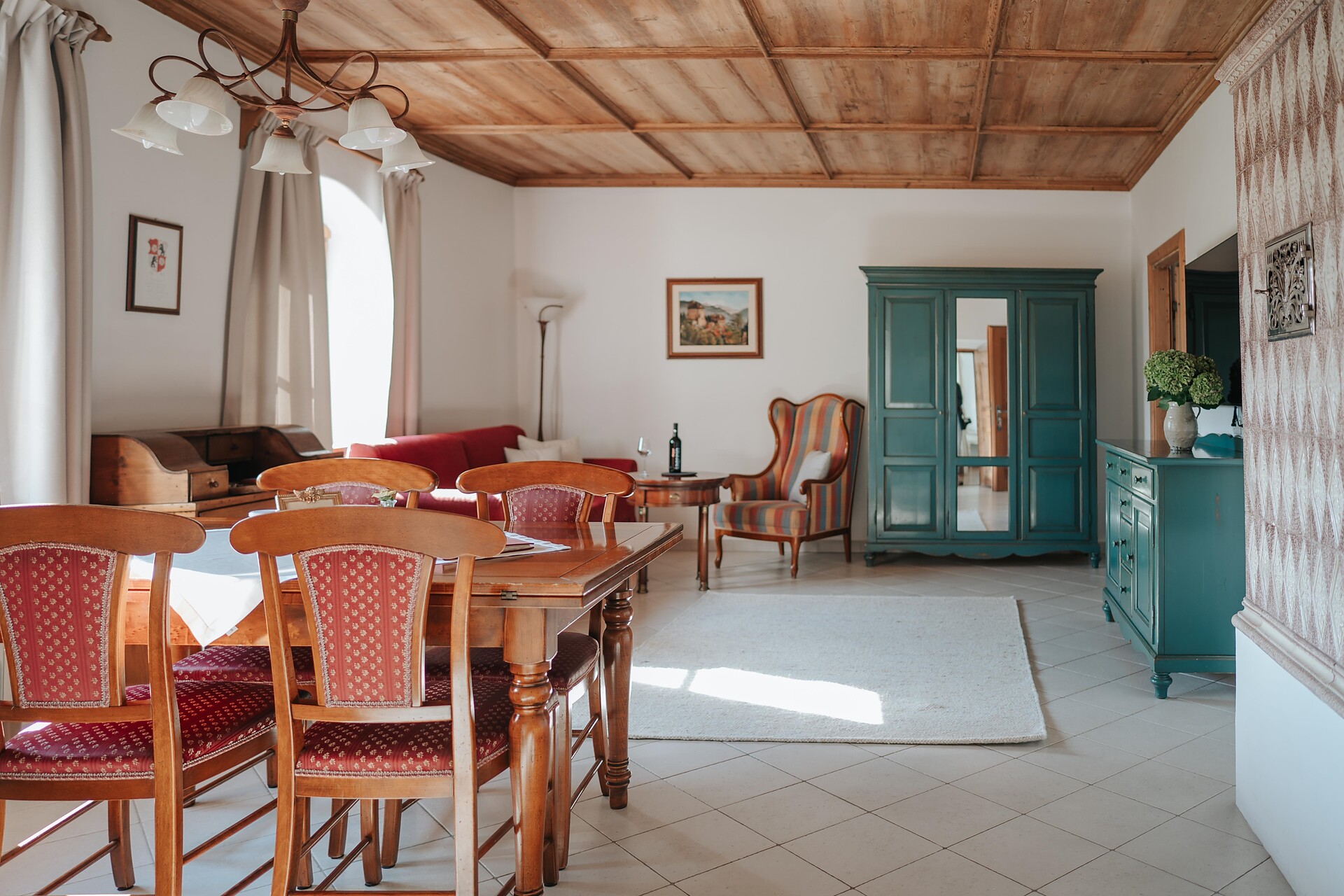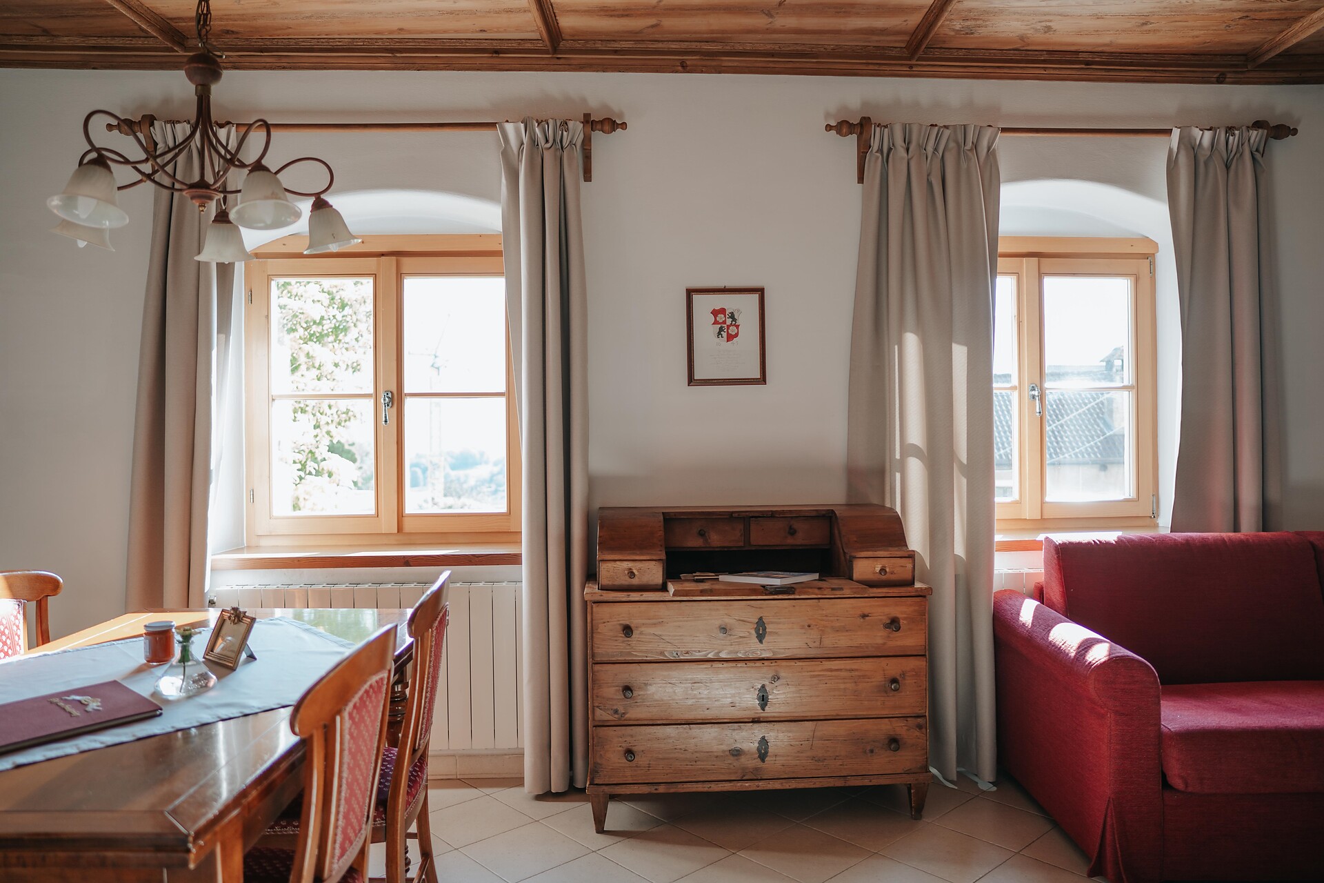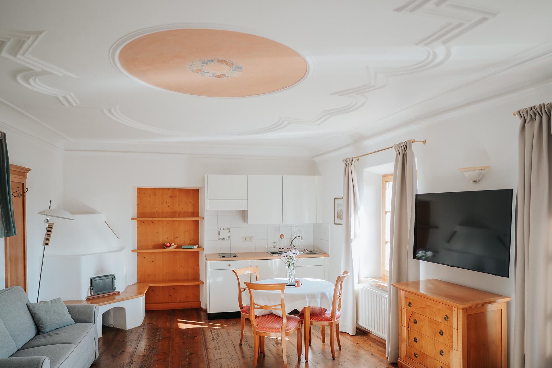 Romantico soggiorno-camera con soffitto a stucchi, mobili Biedermeier e stufa in maiolica. Dotato di letto comodo, divano accogliente, angolo cottura ben attrezzato e zona pranzo. Il bagno moderno con doccia, bidet e WC unisce il fascino storico al comfort contemporaneo.