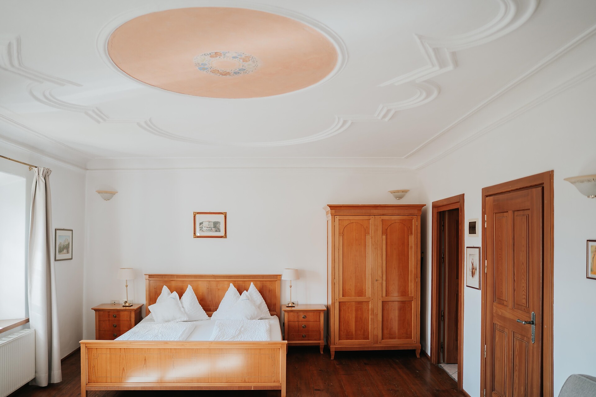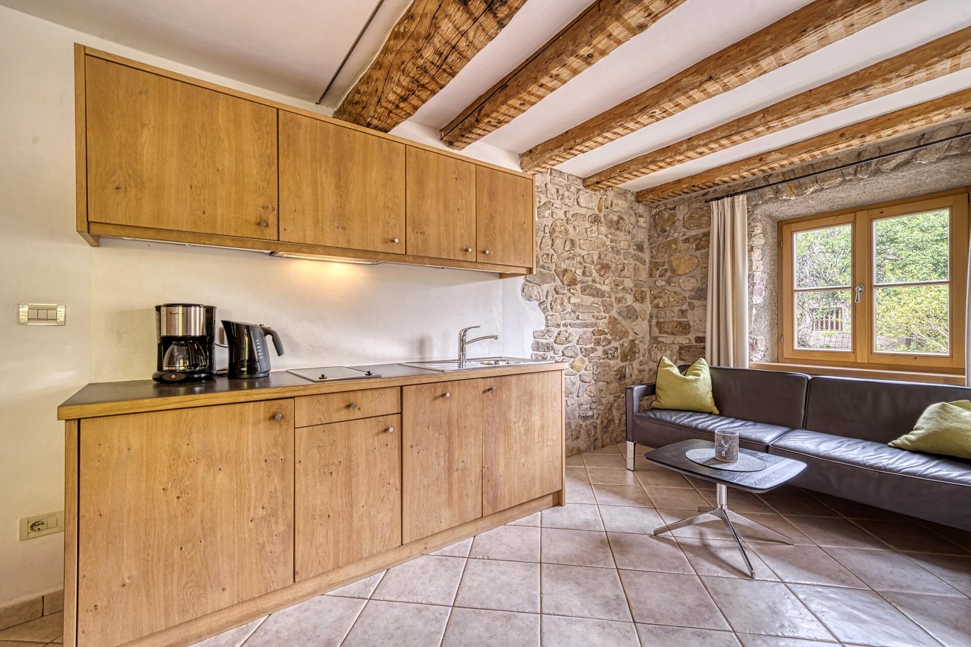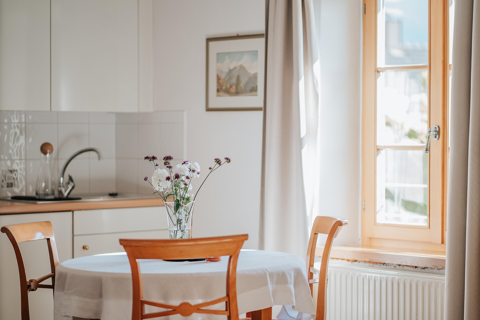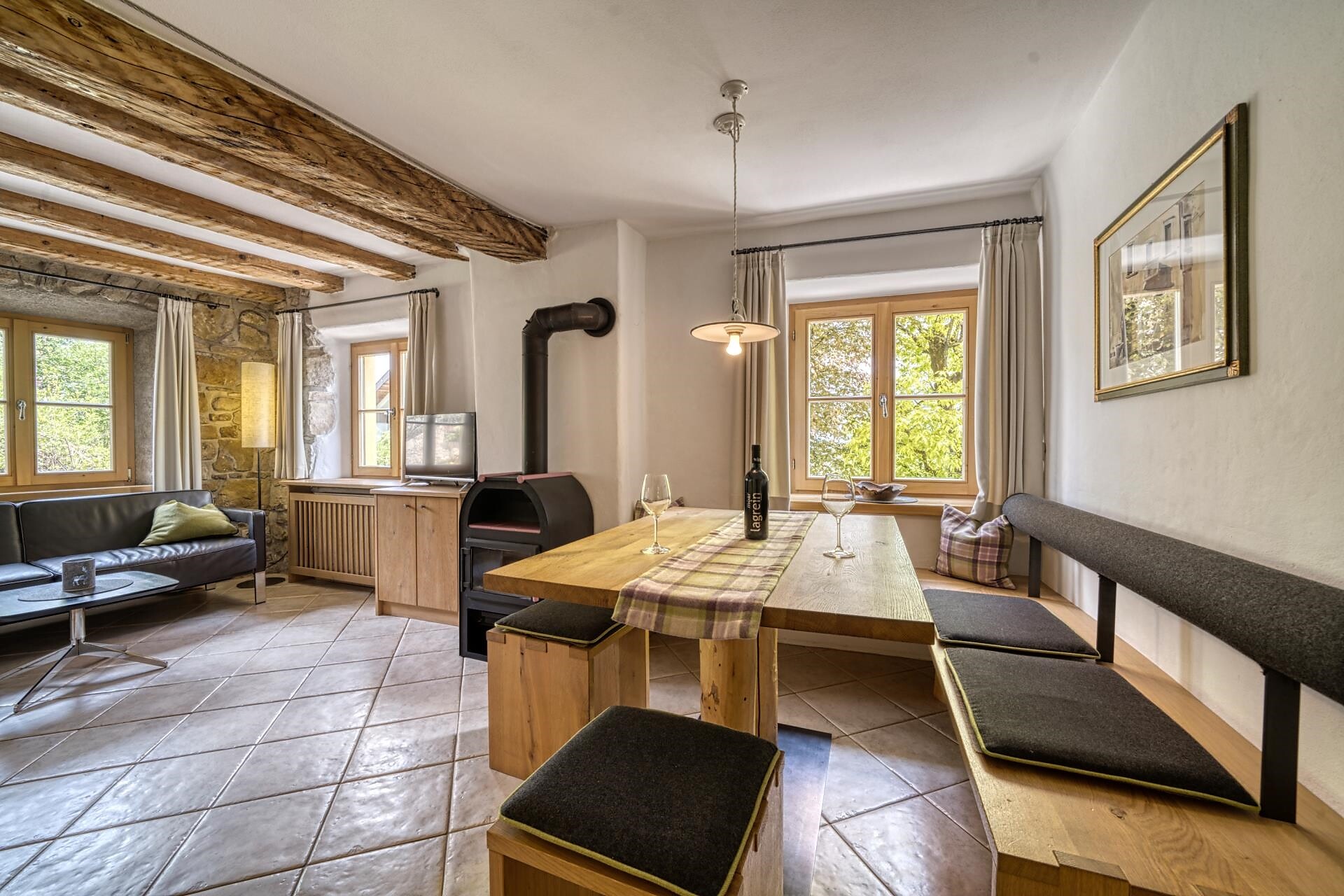Romantico soggiorno-camera con soffitto a stucchi, mobili Biedermeier e stufa in maiolica. Dotato di letto comodo, divano accogliente, angolo cottura ben attrezzato e zona pranzo. Il bagno moderno con doccia, bidet e WC unisce il fascino storico al comfort contemporaneo.
